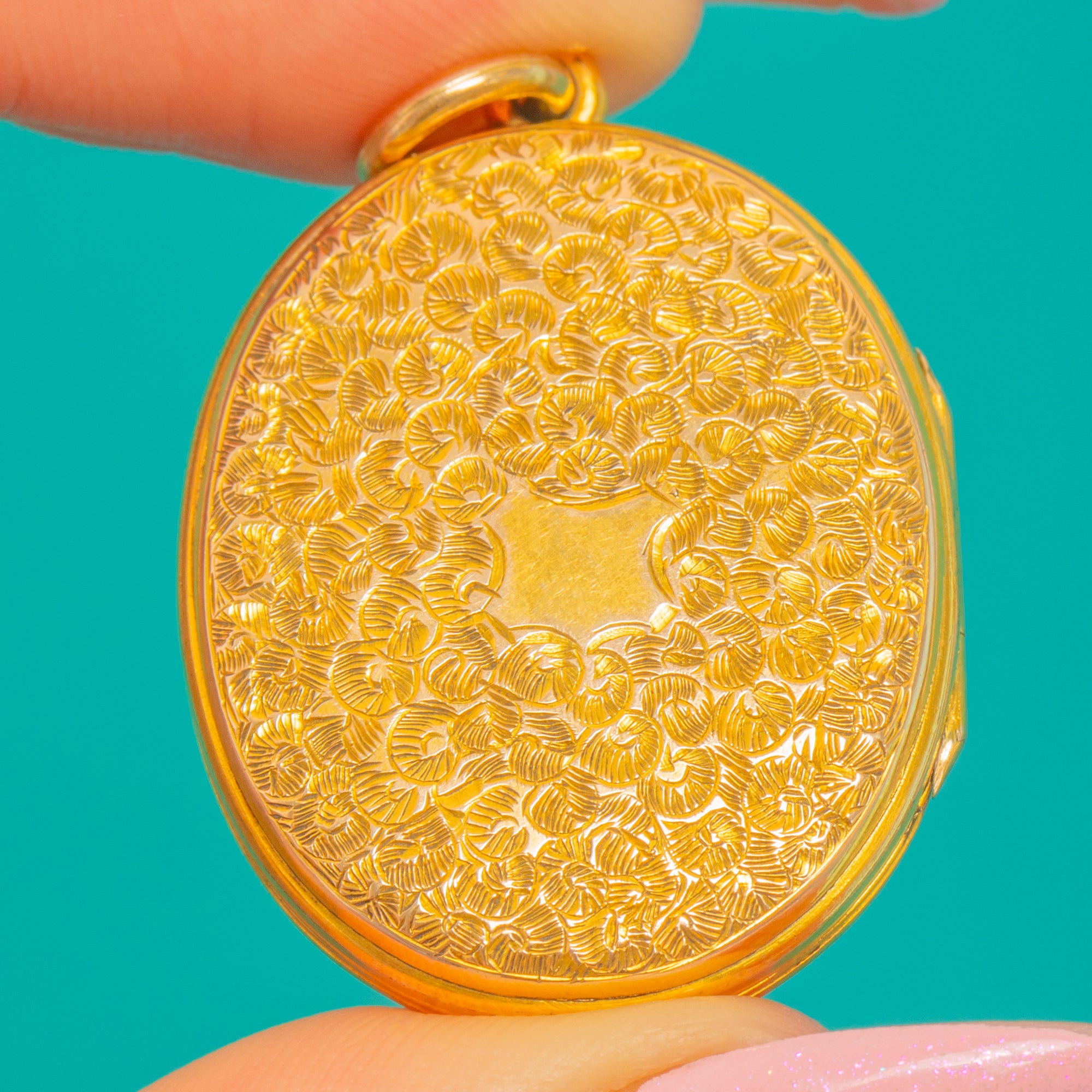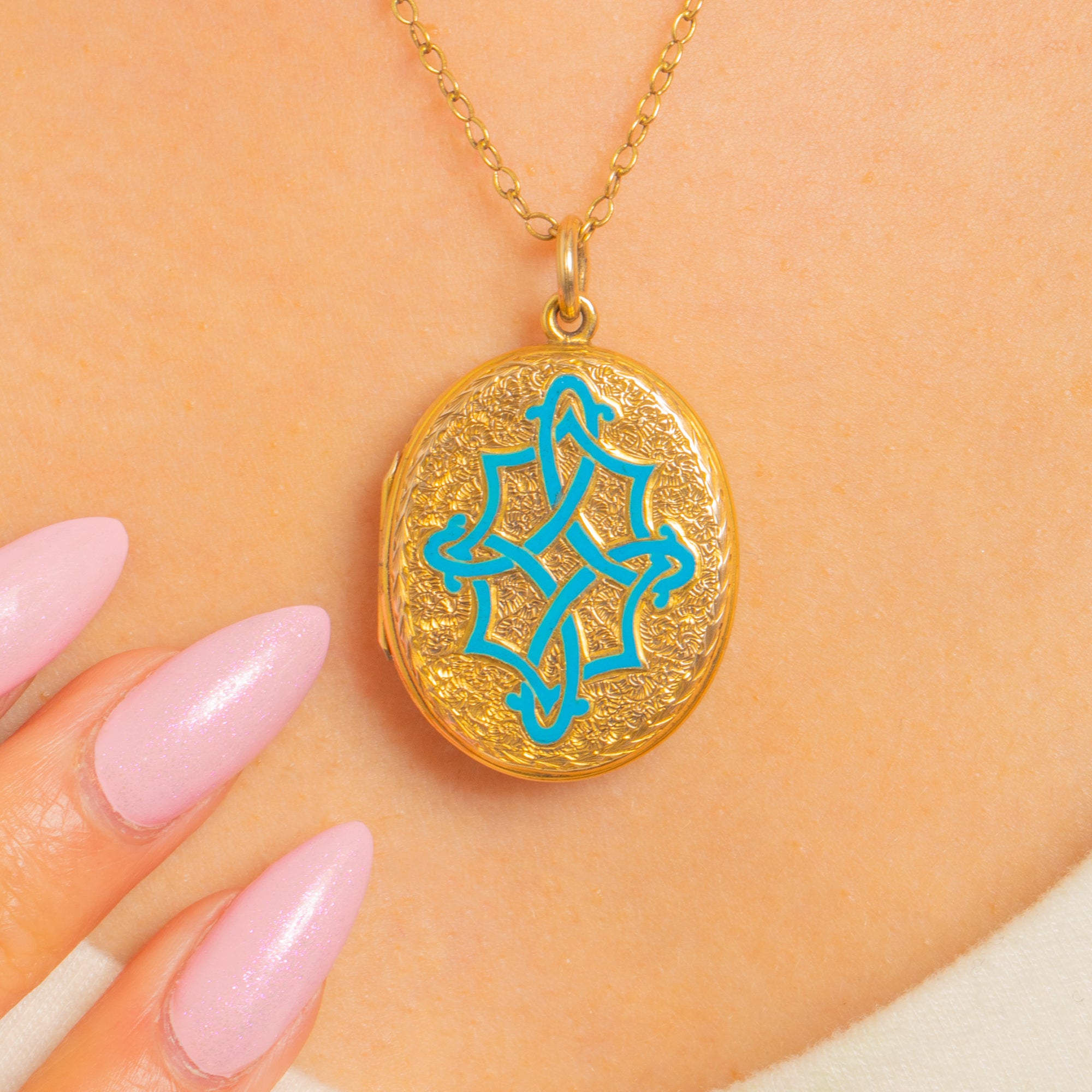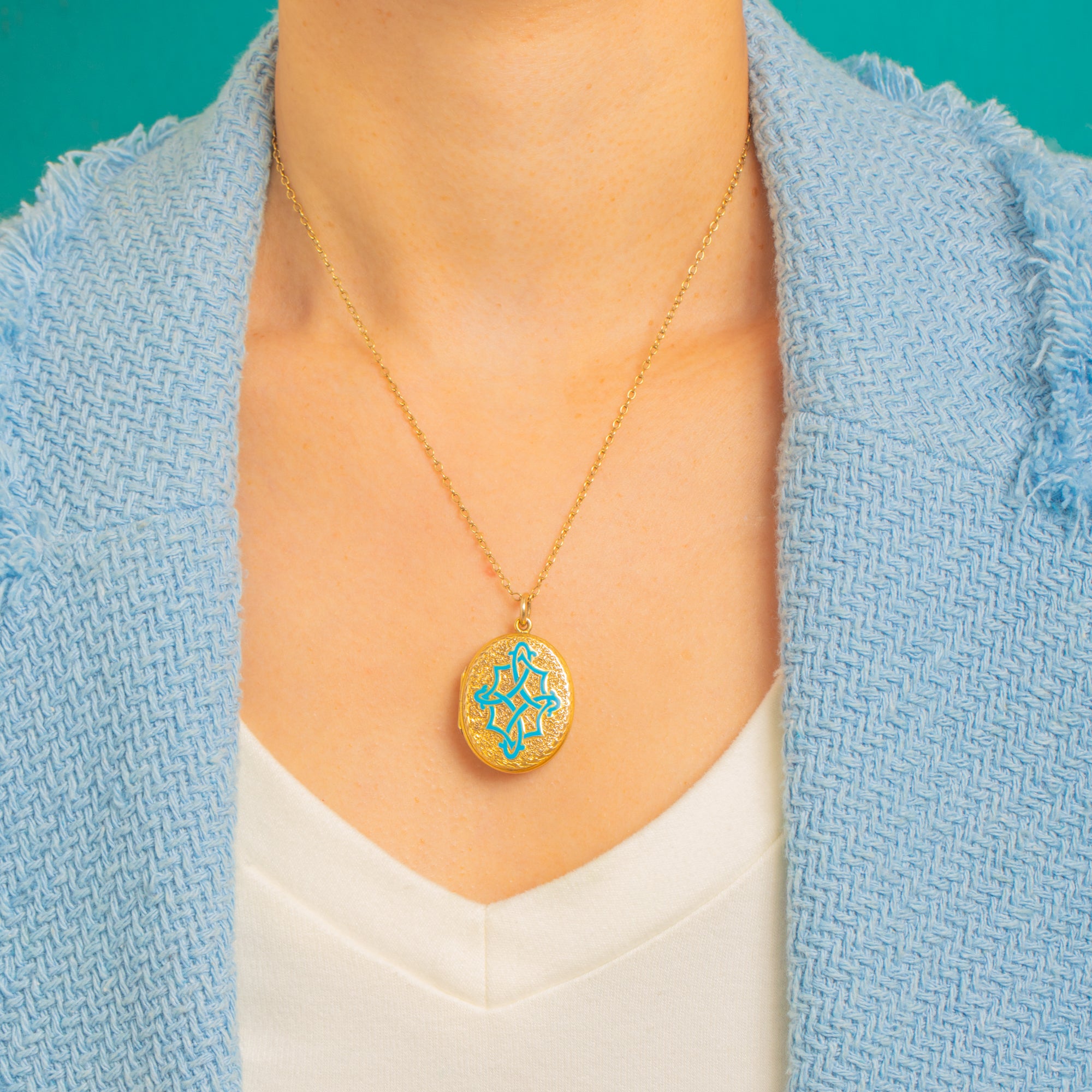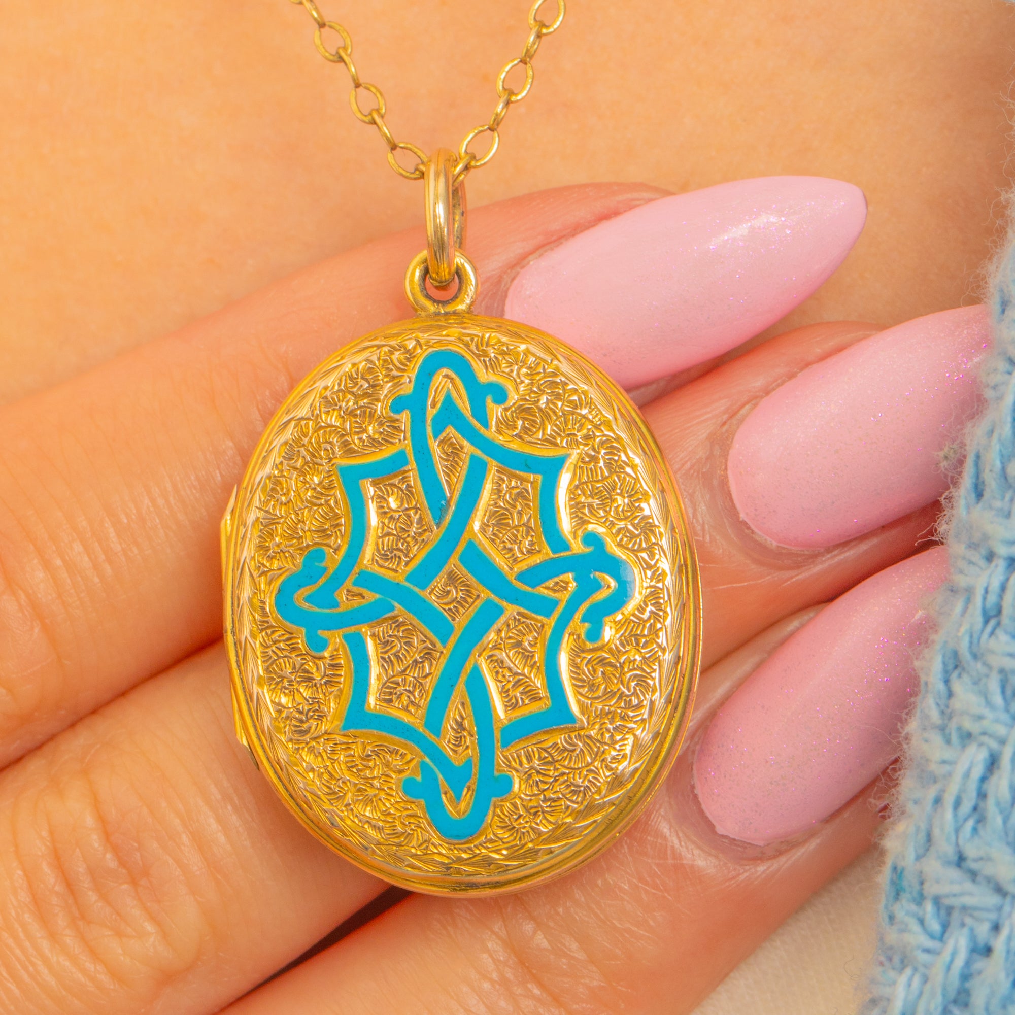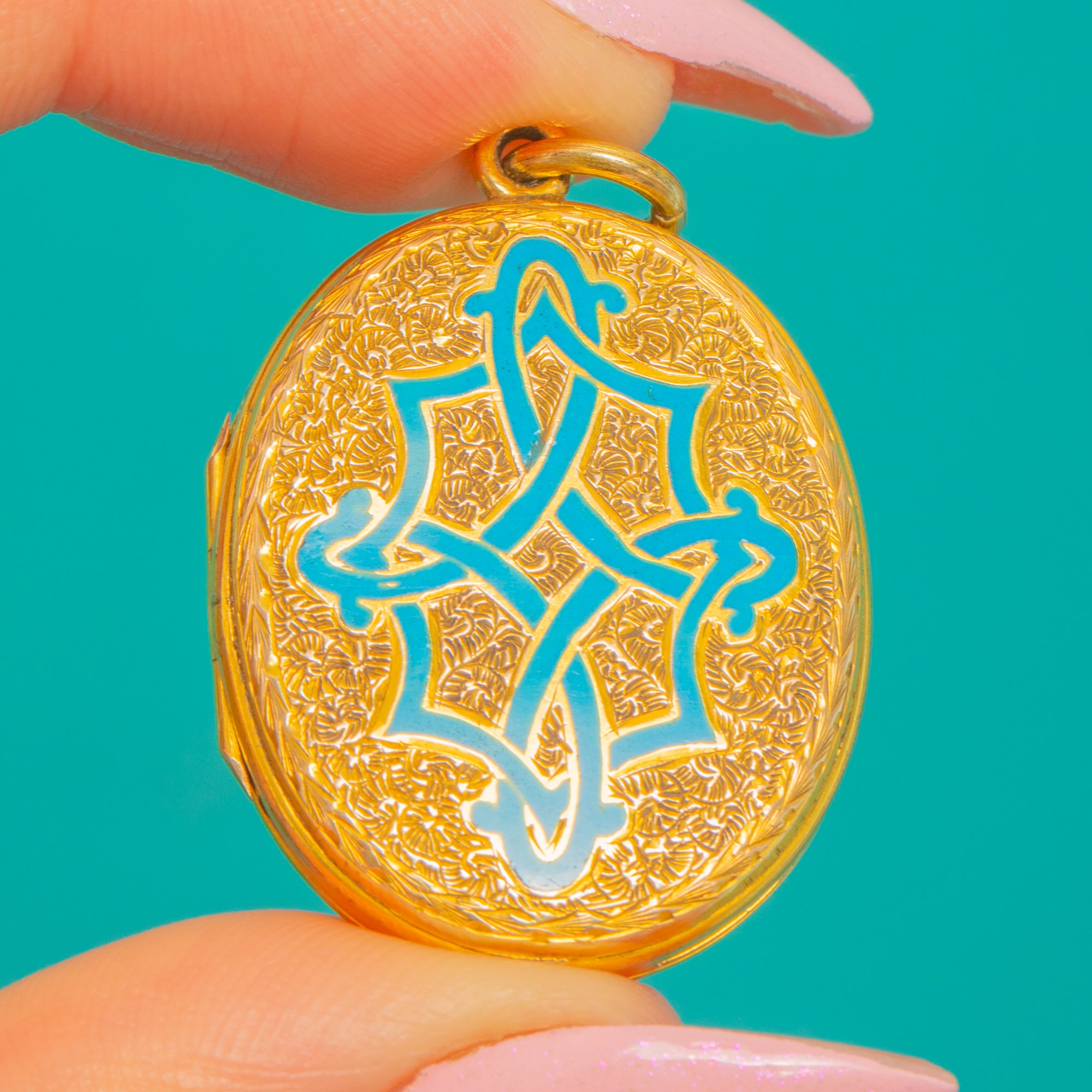 Rich with Victorian romance, this oval locket is crafted in 9ct Gold and glazed with a vivid turquoise Enamel Celtic knot, its interlaced lines raised over a finely engine-turned floral ground. The play of glossy Enamel against the warm, detailed Gold gives wonderful depth and texture, from the polished rim to the crisply chased motif.