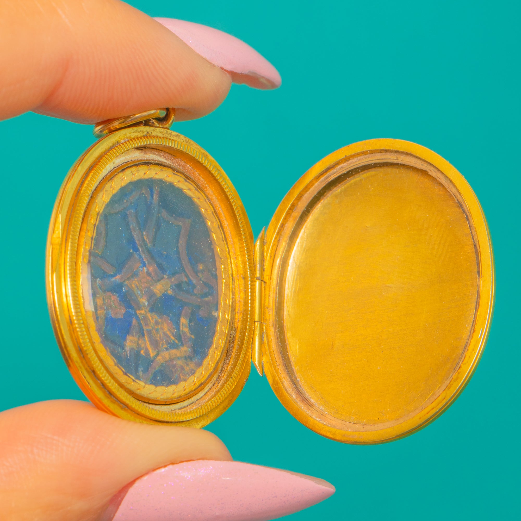VERY GOOD-EXCELLENT: The turquoise Enamel is bright and beautifully intact with only tiny, natural edge wear under magnification. The Gold shows minimal light surface marks to the bail and edges, commensurate with age; the interior shows slight residue and faint darkening near the hinge, not affecting use. The locket closes securely but without an audible click, with no visible repairs or alterations noted.