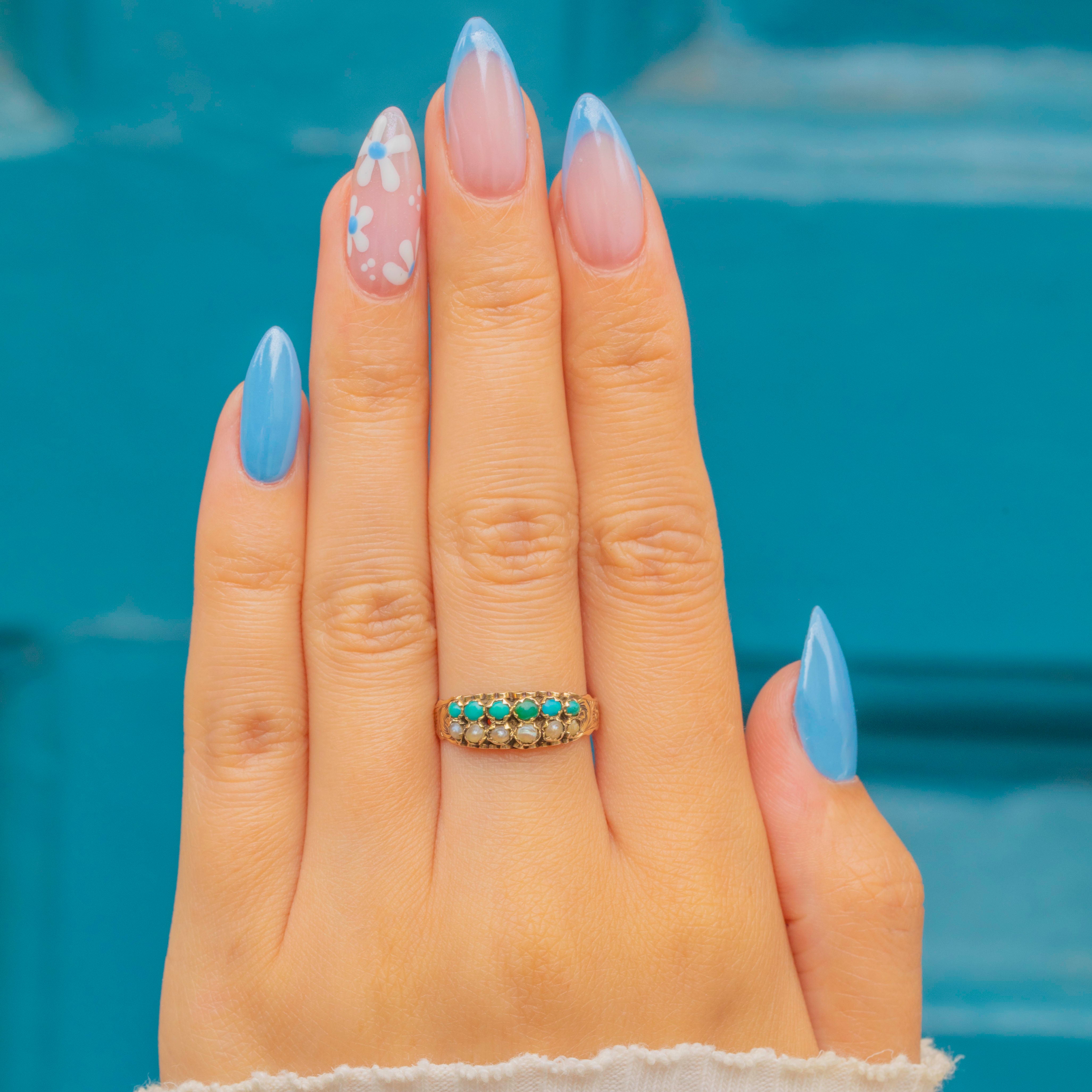 Hallmarked to 1876 with a Birmingham Anchor, this ring has an engraved band and a double row of Turquoise and Pearls.