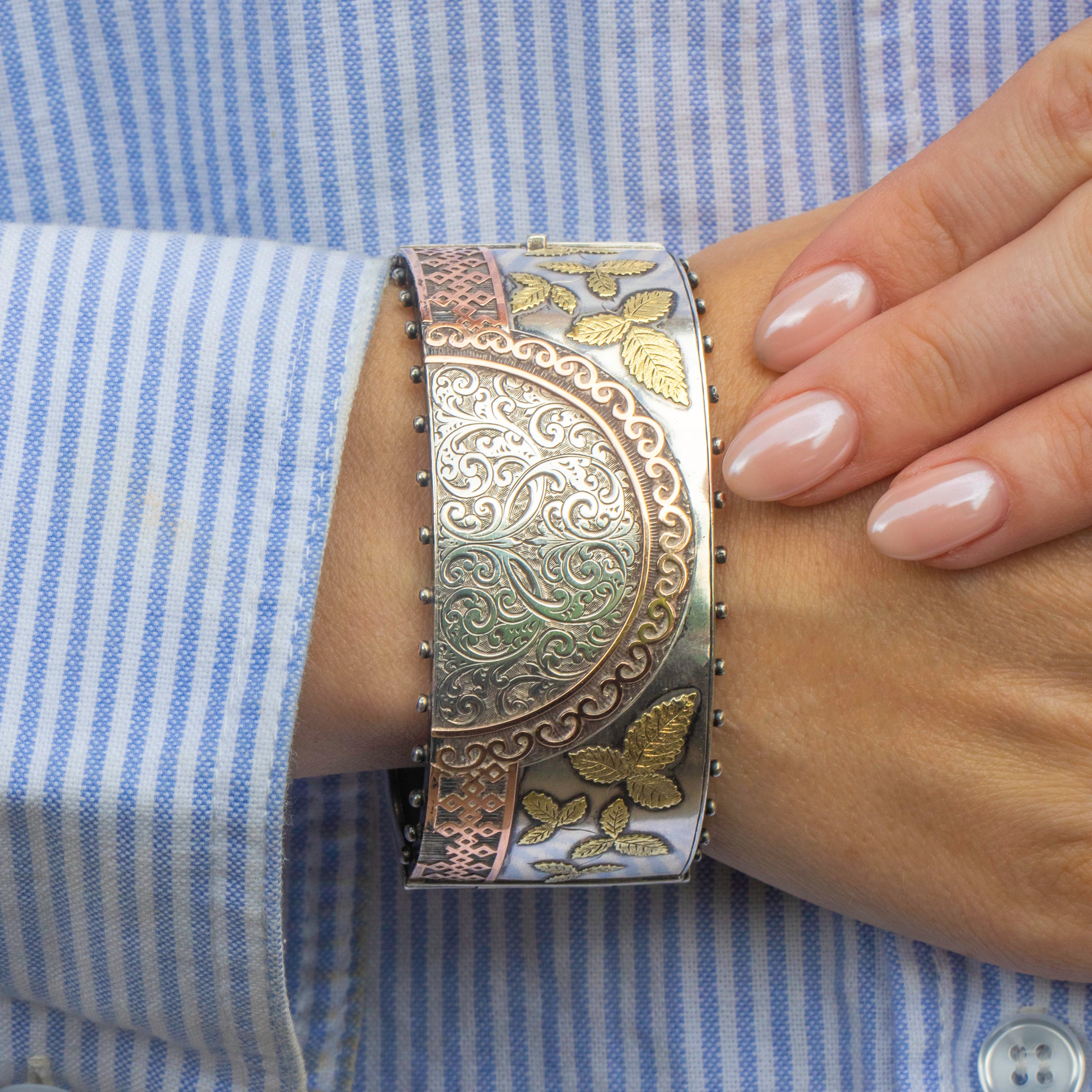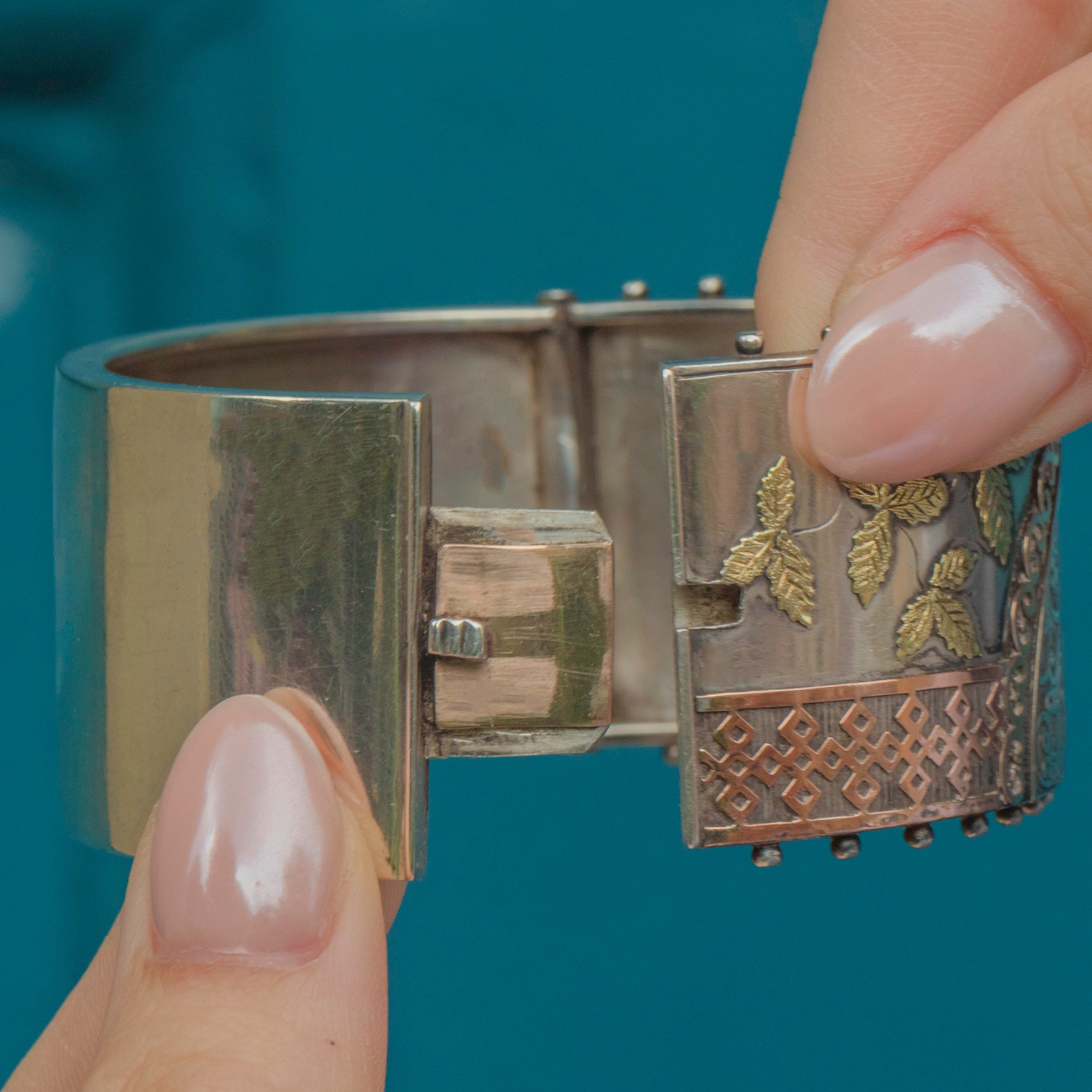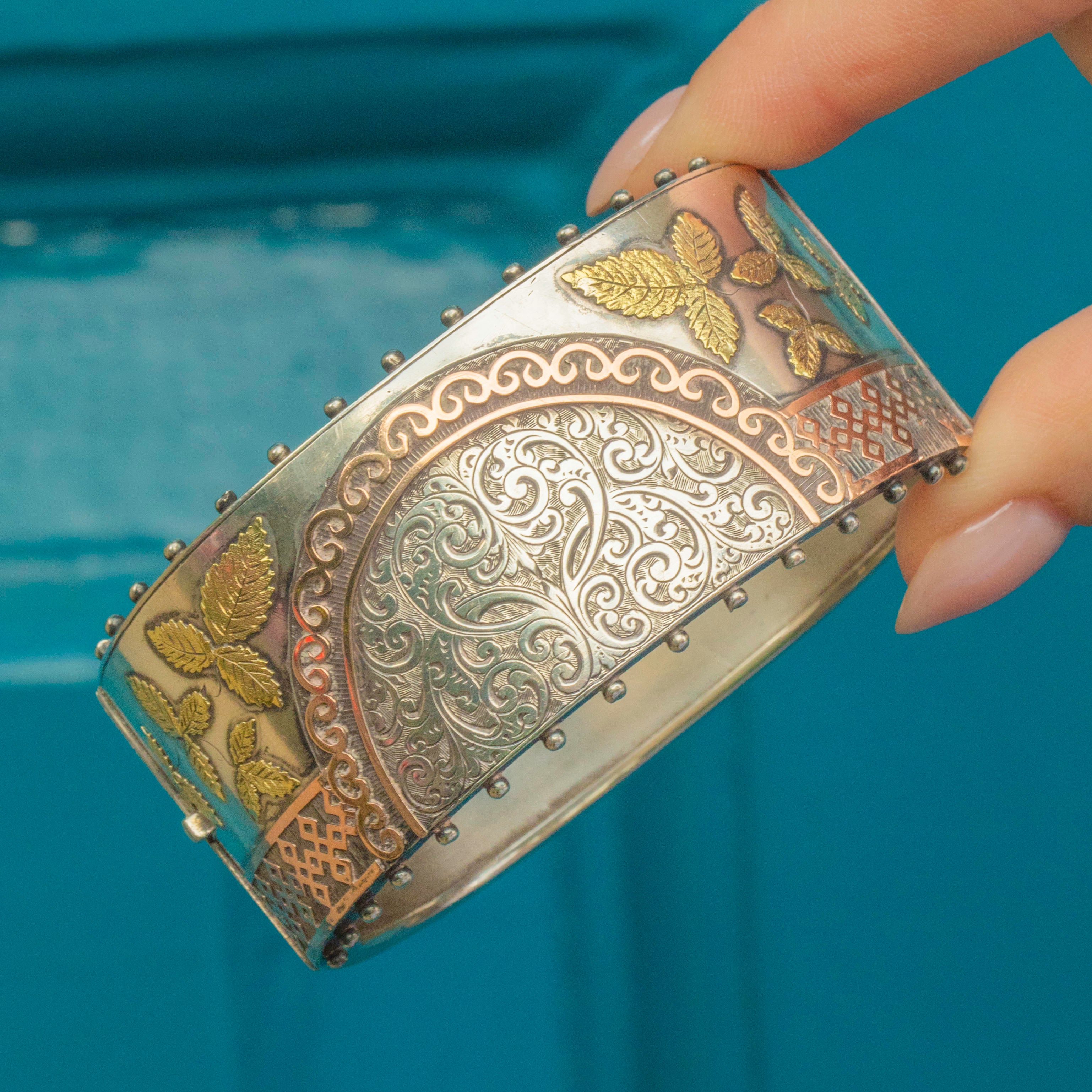 VERY GOOD. This Victorian Aesthetic engraved bangle is in wonderful condition and has clearly been well cared for over the years, closing tightly and symmetrically around the wrist. The Sterling Silver is bright and the bangle has kept its form well with only a few minor dings, commensurate with age. Her 9ct Rose Gold and Green Gold decoration has also aged very well over the years, with only a small section of Rose Gold missing, which is reflected in the price. The engraved details have remained crisp and each bead along the edge is present. She is a beauty!