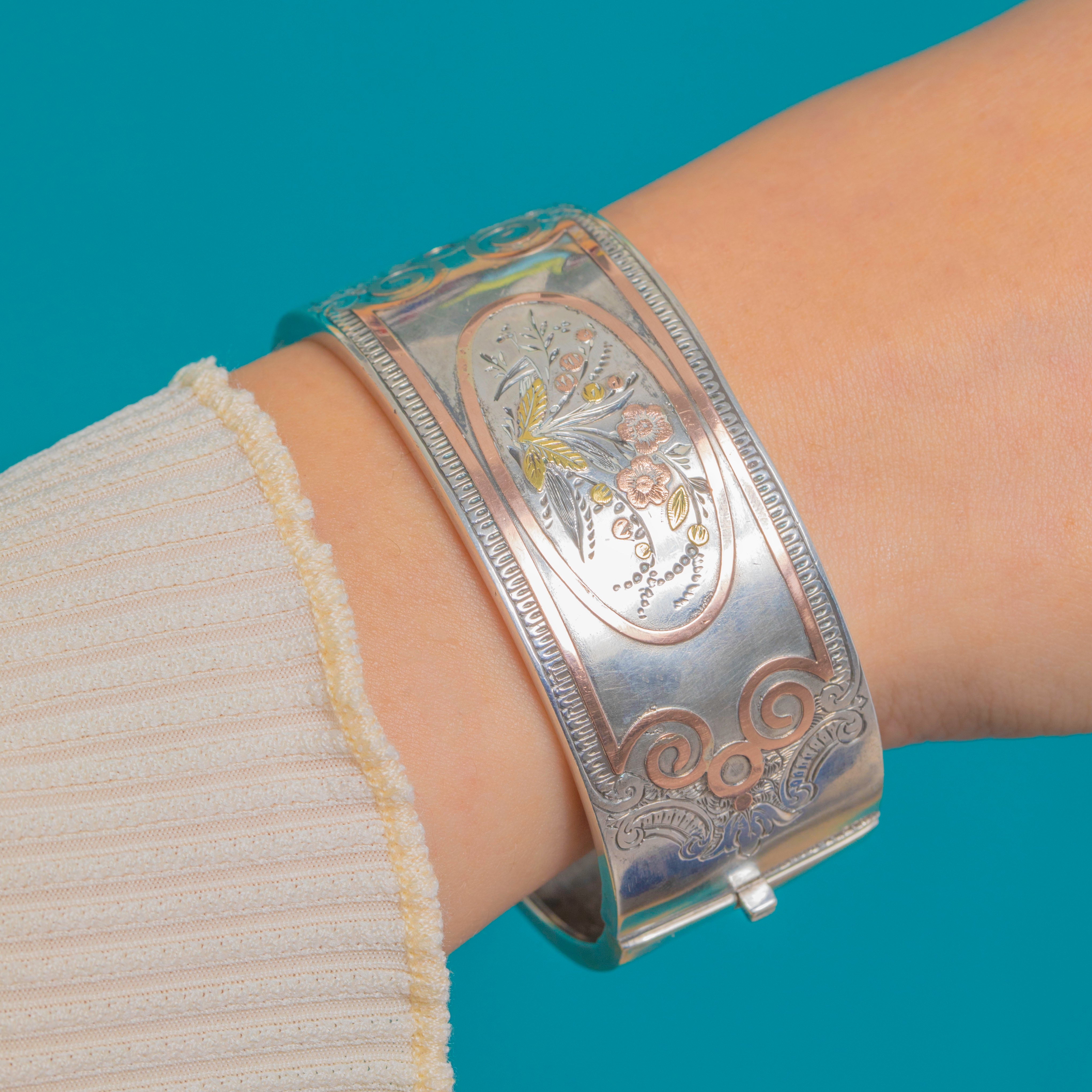 The wide, hinged cuff form is quintessentially late 19th century, with mixed-metal botanical motifs and fine scrollwork embodying the era’s love of nature and contrast.