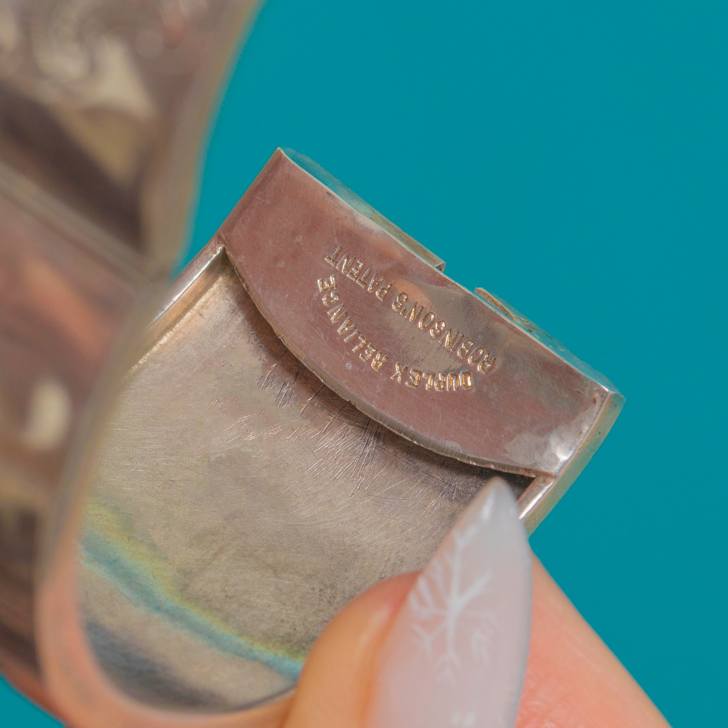 EXCELLENT: Crisp engravings with only light surface wear and a soft, even patina. The hollow-form cuff shows a few tiny pin-dents commensurate with age but no visible repairs. Hinge and box clasp are in perfect working order and close securely.