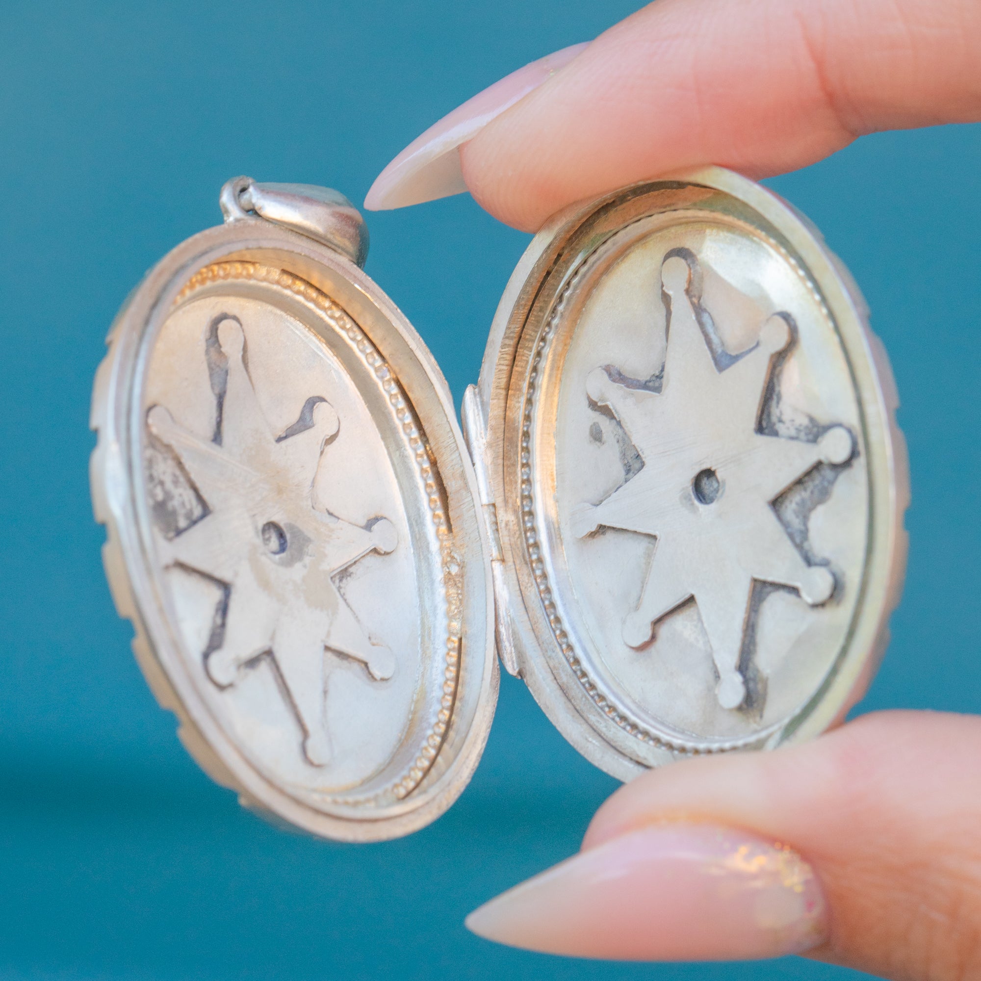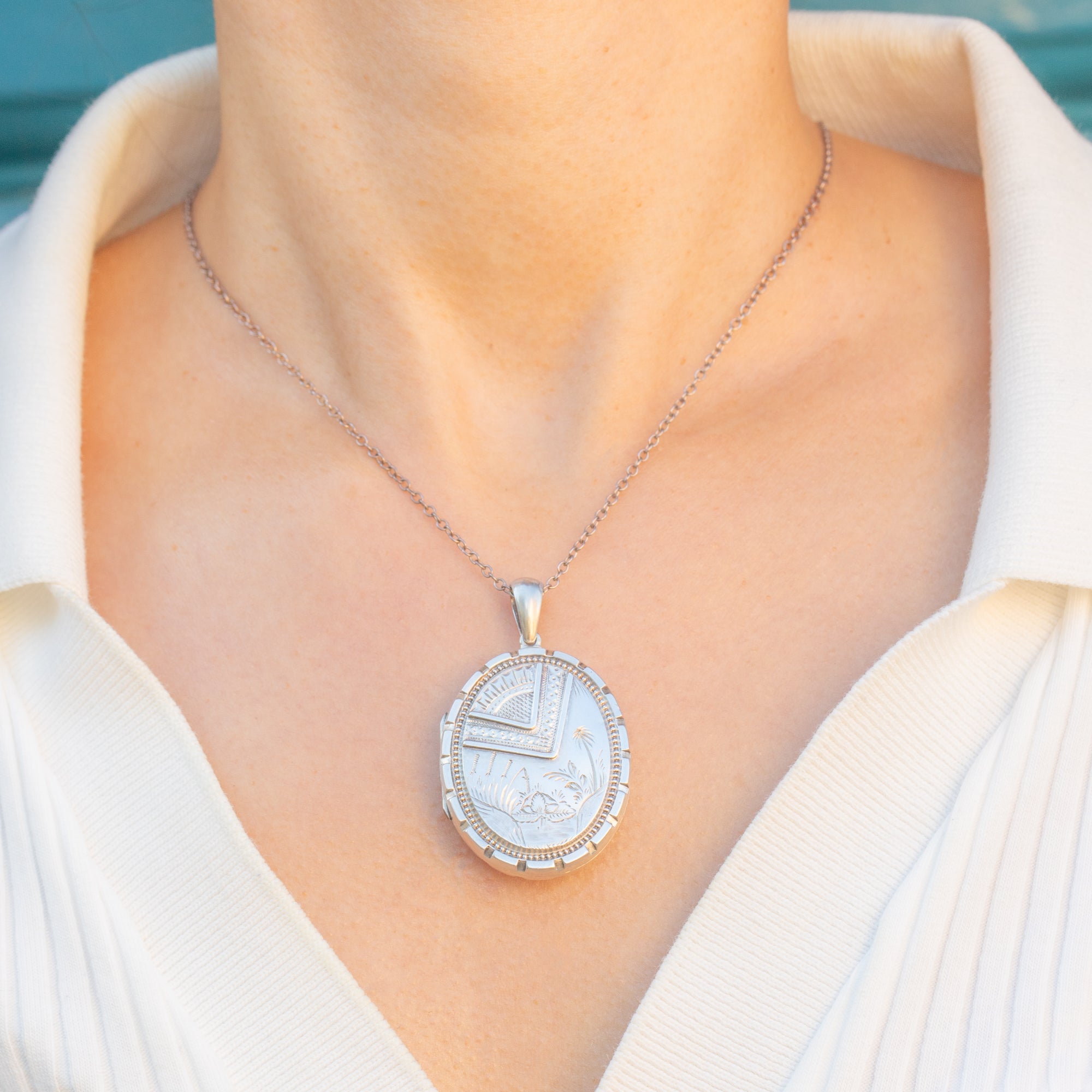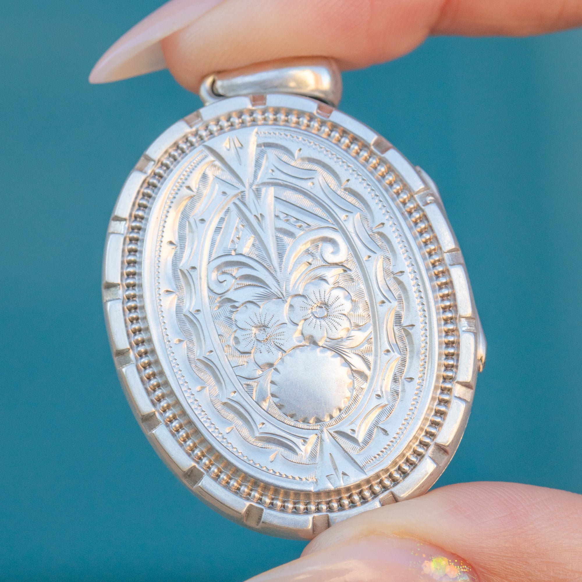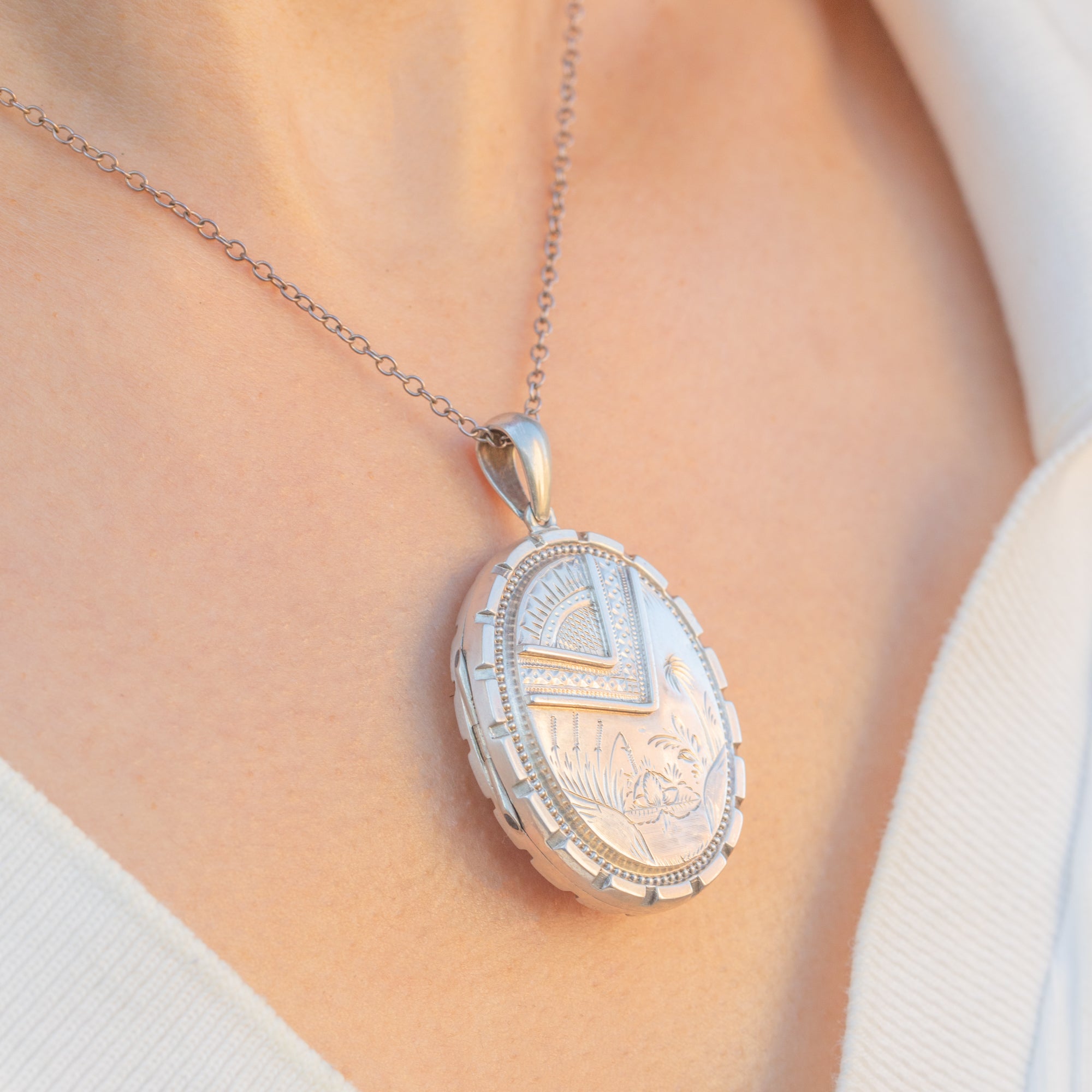 This striking Victorian Silver locket features an intricately engraved palm tree, a rare and evocative motif in 19th-century jewellery. The oval form opens to reveal both original frames inside, perfect for keeping photographs or mementos safe. Substantial in size and weight, this locket carries the bold yet refined charm of the Aesthetic period.