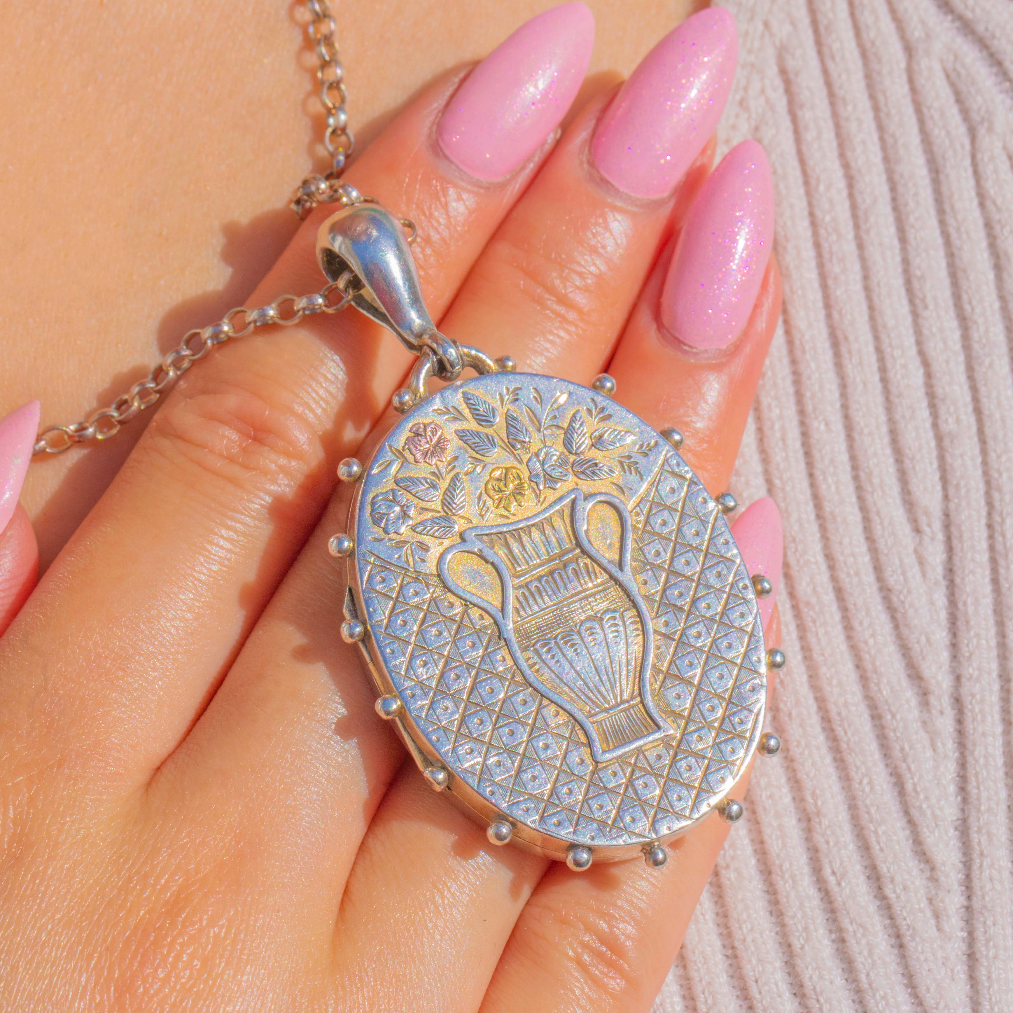 Richly detailed and wonderfully romantic, this Victorian Aesthetic Sterling Silver locket depicts a vase framed by foliate sprays and ribbon drapery, framed by a crisp, beaded border. The front is beautifully worked with a textured, engine‑turned ground that sets the low‑relief motif aglow, while the Silver’s gentle patina lends depth to every contour.