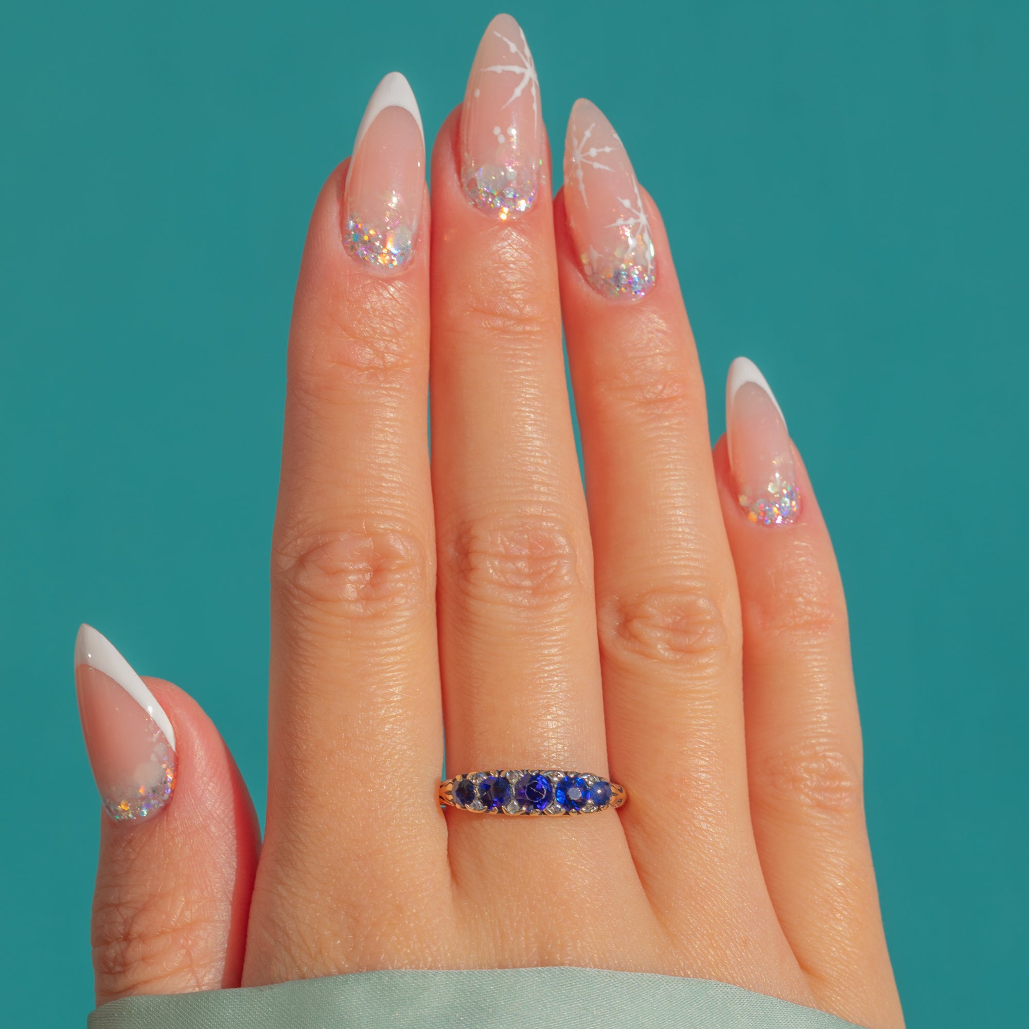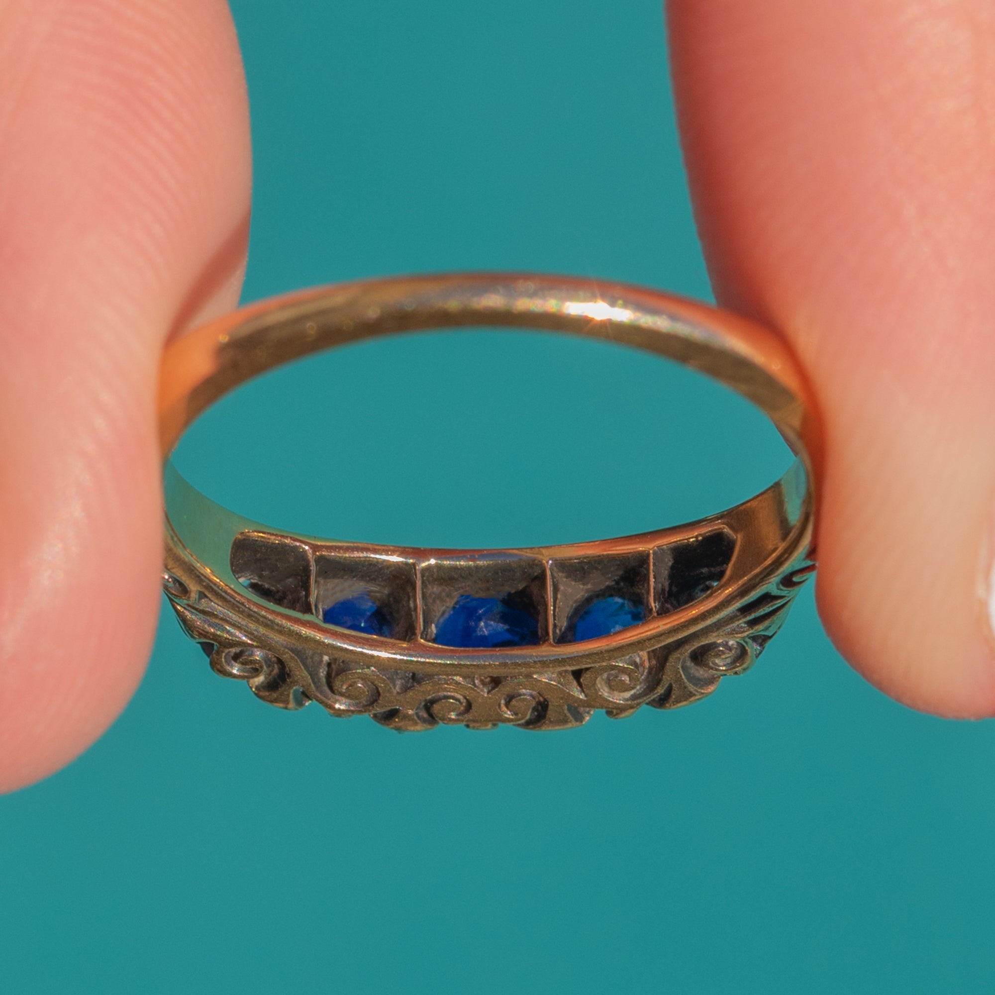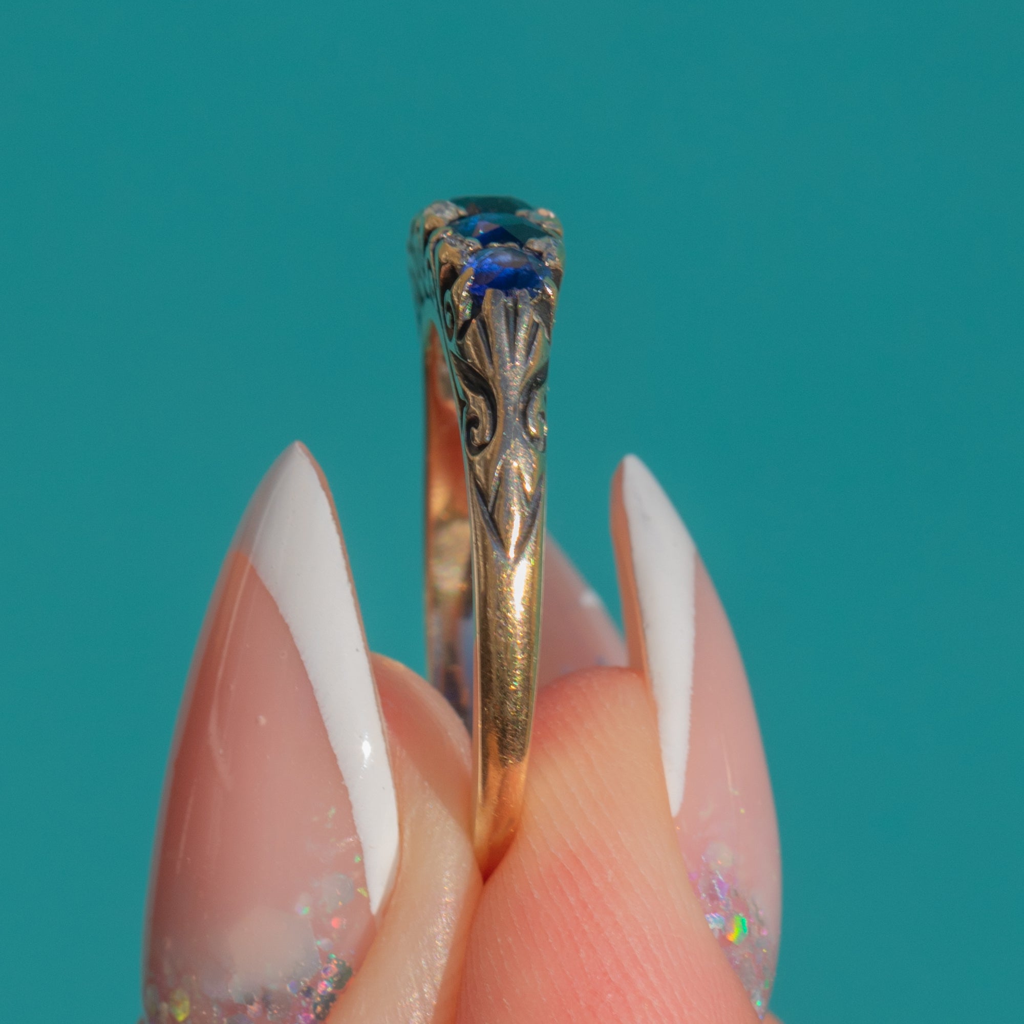 This style of ring was a Victorian favourite, symbolising love and devotion. With its well-matched natural Sapphires and crisp details, this example is a true gem—elegant, wearable, and full of history.