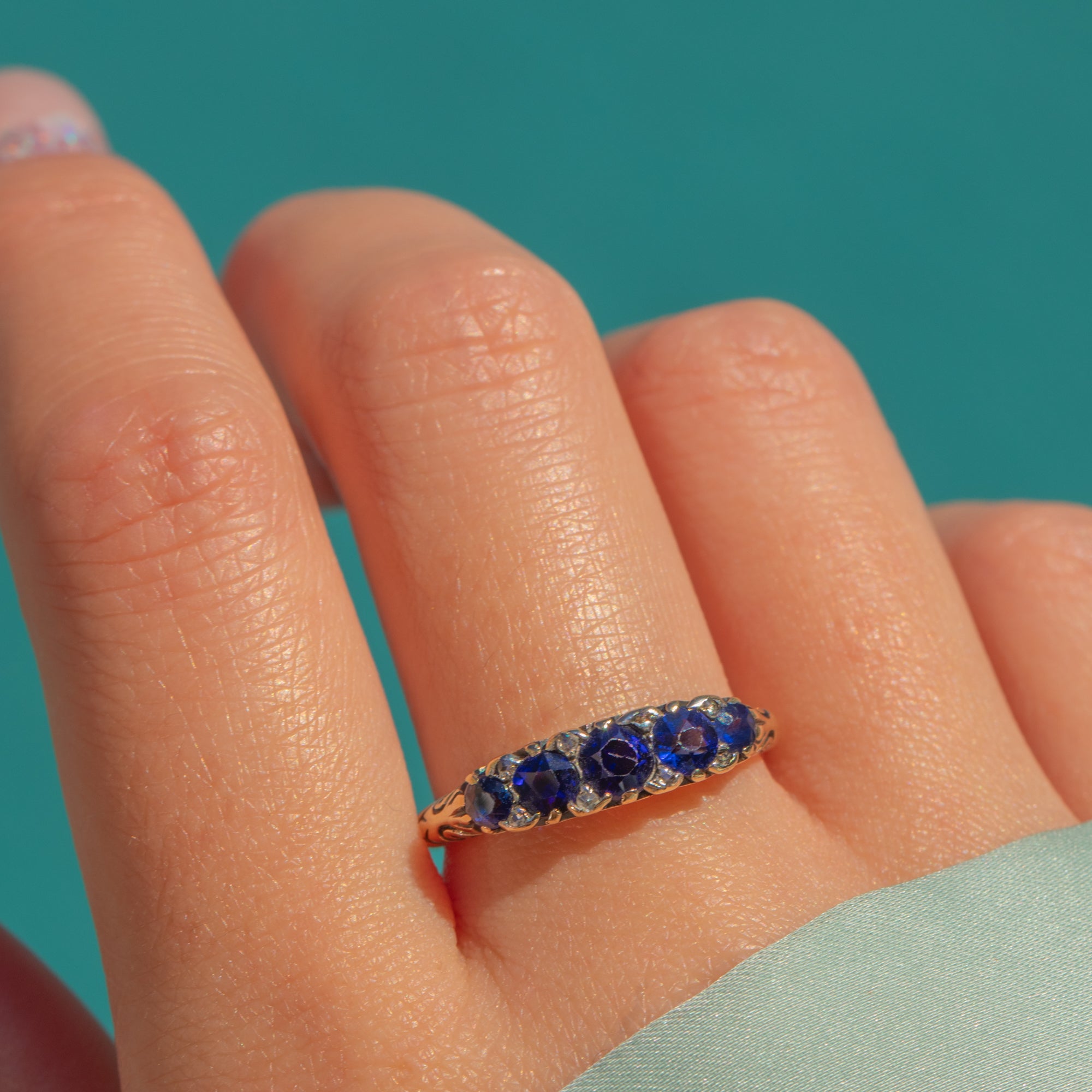 A richly coloured Victorian Sapphire five-stone ring crafted from buttery 18ct Gold. The Sapphires glow with a saturated royal-blue hue, beautifully enhanced by original rose-cut Diamond spacers that add delicate sparkle. The carved gallery and shoulders are wonderfully preserved, retaining the charm and craftsmanship so emblematic of the period.