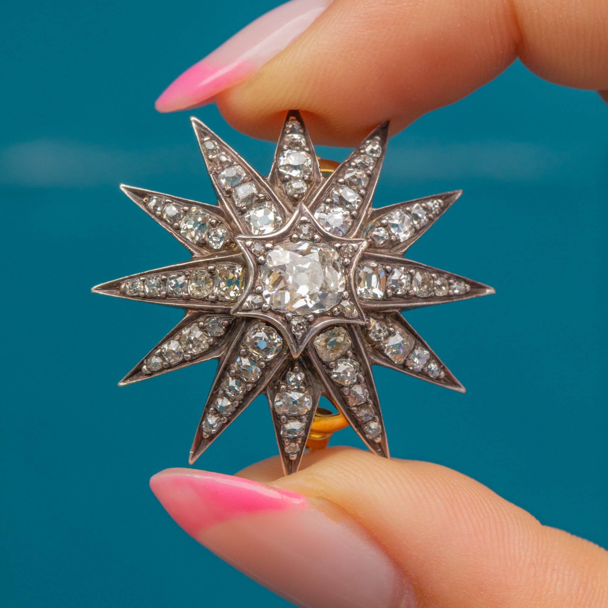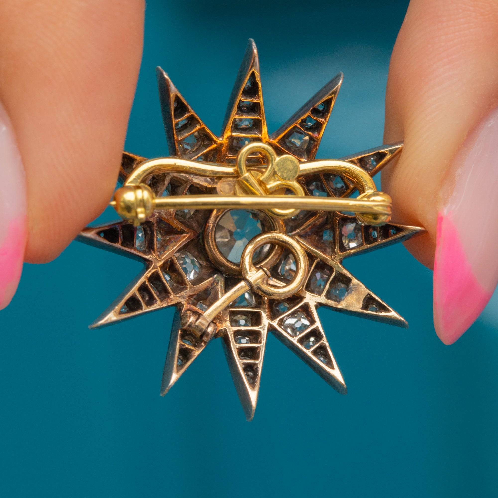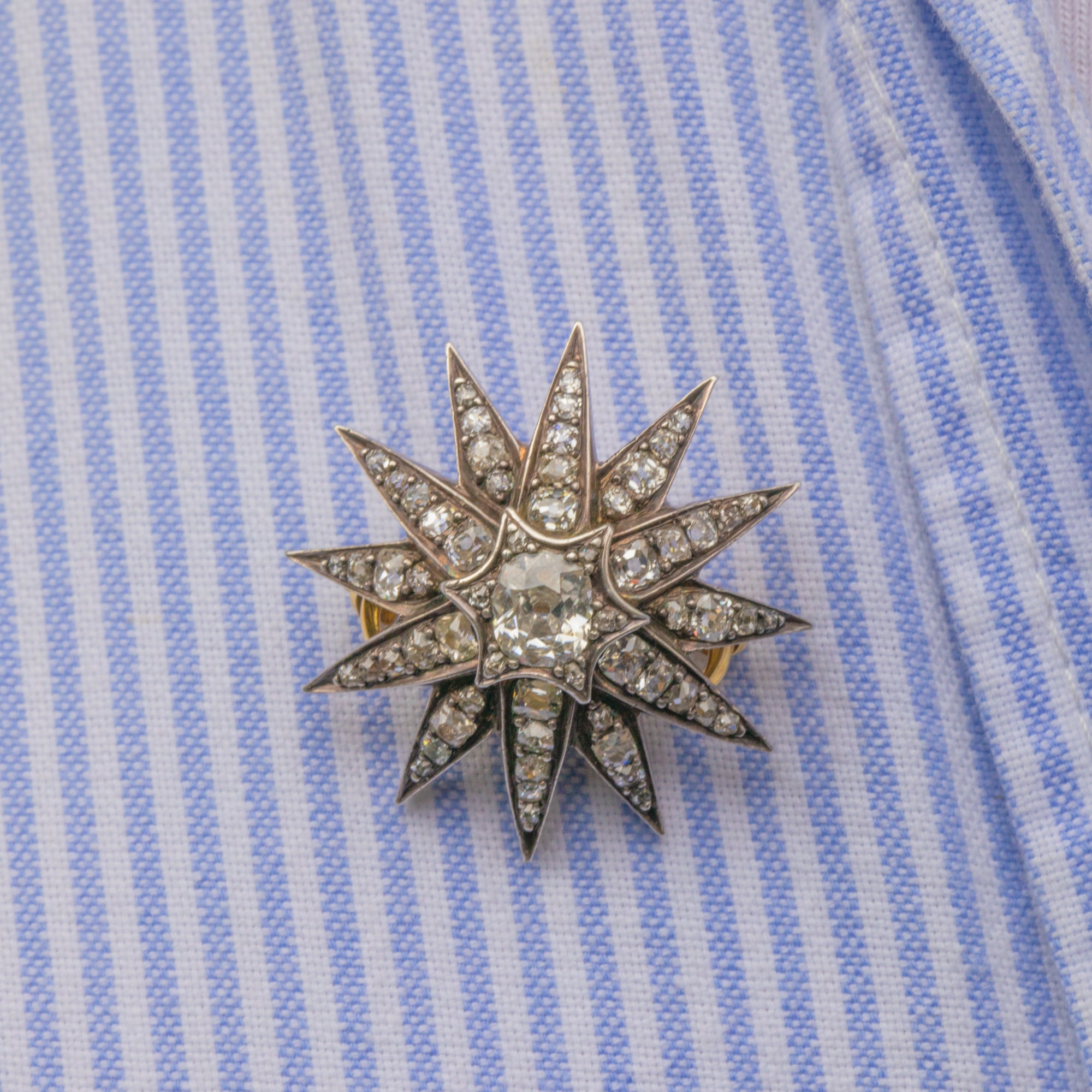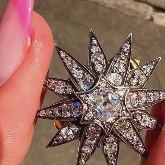 Circa 1880, this Victorian Diamond star has been made from Sterling Silver, and is complete with detachable 18ct Gold brooch fittings. You will be left star-struck by the sparkle from each hand-cut Diamond, the central Old-Mine cut Diamond alone is 0.70ct and perfectly poised. This eye-catching brooch is a versatile choice that can be enjoyed as a pendant, or worn on the lapel of your blazer, all depending on your wearing desires!