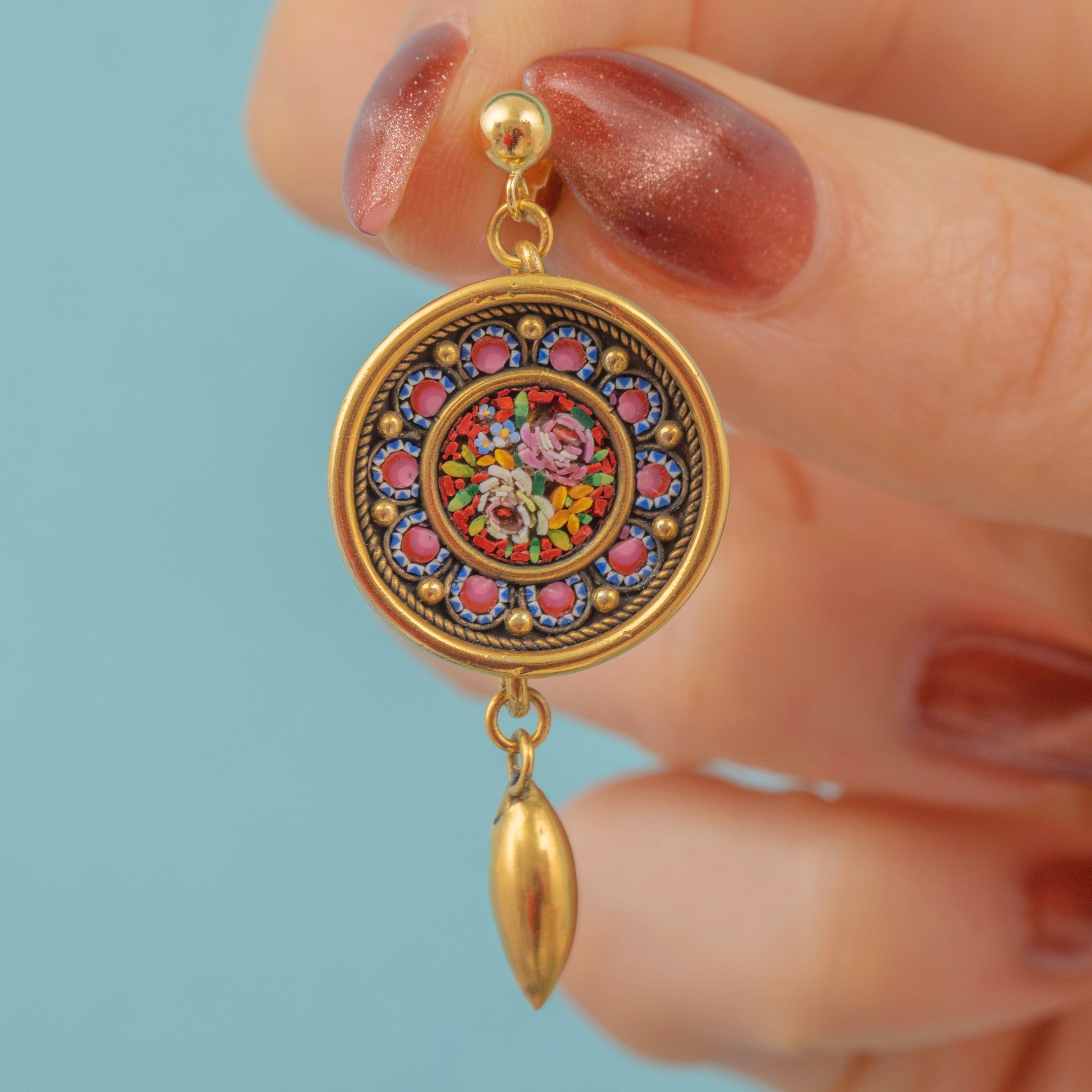 Victorian Floral Micro Mosaic Drop Earrings- 18ct Hooks