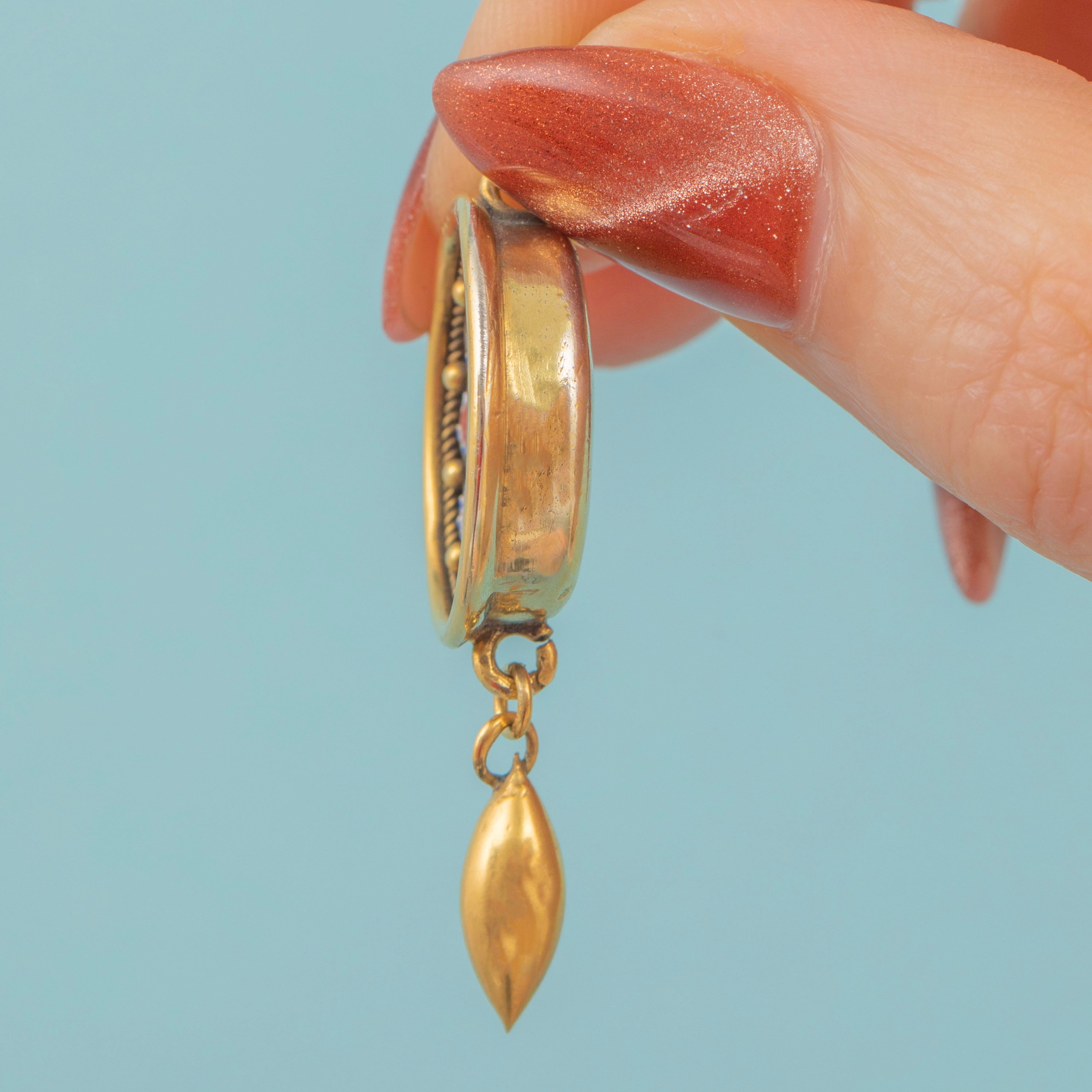 These breathtaking Victorian Floral Micro Mosaic Drop Earrings showcase a beautifully detailed floral scene at their centre, framed within an elegant circular panel. Delicate and artistic, the design is enhanced by a graceful torpedo drop, adding movement and eccentric charm.
