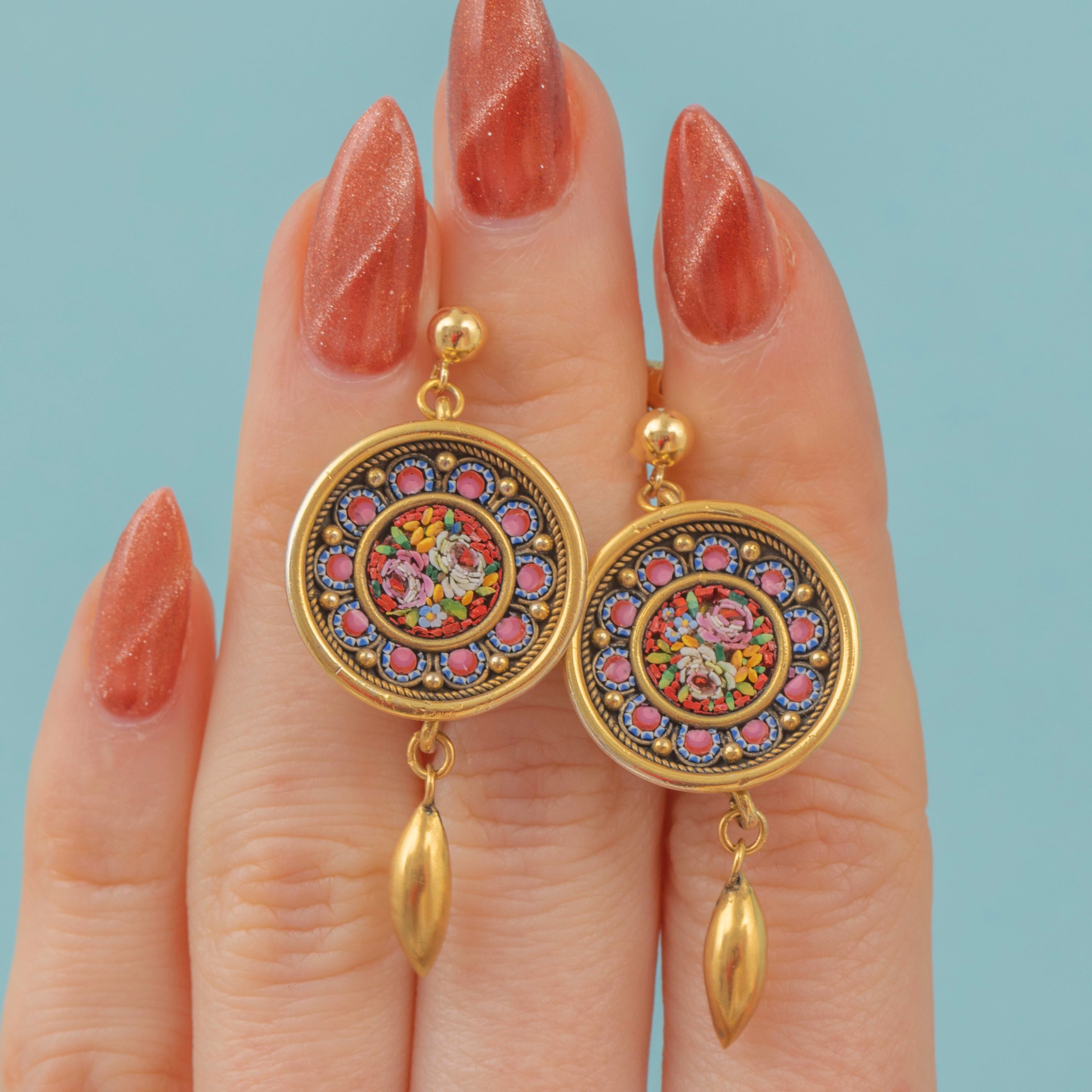 VERY GOOD These Victorian Floral Micro Mosaic Drop Earrings are presented in very good condition, having been very well preserved over time, with the intricate mosaic design remaining vibrant and intact. There is some wear to the back of the Gold including some dents and dinks to the surface, consistent with age, but this does not affect their beauty or wearability and of course is not visible during wear.