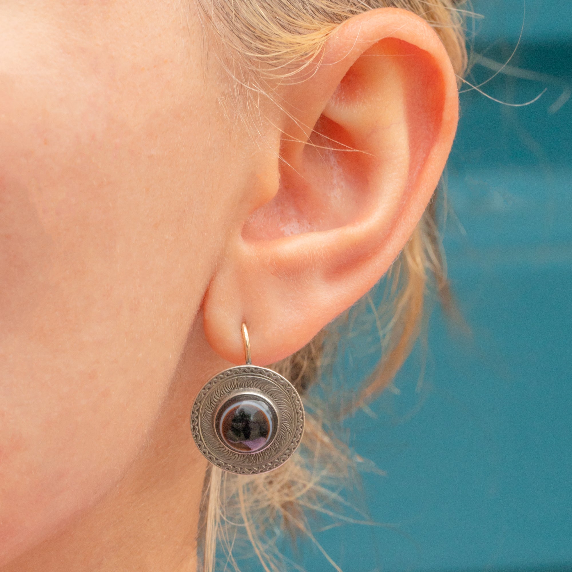 Boasting character and antique charm, this pair of Victorian earrings each presents a plump banded Agate with a white band running the circumference of the stone - akin to a bullseye.