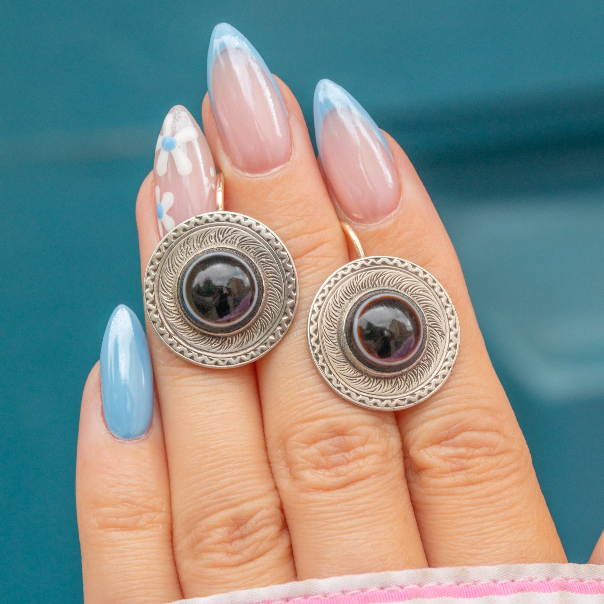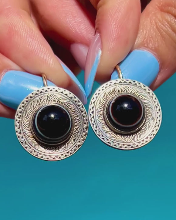 The gemstones are set in striking Sterling Silver settings, adorned with intricate and ornate engravings. Complete with glossy 9ct Gold hooks, these antique earrings will make a striking addition to your collection!