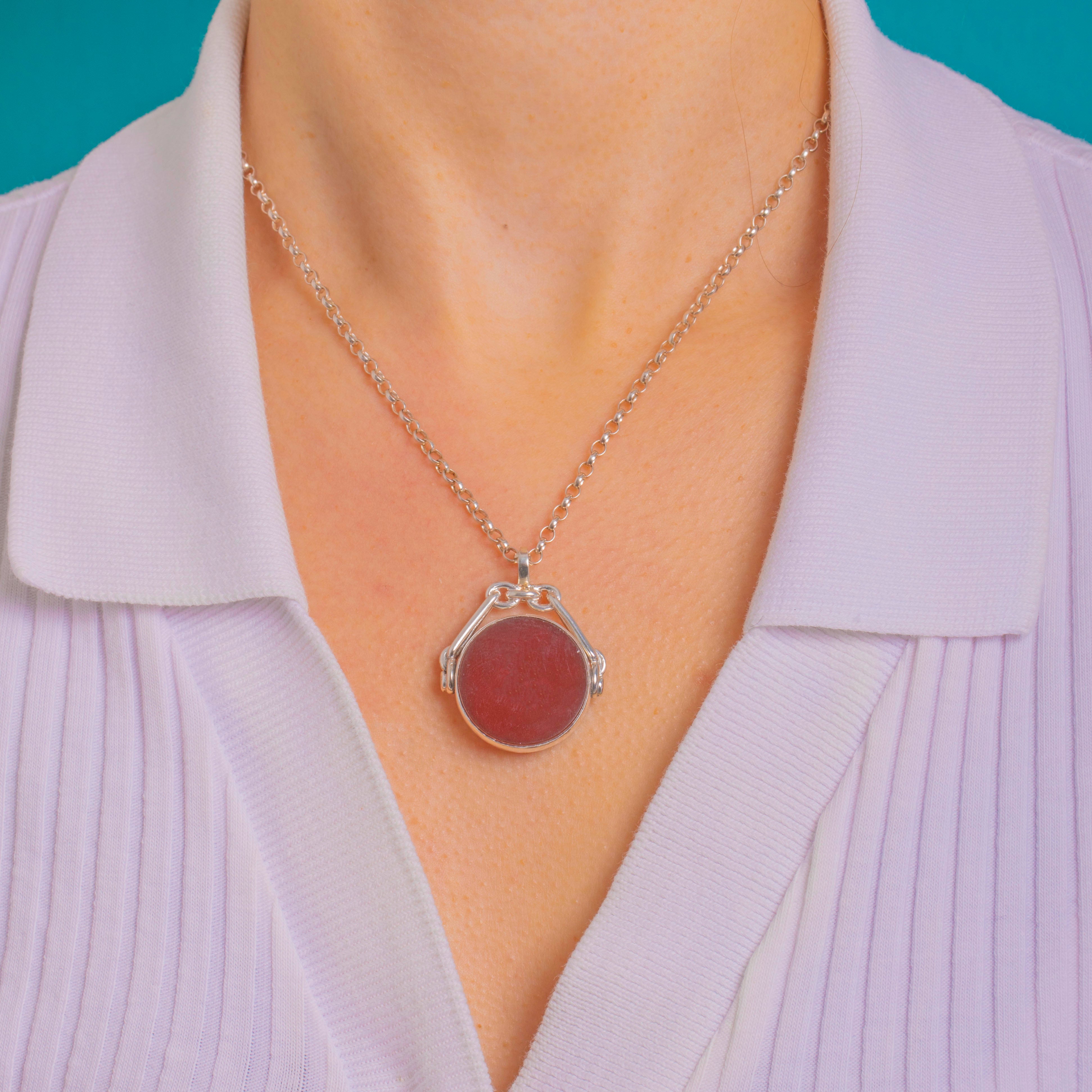 A classic Victorian swivel fob, crafted in bright Sterling Silver and set with a double-sided circular tablet of Carnelian and Bloodstone. The round seal spins within a U-shaped yoke terminating in neat scroll finials, creating a clean, functional silhouette with that unmistakable watch-fob character.