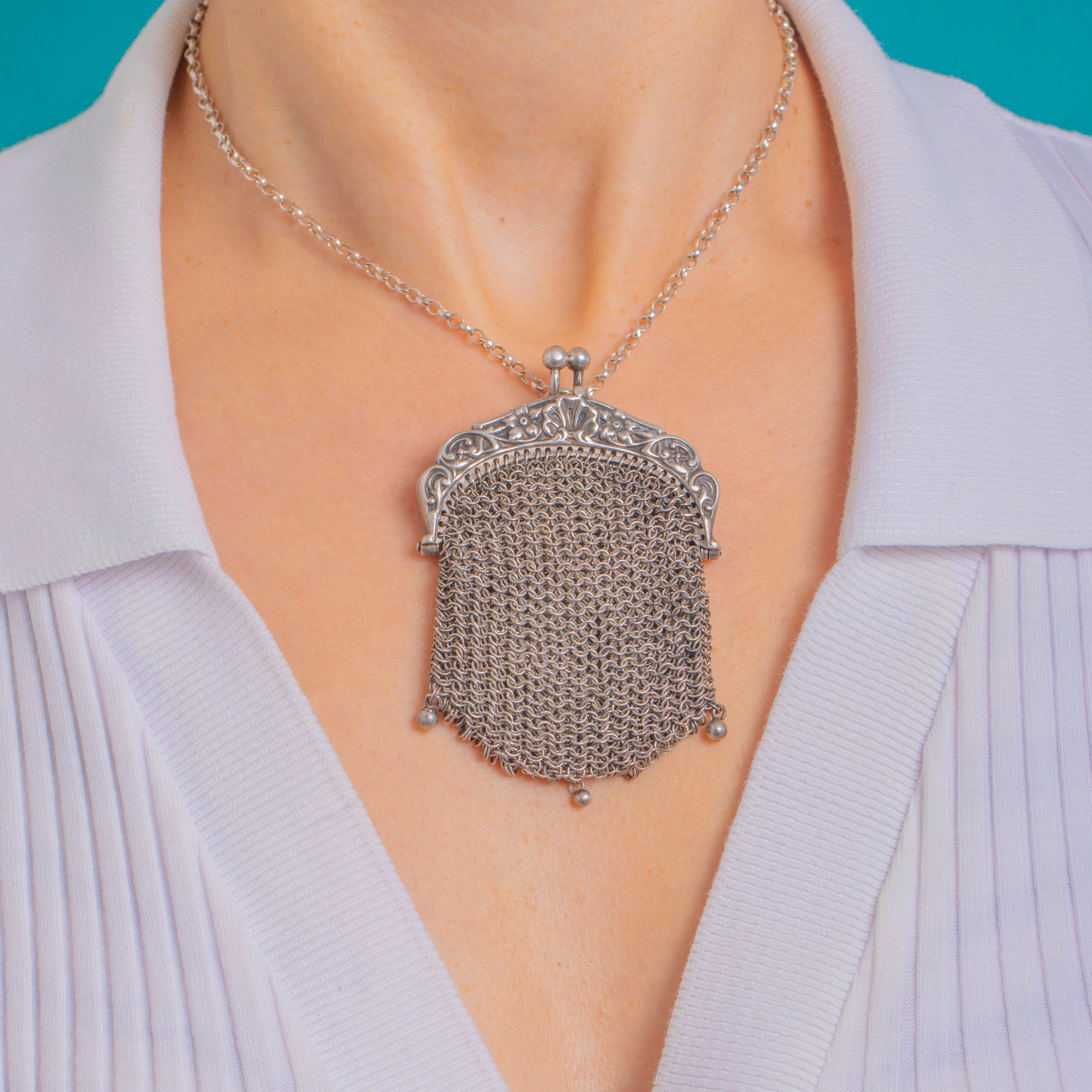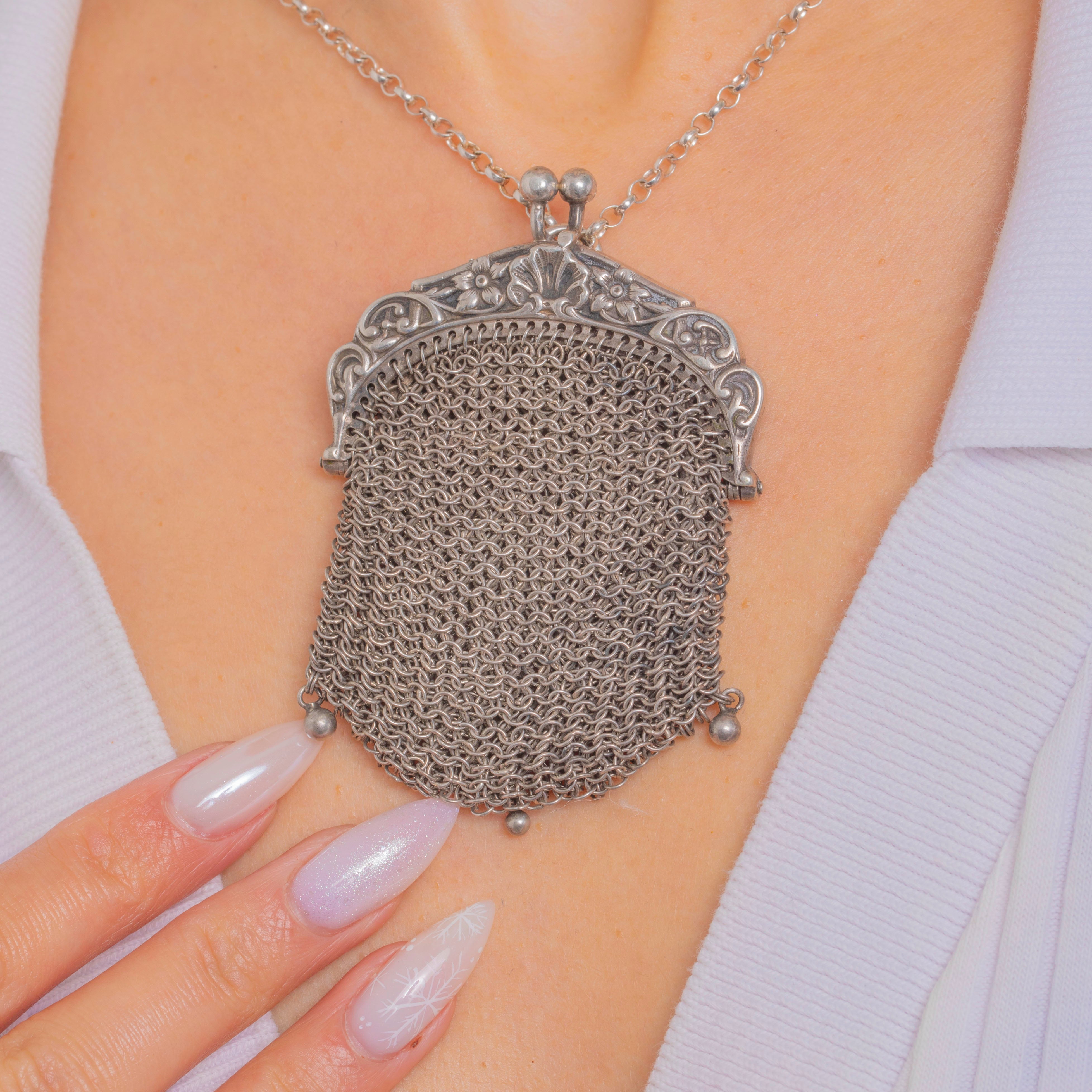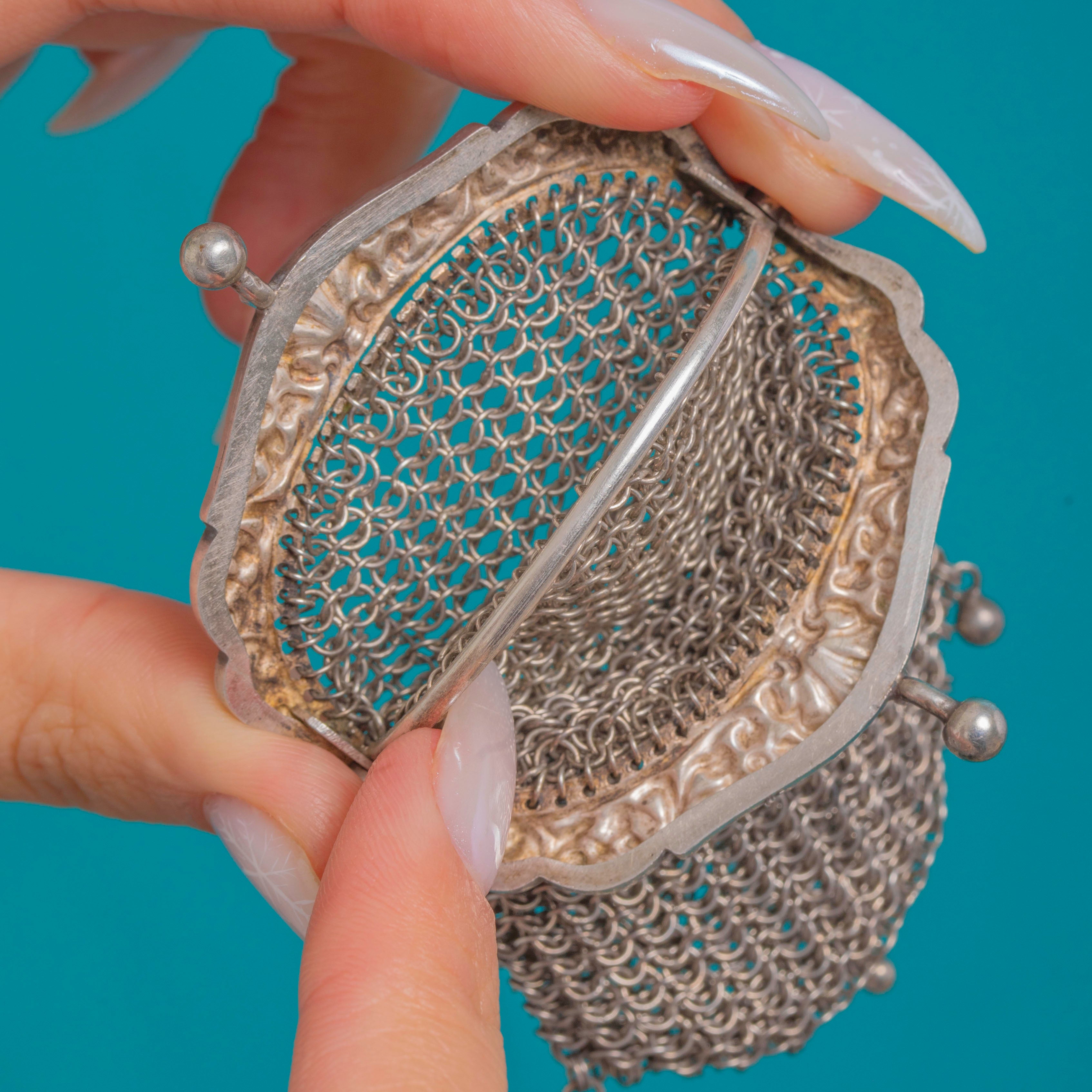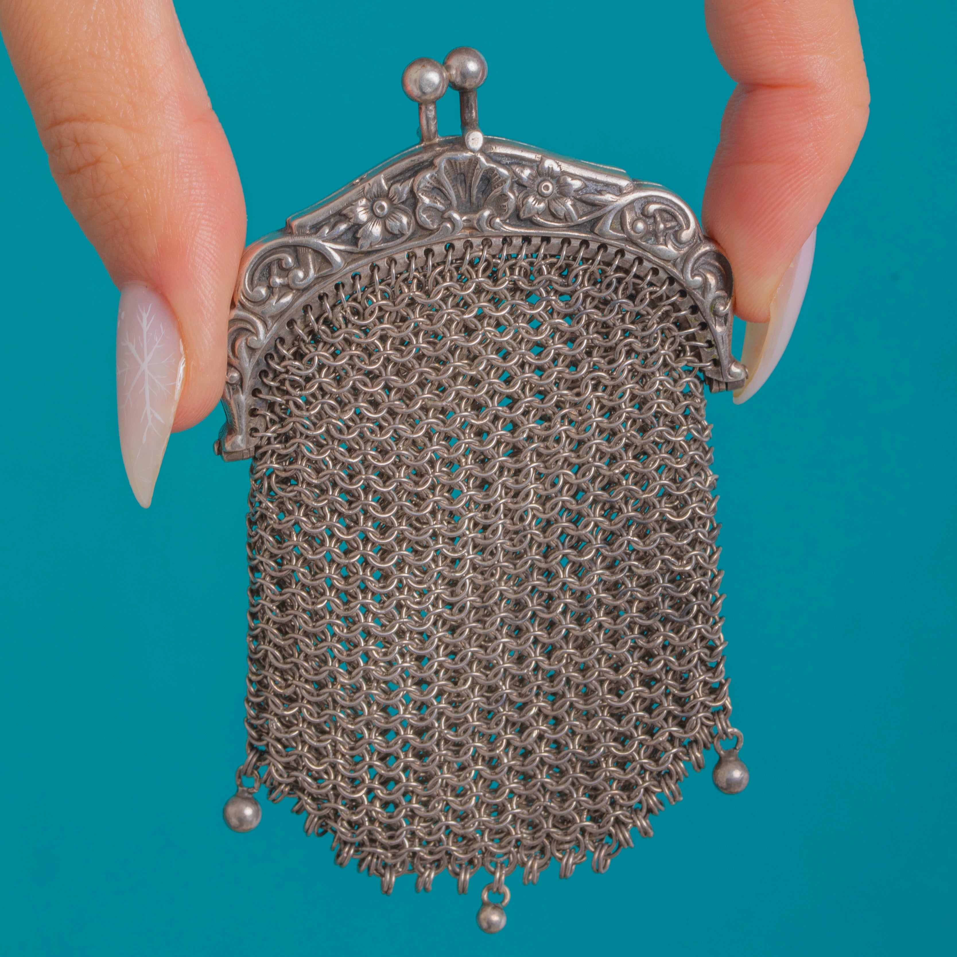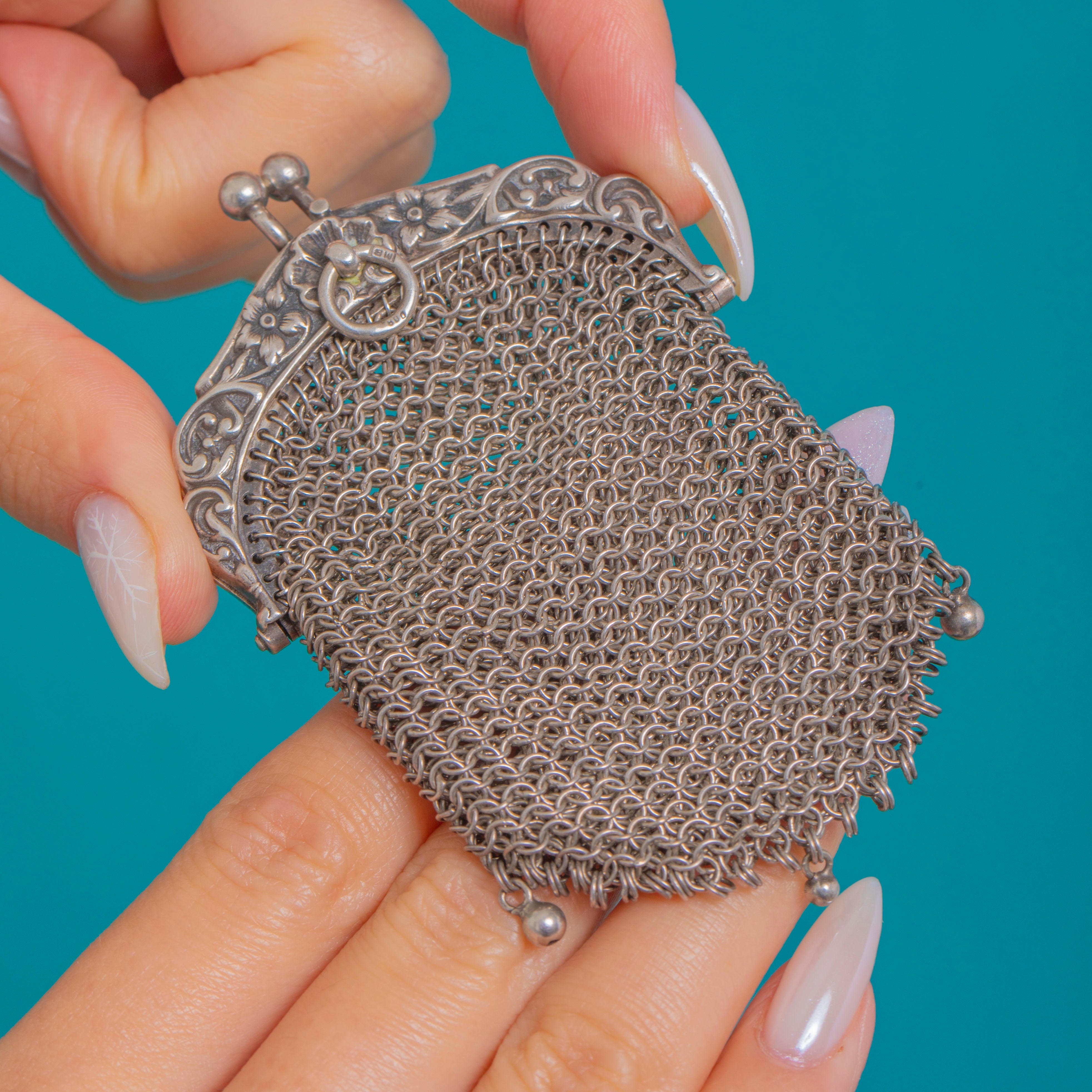 A delectable Victorian miniature chainmail mesh purse pendant, crafted in shimmering Sterling Silver and alive with movement! The ornate repoussé frame is adorned with foliate and scroll motifs, closing with a neat twin‑ball kiss‑lock, while the fine hand‑linked ring‑mesh drapes to a scalloped hem finished with three tiny ball drops for a graceful flourish. We also love the clam-shell design!