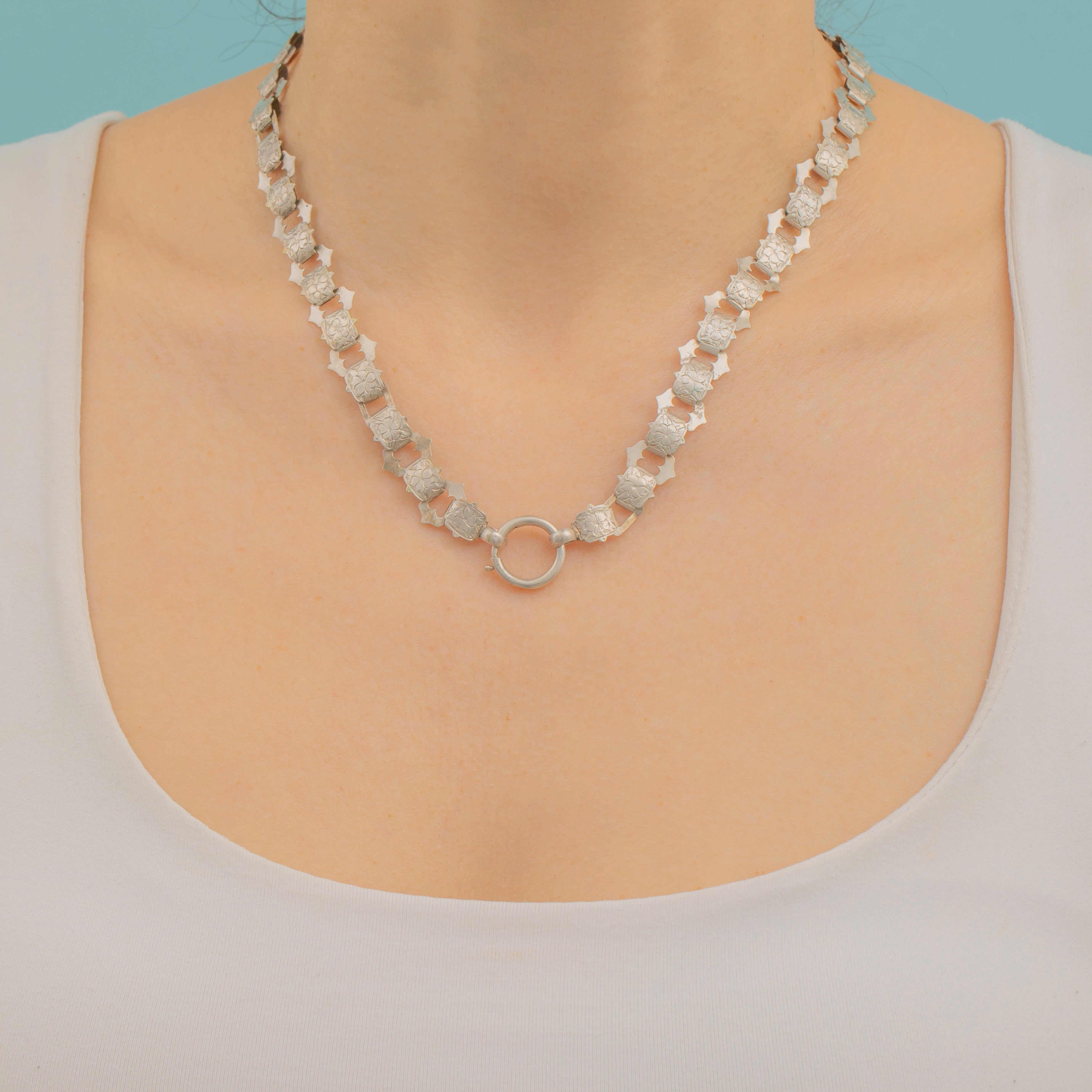 Antique book chains are inherently stylish and make wonderful statement pieces; they are the perfect accessory for women who love to stand out from the crowd. The way the Silver forget-me-not links effortlessly rest over your neckline is sublime, with the uniquely formed links bringing a punky edge to any ensemble!