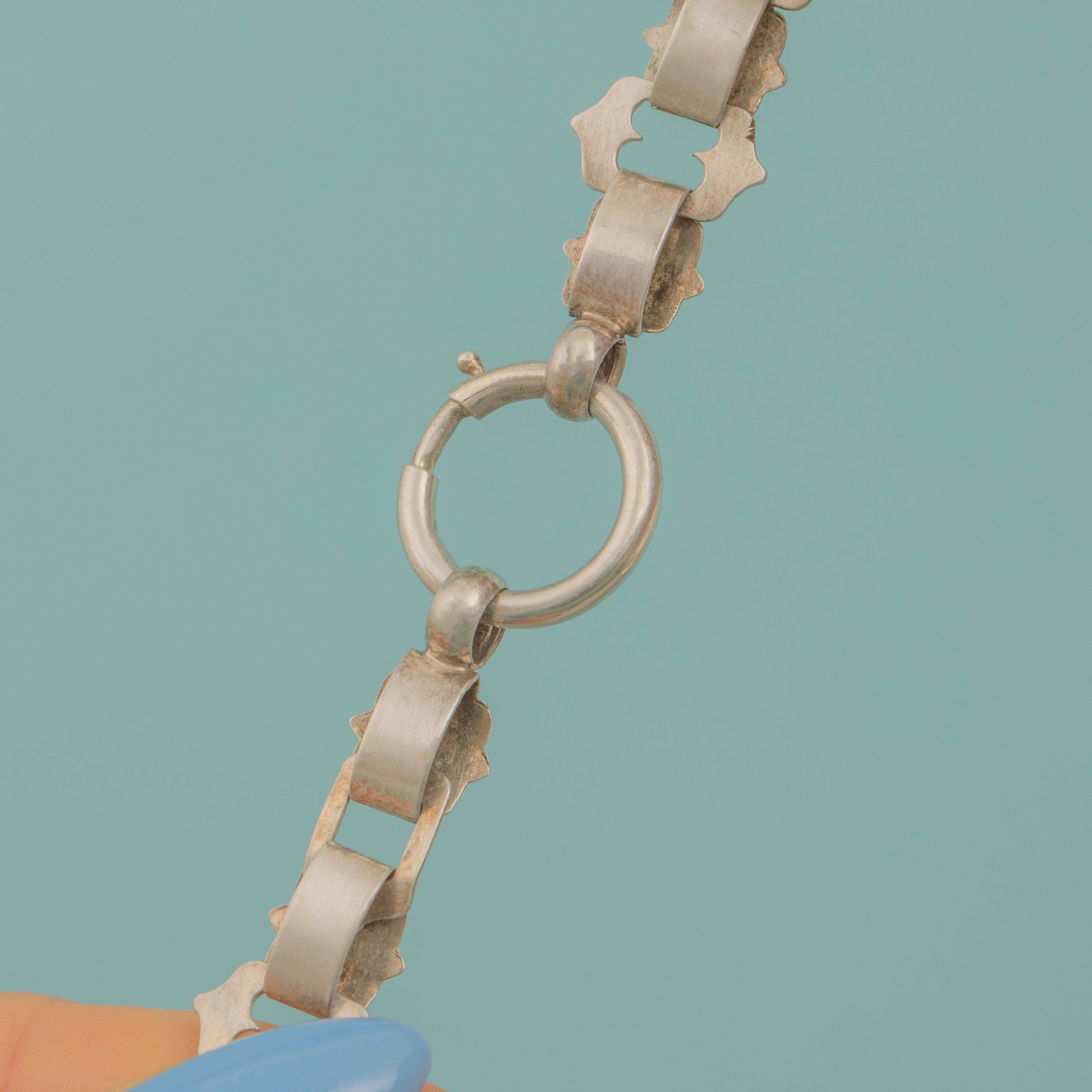 This Victorian Silver engraved forget-me-not book chain is mesmerising! Identical forget-me-not details have been intricately engraved on each link, a traditional symbol of remembrance, and the necklace is secured by a large bolt ring with an additional jump ring at the centre, perfect for adding an antique charm or pendant!