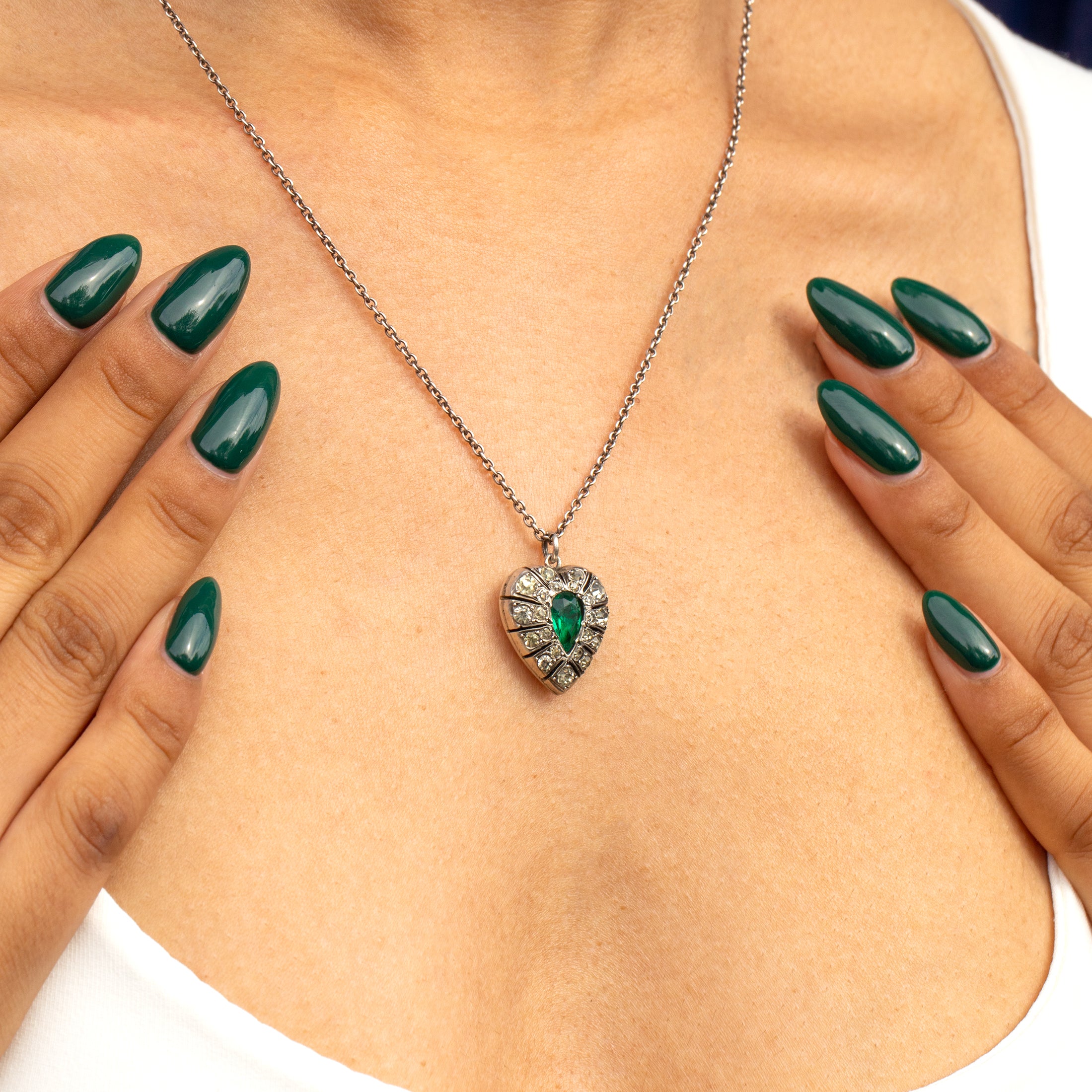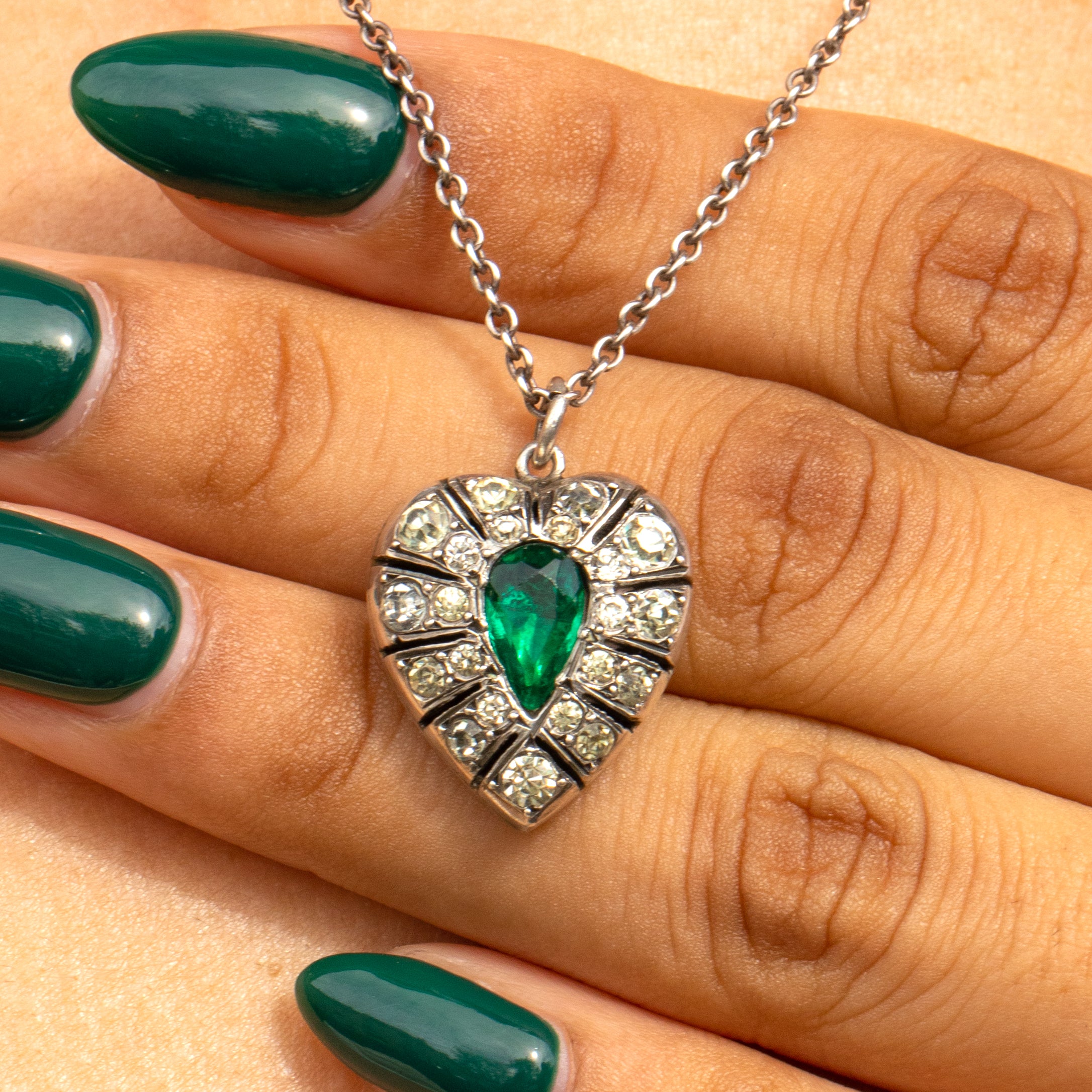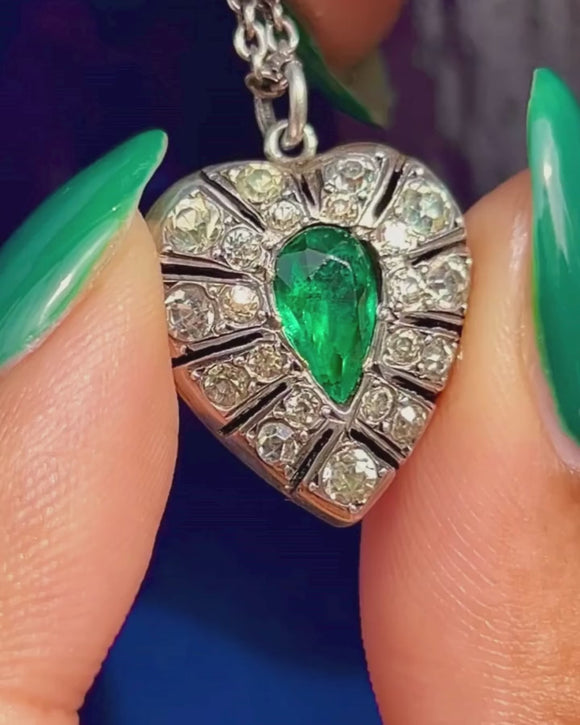 If this Victorian Silver Paste heart pendant doesn't grab your attention then we don't know what will! A vibrant Emerald Paste takes centre stage haloed by a plethora of Diamond Paste with an unmissable scintillation, creating a magnificent display as they catch the light.