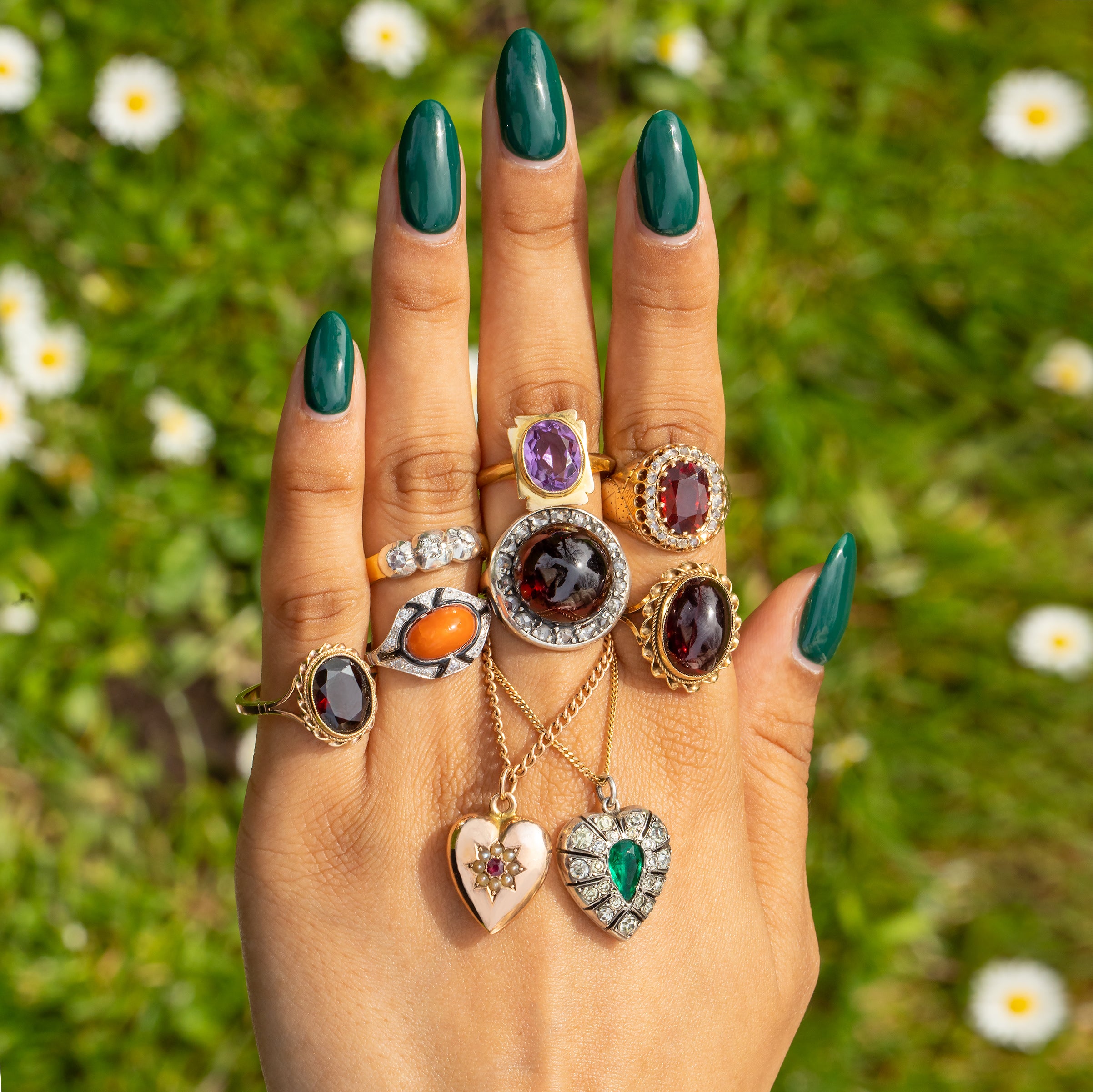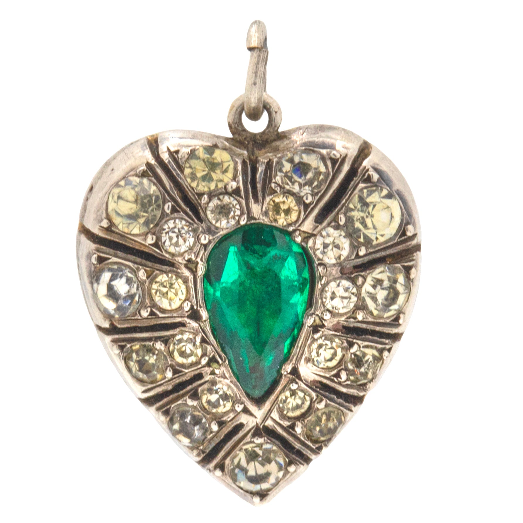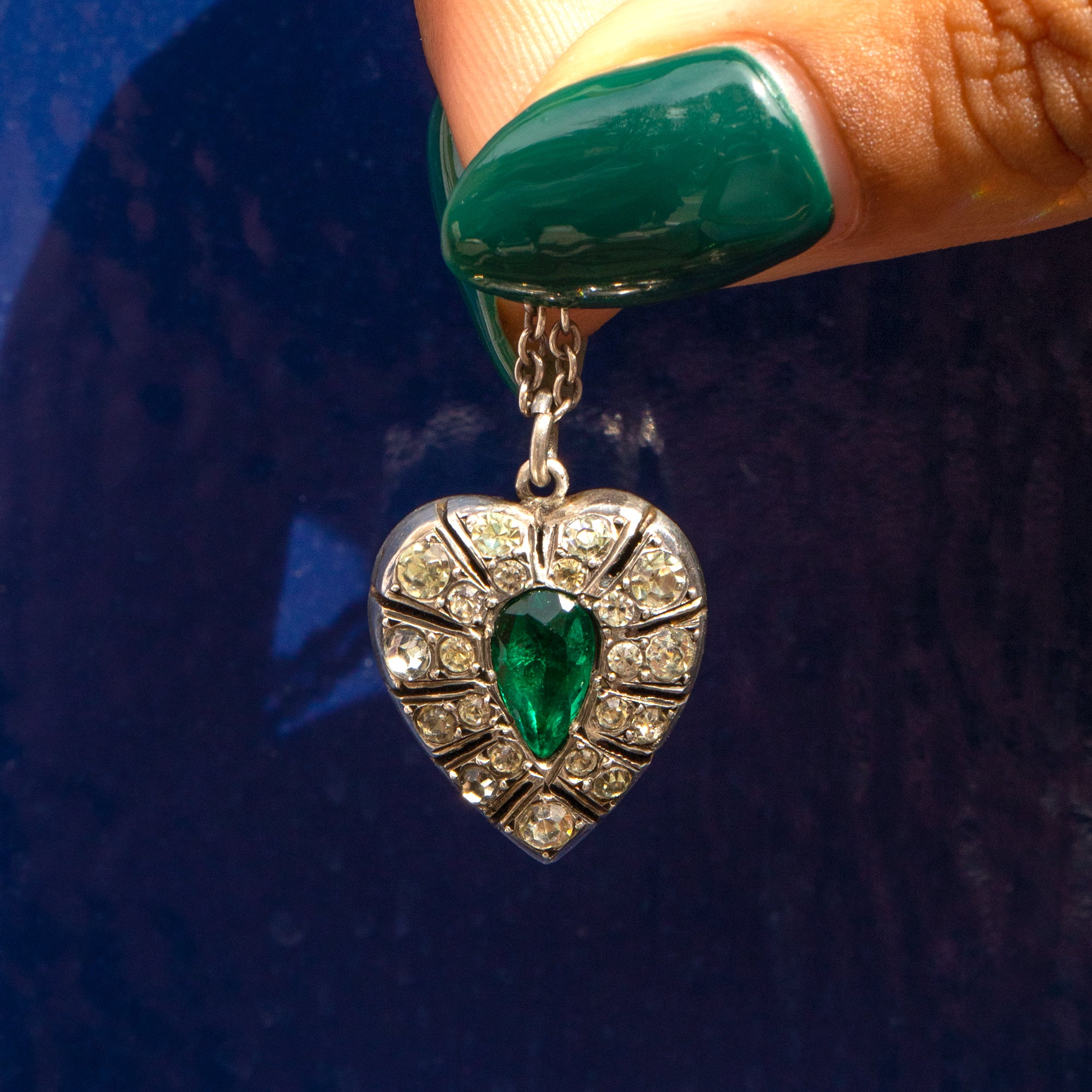 If this Victorian Silver Paste heart pendant doesn't grab your attention then we don't know what will! A vibrant Emerald Paste takes centre stage haloed by a plethora of Diamond Paste with an unmissable scintillation, creating a magnificent display as they catch the light.
