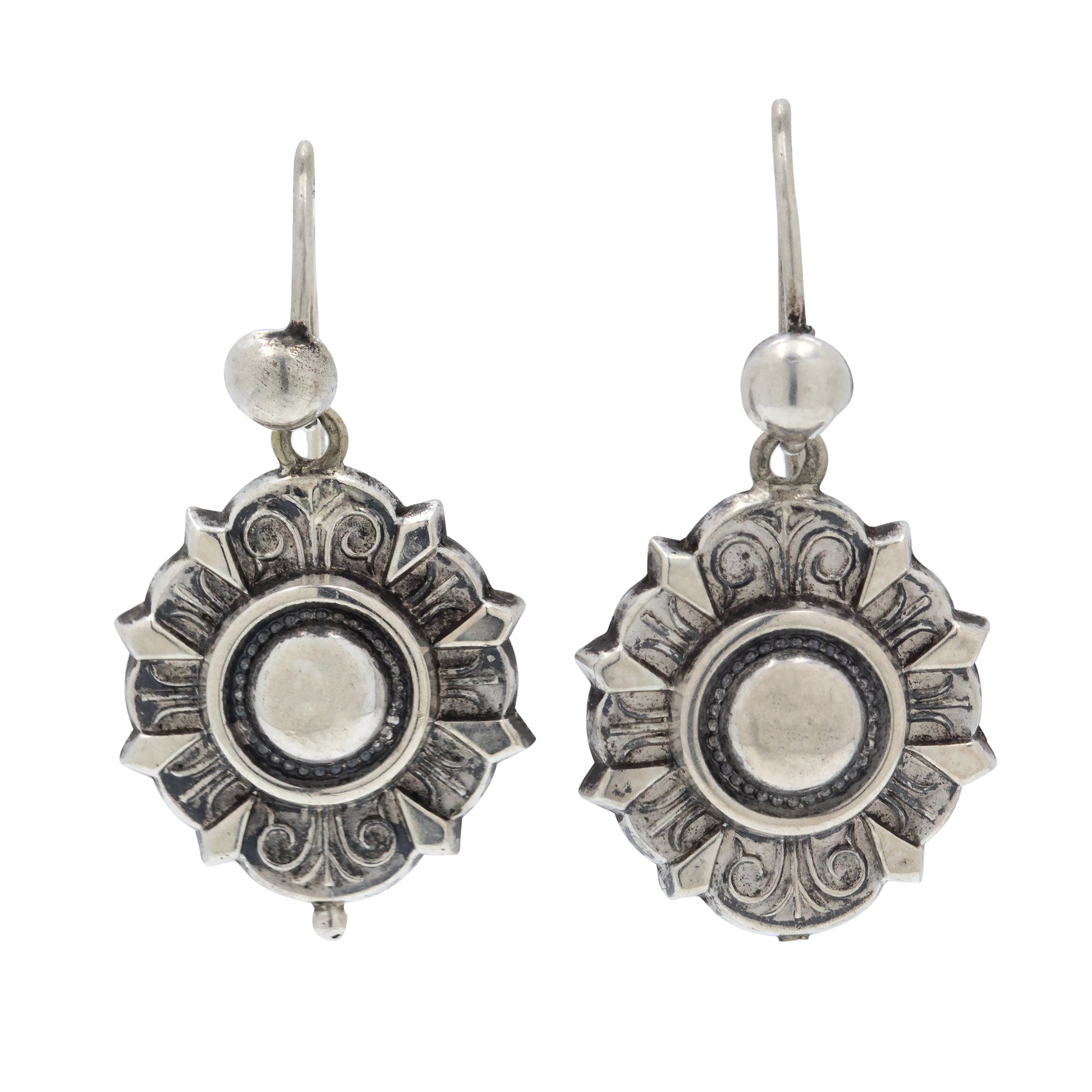 VERY GOOD TO EXCELLENT. These Victorian Silver repoussé earrings are in fabulous condition. The repoussé work has remained crisp and the Silver is bright with a light patina having accrued within the grooves creating a dramatic finish. One of the earrings has a minor ding at the centre, and there is some age-related wear on the back of both earrings, but this is only noticeable under close inspection and cannot be seen while the earrings are worn. The earring hooks are firmly affixed and allow you to confidently wear these eye-catching Victorian earrings in comfort!