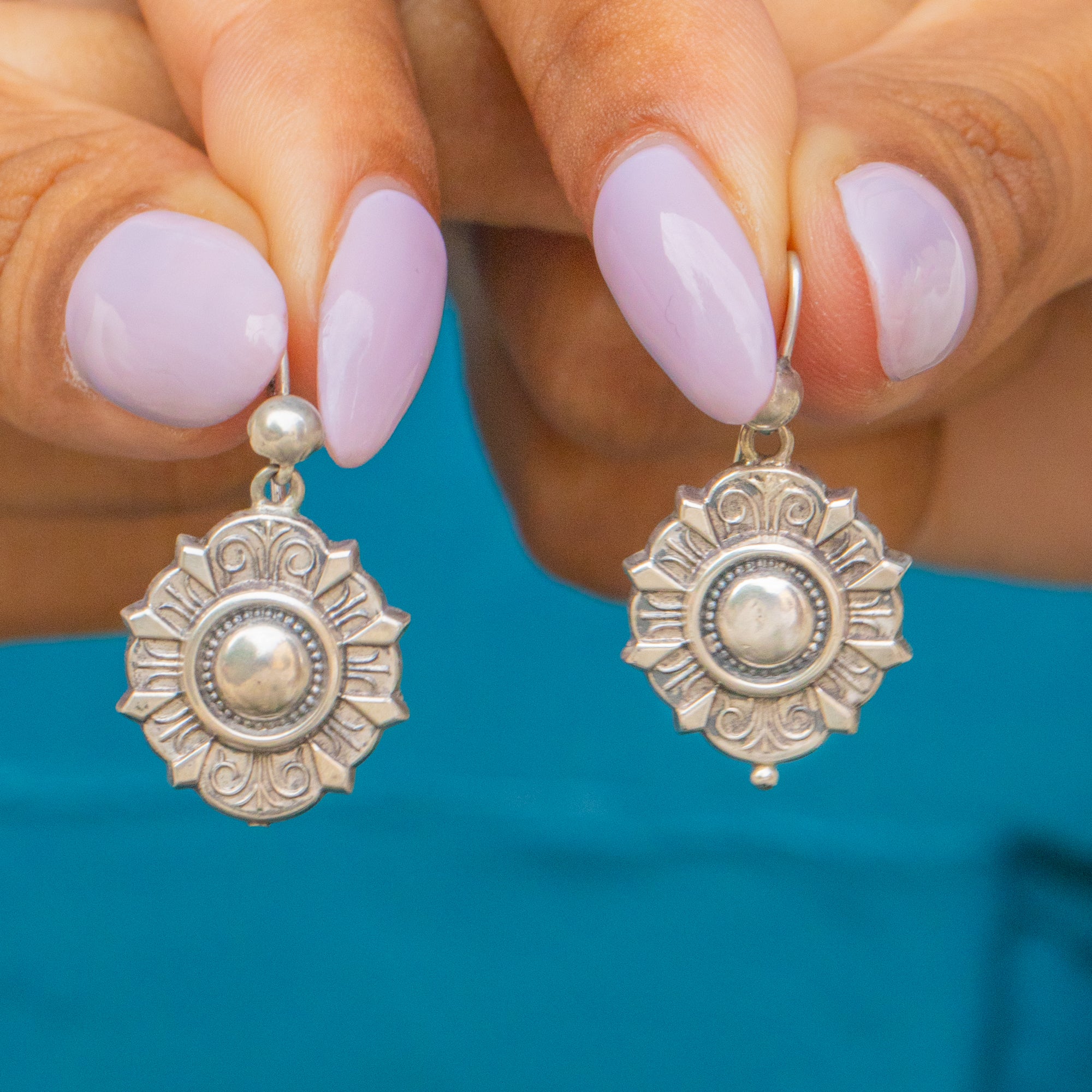 These Victorian Silver repoussé earrings are drop-dead gorgeous! The perfect size for daily wear, these antique earrings showcase skilled craftsmanship with the striking repoussé catching beneath the light as they frame the face.
