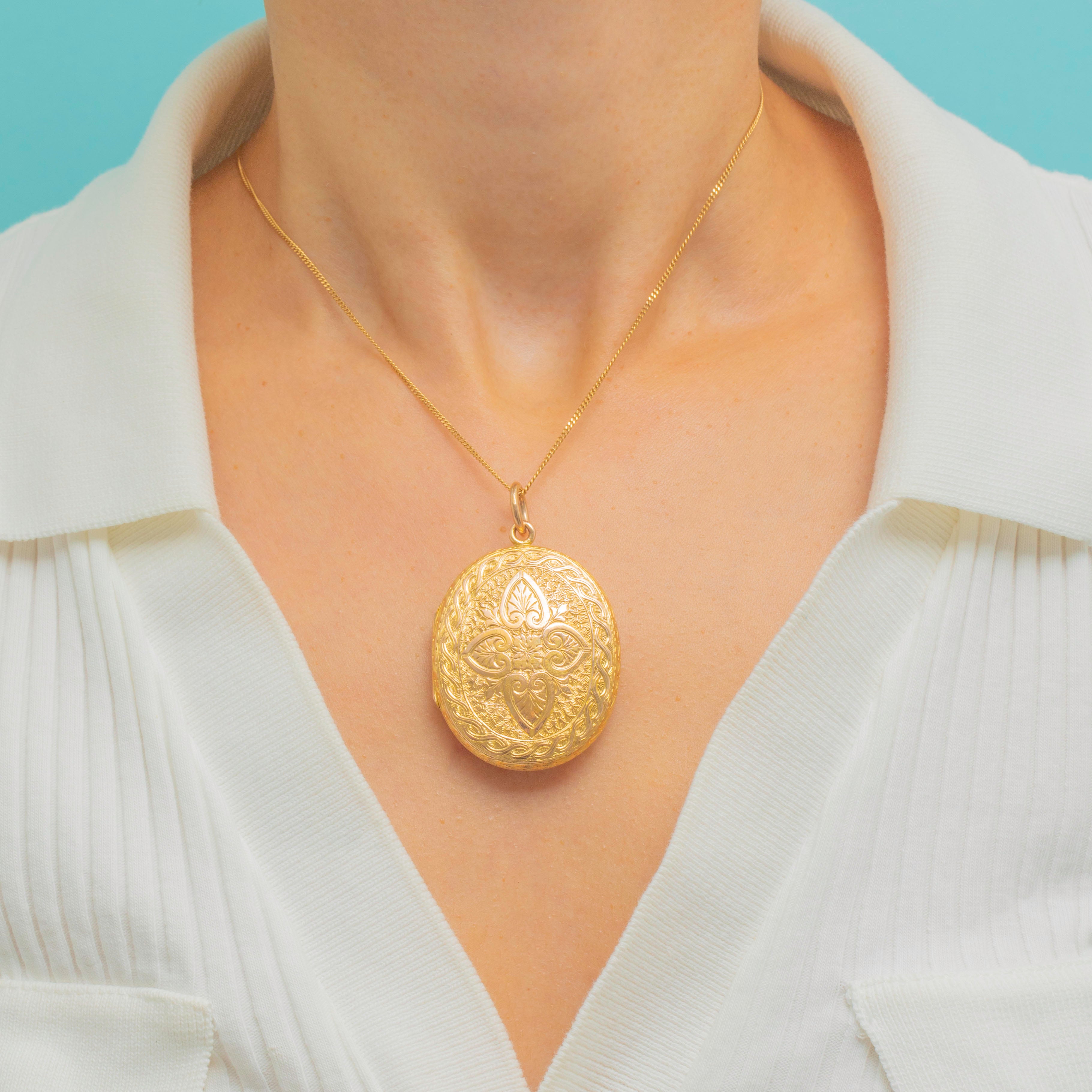 This is a large, solid 15ct Gold Victorian oval locket with richly detailed engraving. The front is worked with foliate scrolls arranged around a central flowerhead, framed by a plaited border. The reverse is densely engraved with flowers and leaves around a shaped cartouche.