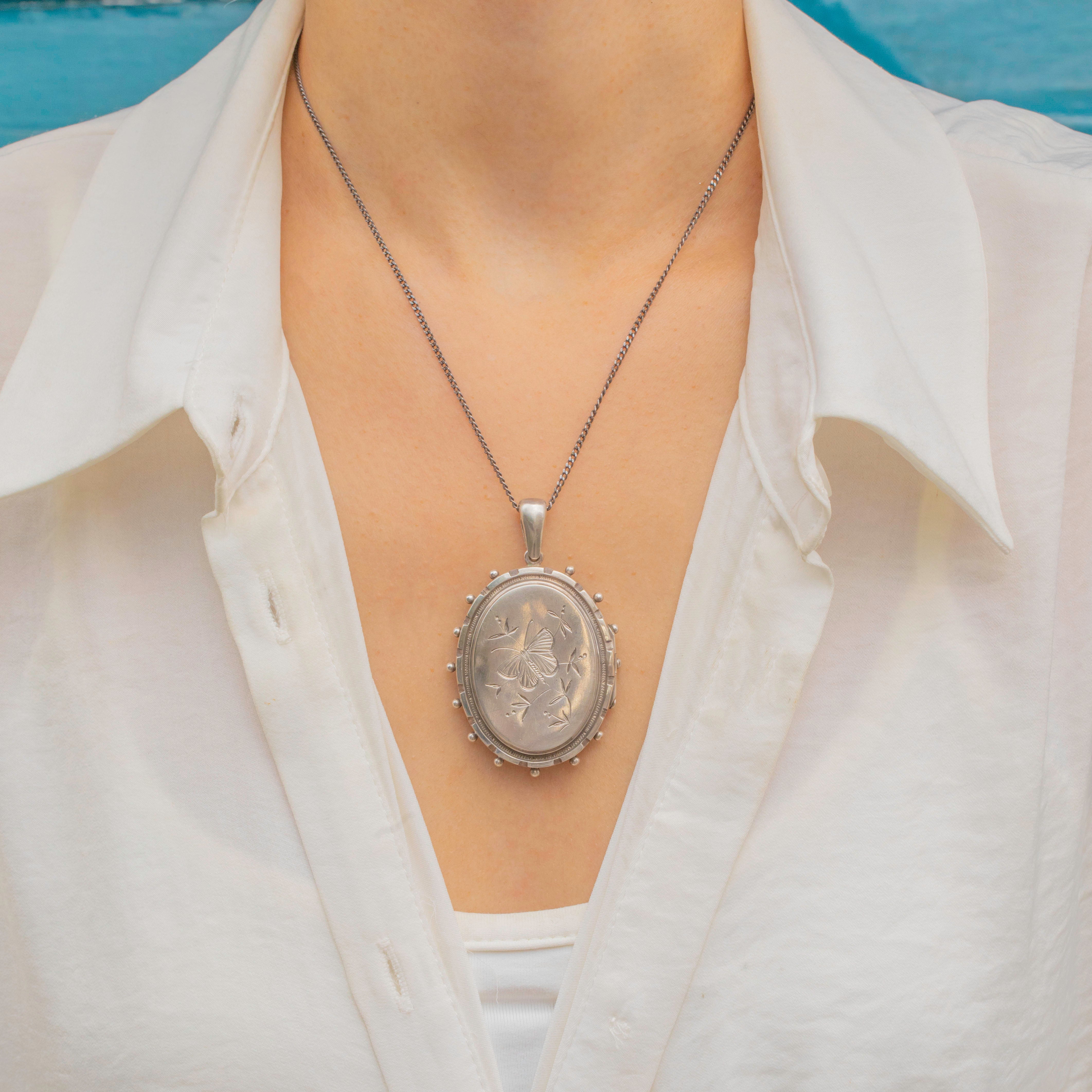 Victorian Sterling Silver Engraved Butterfly Oval Locket, c.1879