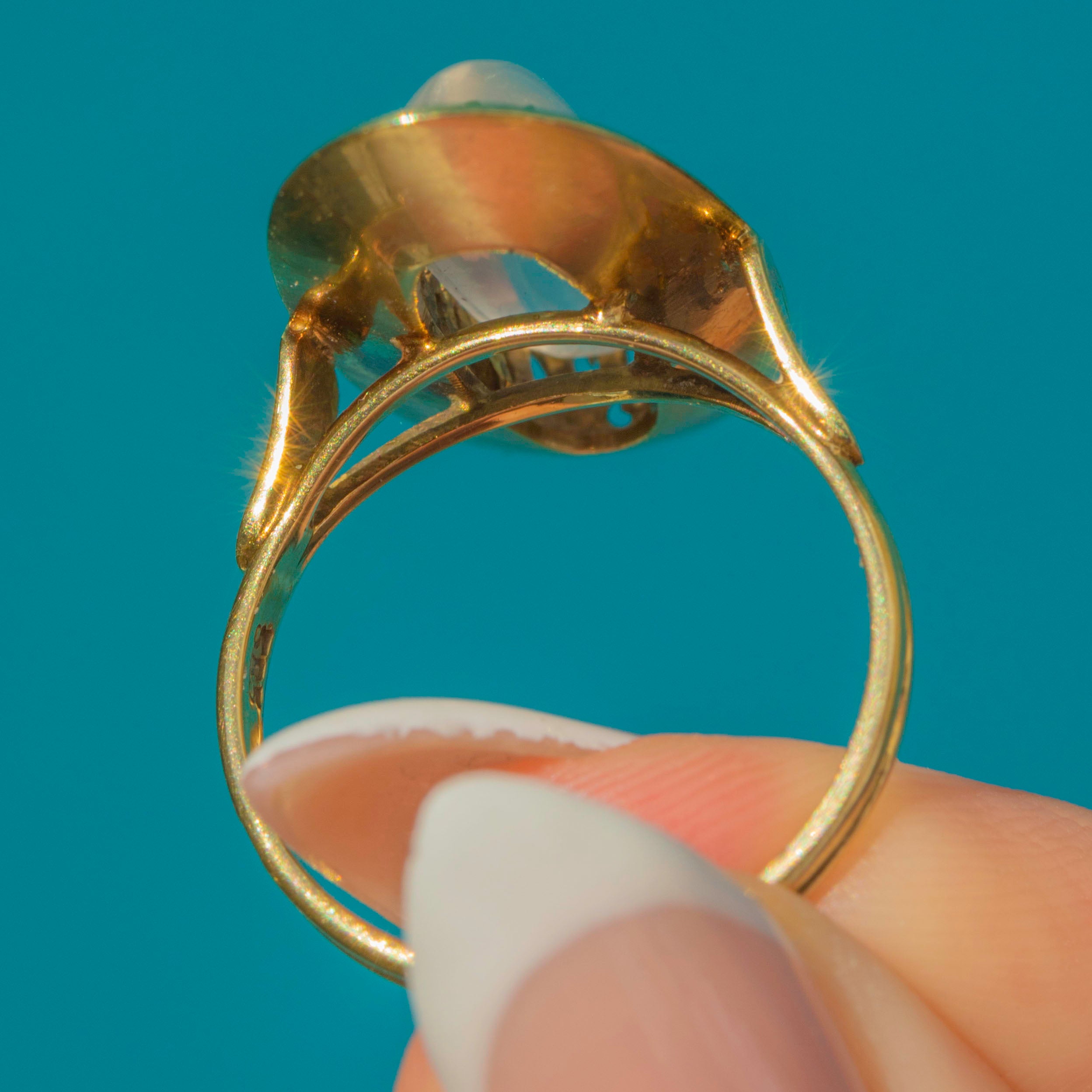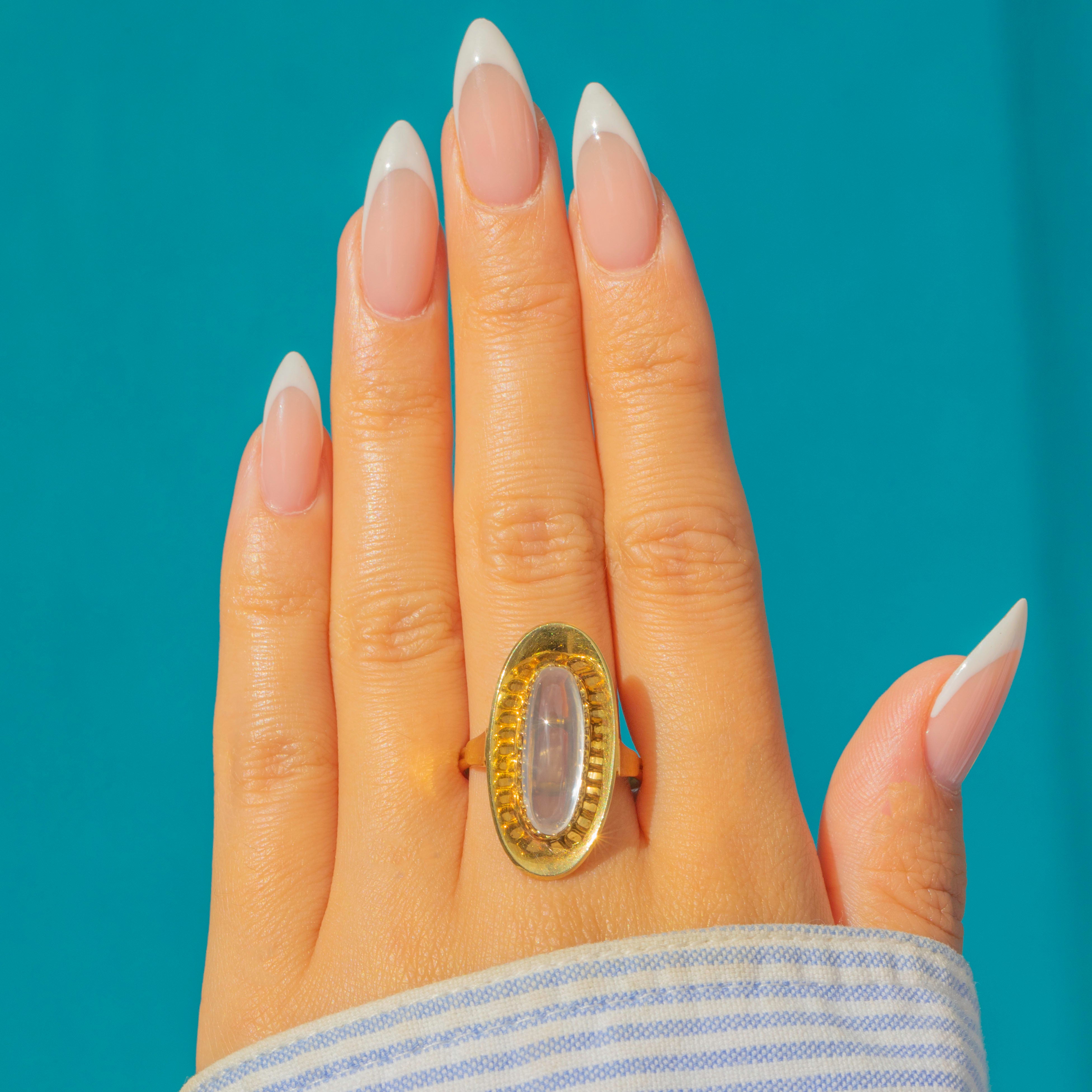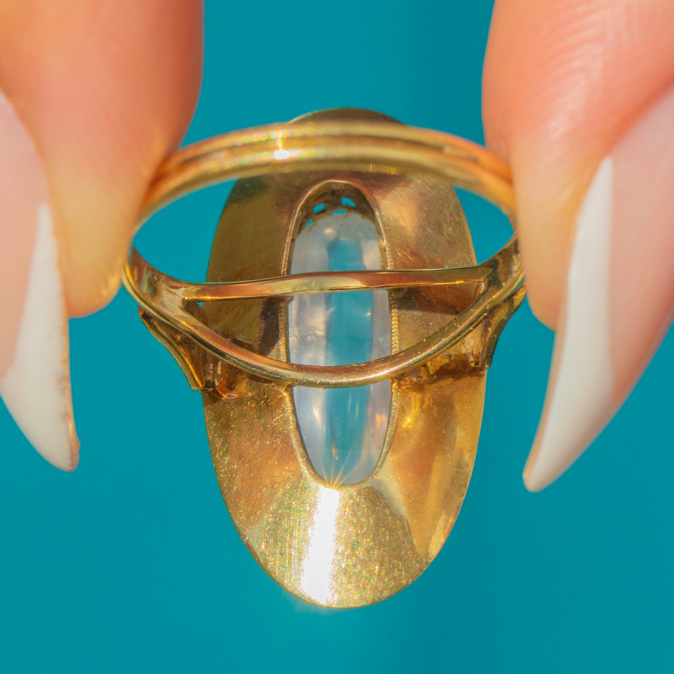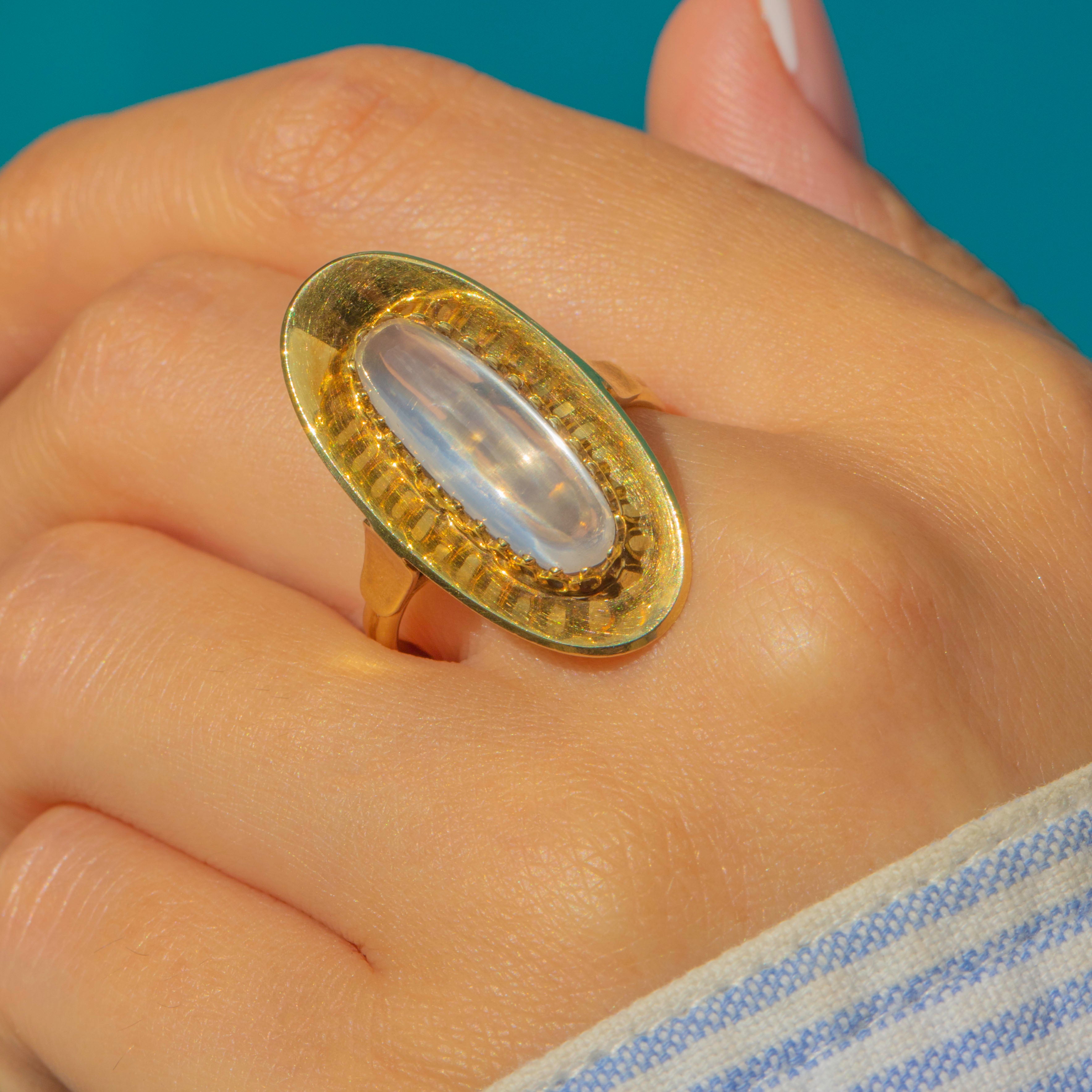 A sleek mid-century Moonstone ring in warm 14ct Gold. The elongated oval cabochon sits within a sculptural plaque with scalloped inner gallery, giving height, glow and unmistakable 1950s presence. Clean lines, great finger coverage, and that dreamy adularescence the era loved.