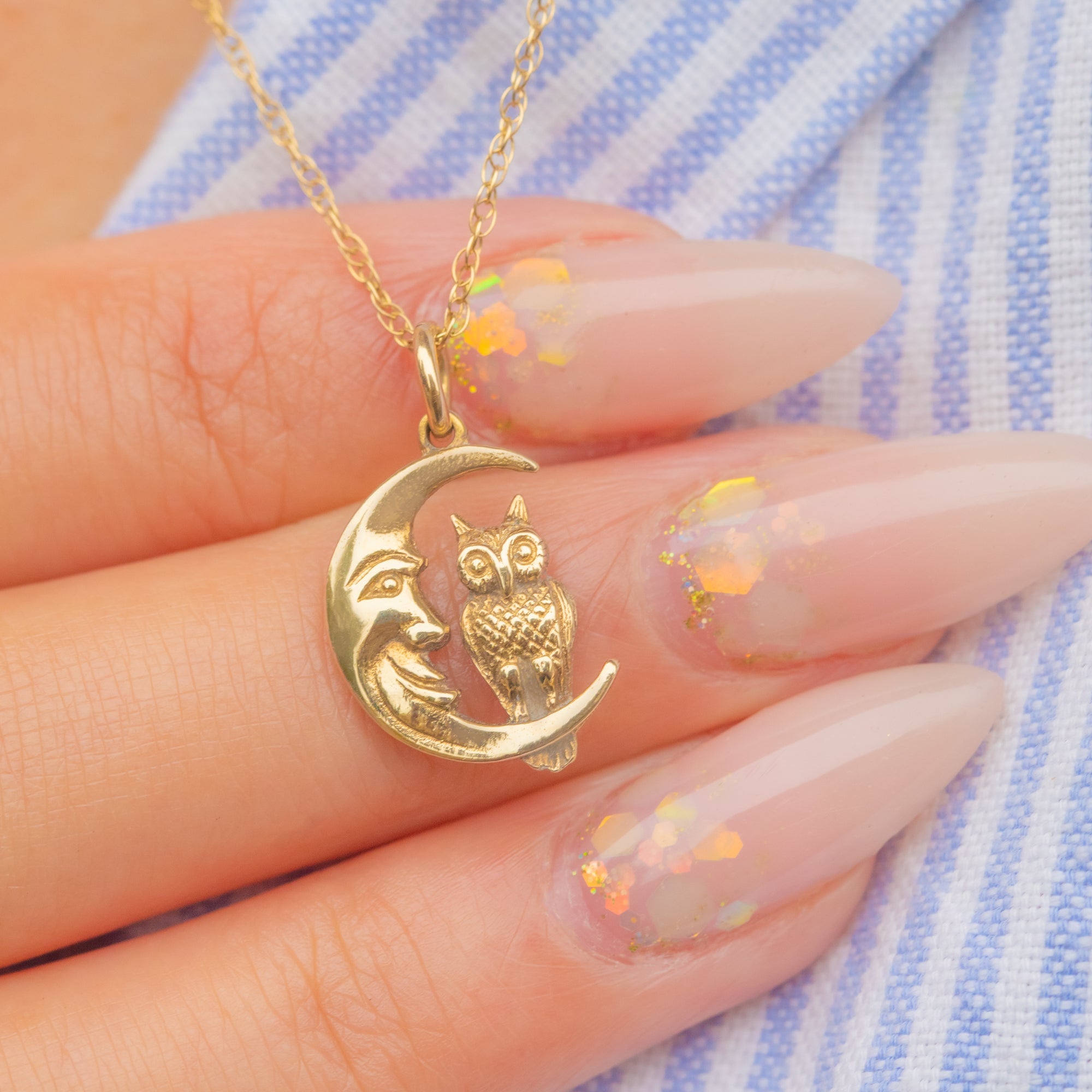 EXCELLENT: Both the charm and chain are in superb condition. The Gold surfaces are bright with no dents or scratches, and the owl and moon details are crisp. The chain is strong and secure, making this necklace ready to wear and enjoy.
