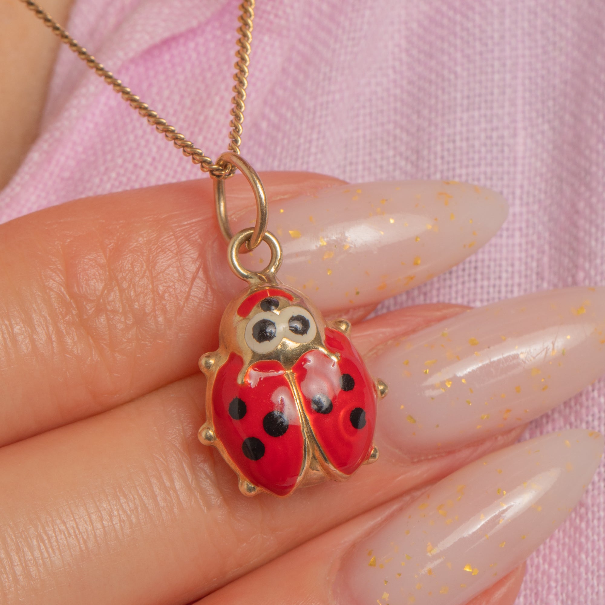 A joyful pop of colour in precious 9ct Gold, this Vintage ladybird charm is puffy and playful with glossy red and black Enamel. The domed body shows split wing covers dotted in black with sweet eye detail, delivering that irresistible, graphic look we all love.