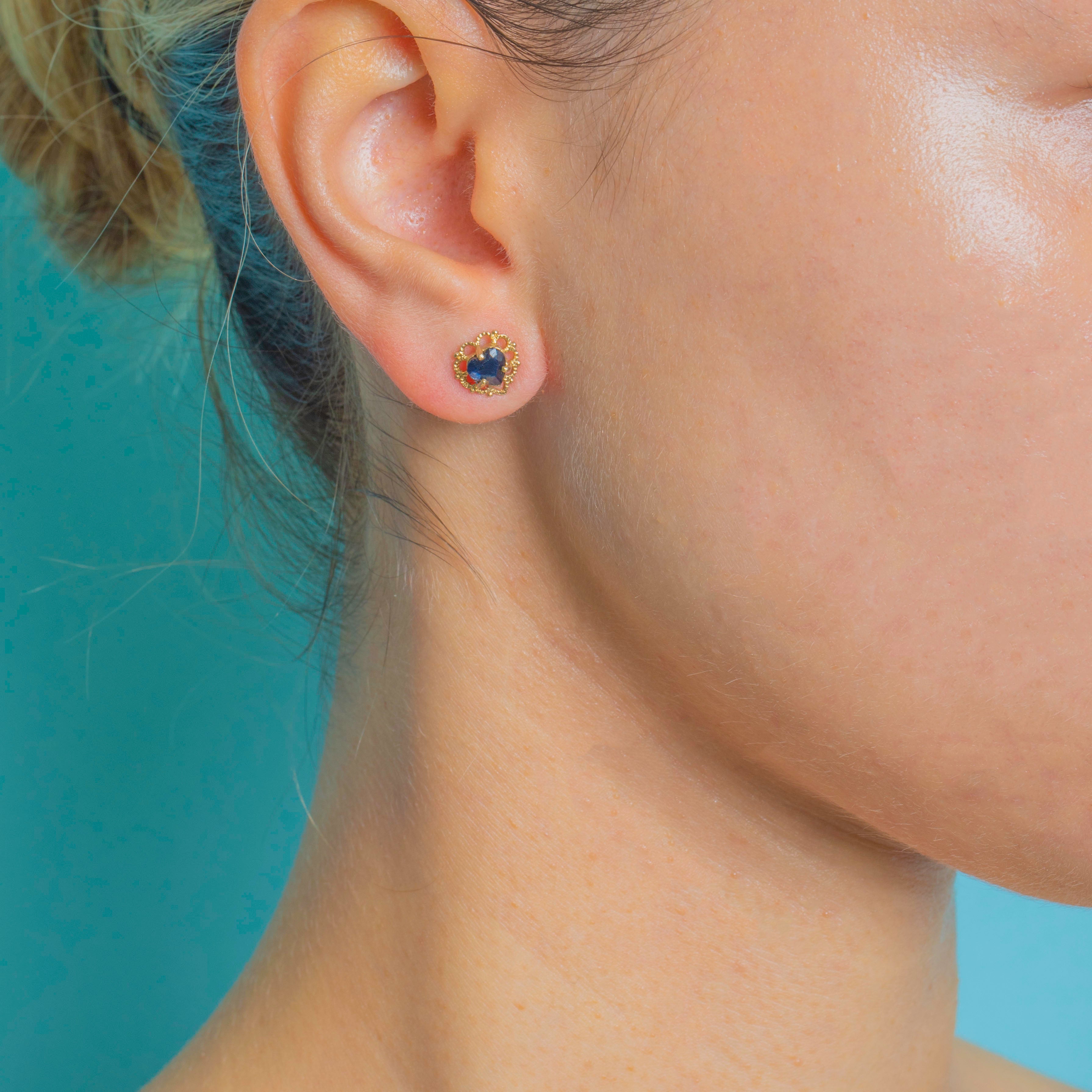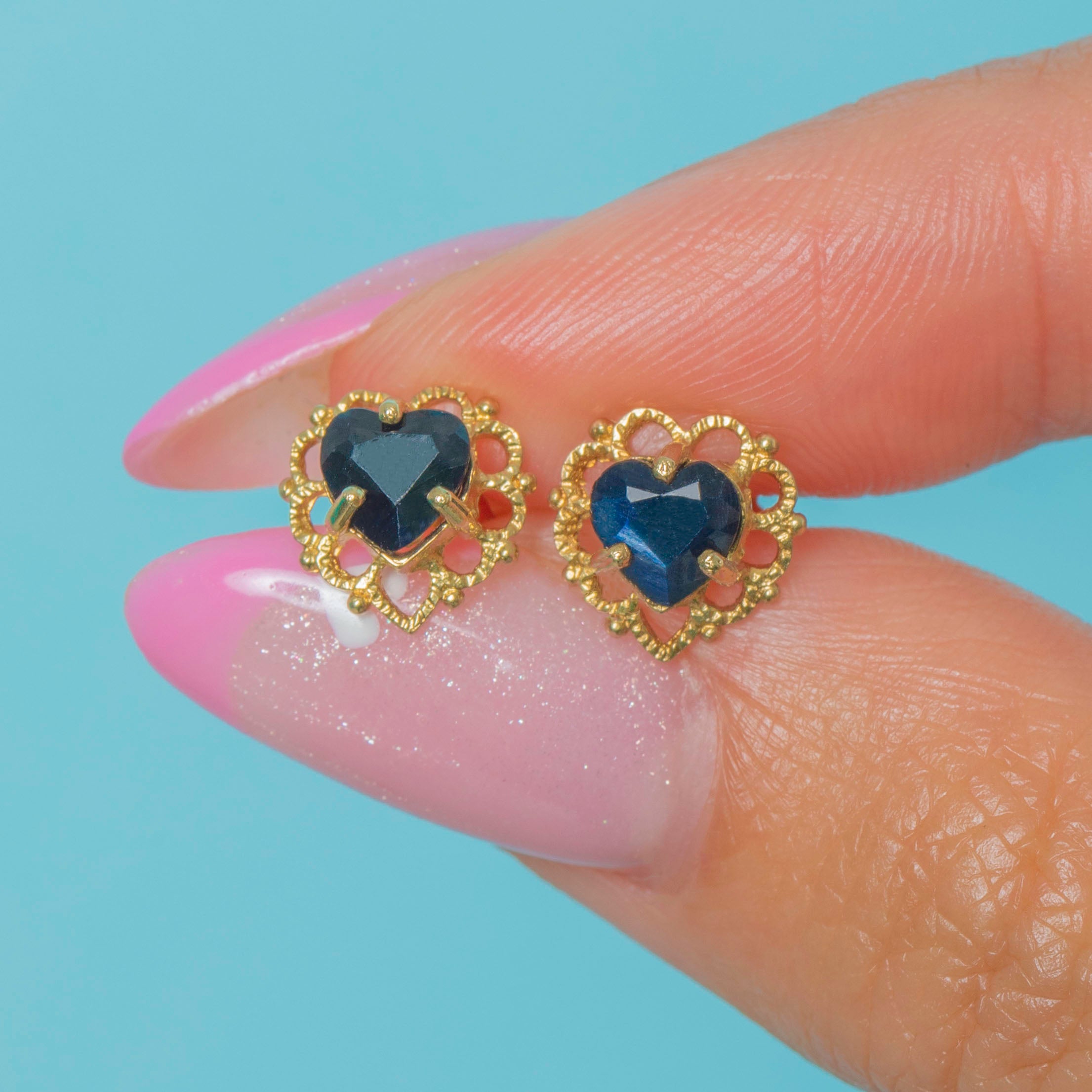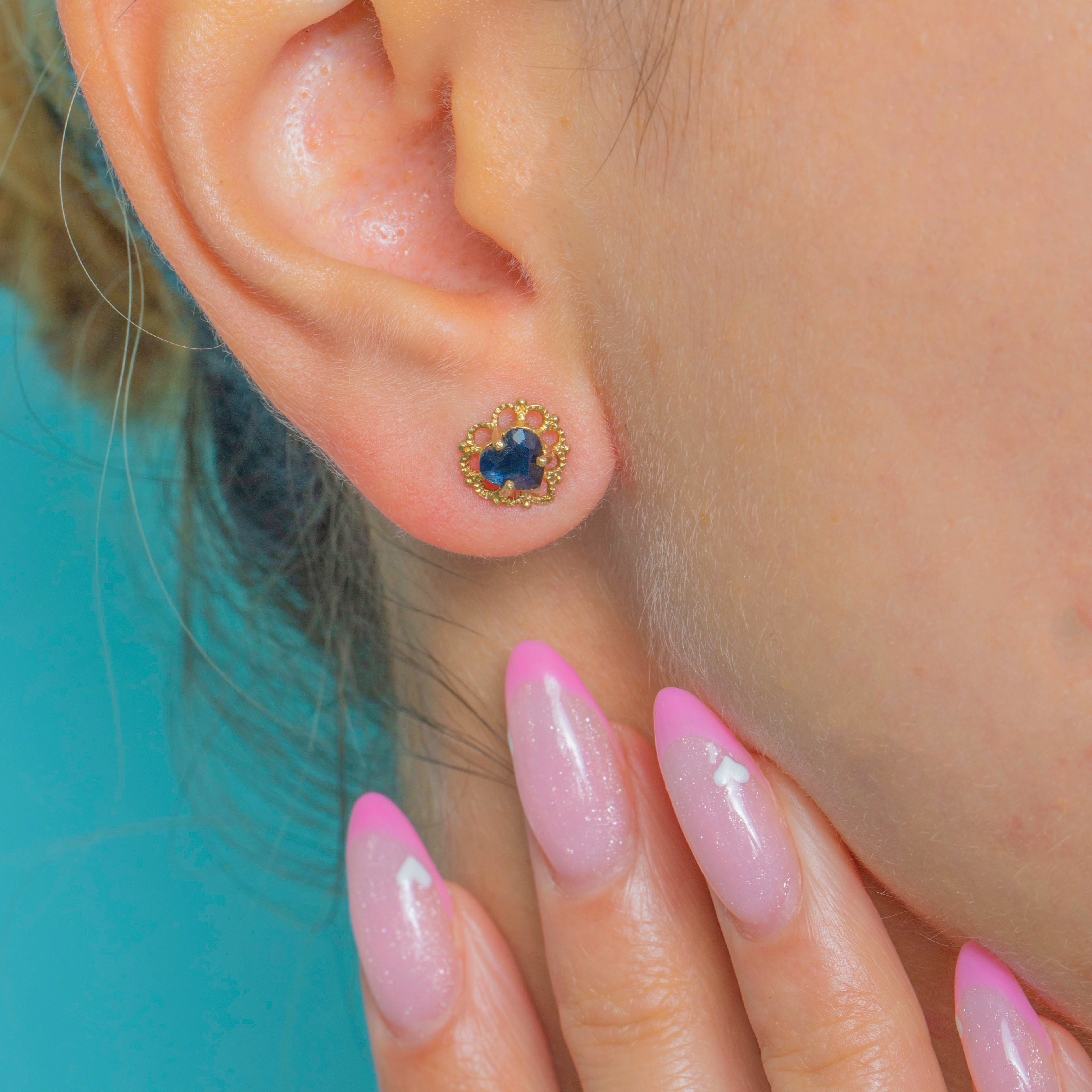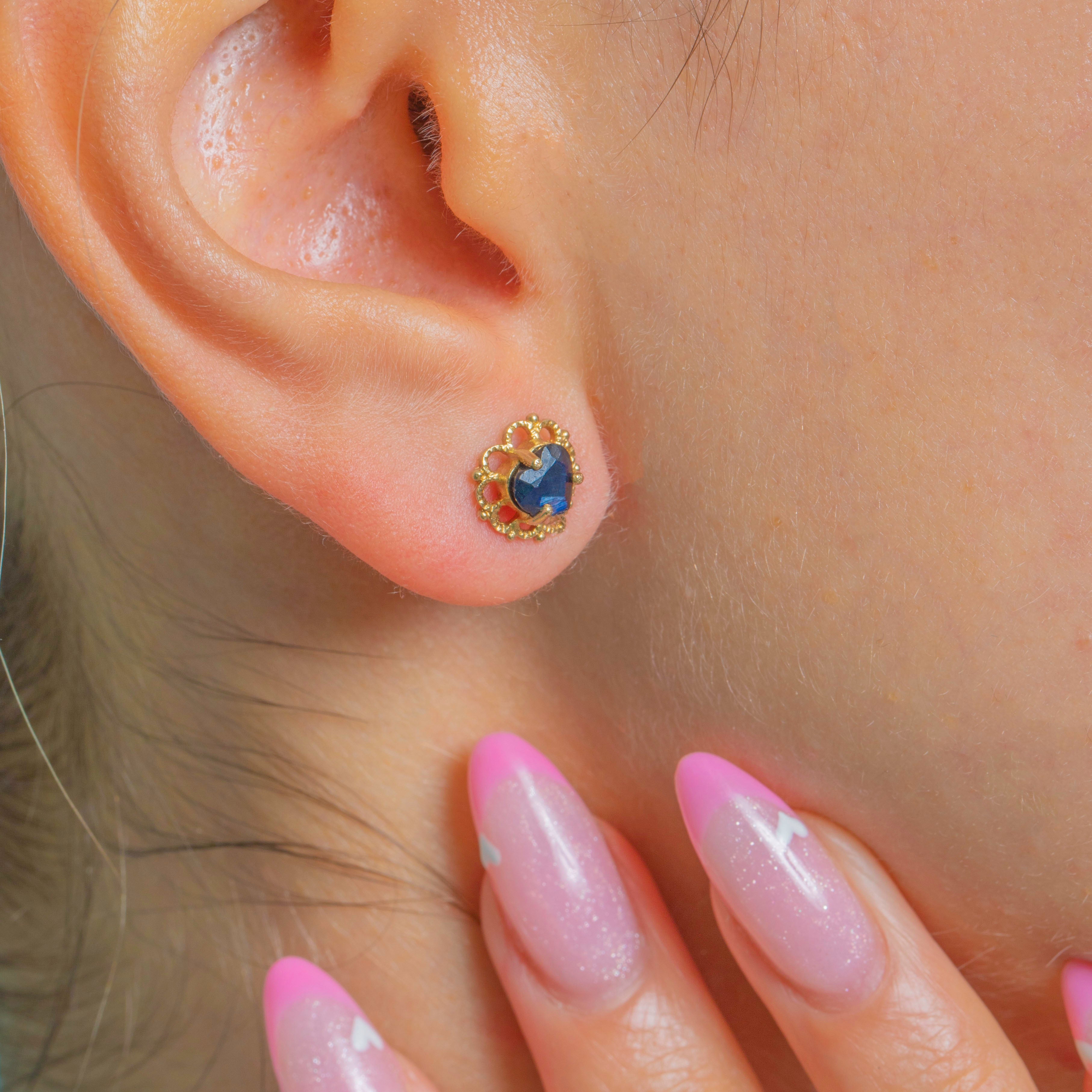 A charming pair of Vintage Sapphire heart stud earrings crafted in 9ct Gold. Each earring features a vivid blue, 0.50ct heart-shaped natural Sapphire securely set in warm yellow Gold.