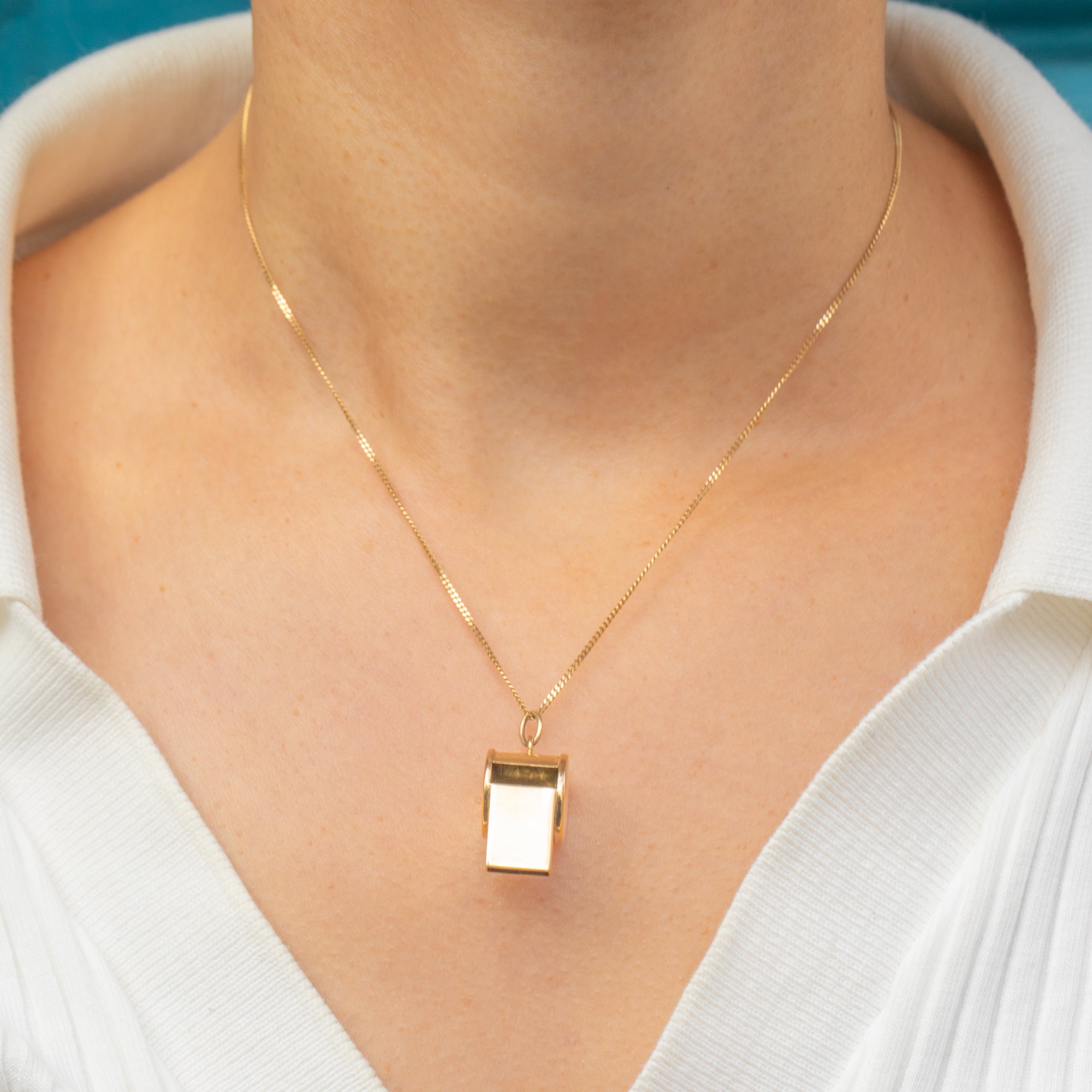 This charming Vintage 9ct Gold whistle pendant will make a playful and luxurious addition to any charm collection. Crafted in solid 9ct Gold and stamped “375” with the maker’s mark “EL”, it has a lovely warm Yellow tone and a satisfying little presence on the chain.