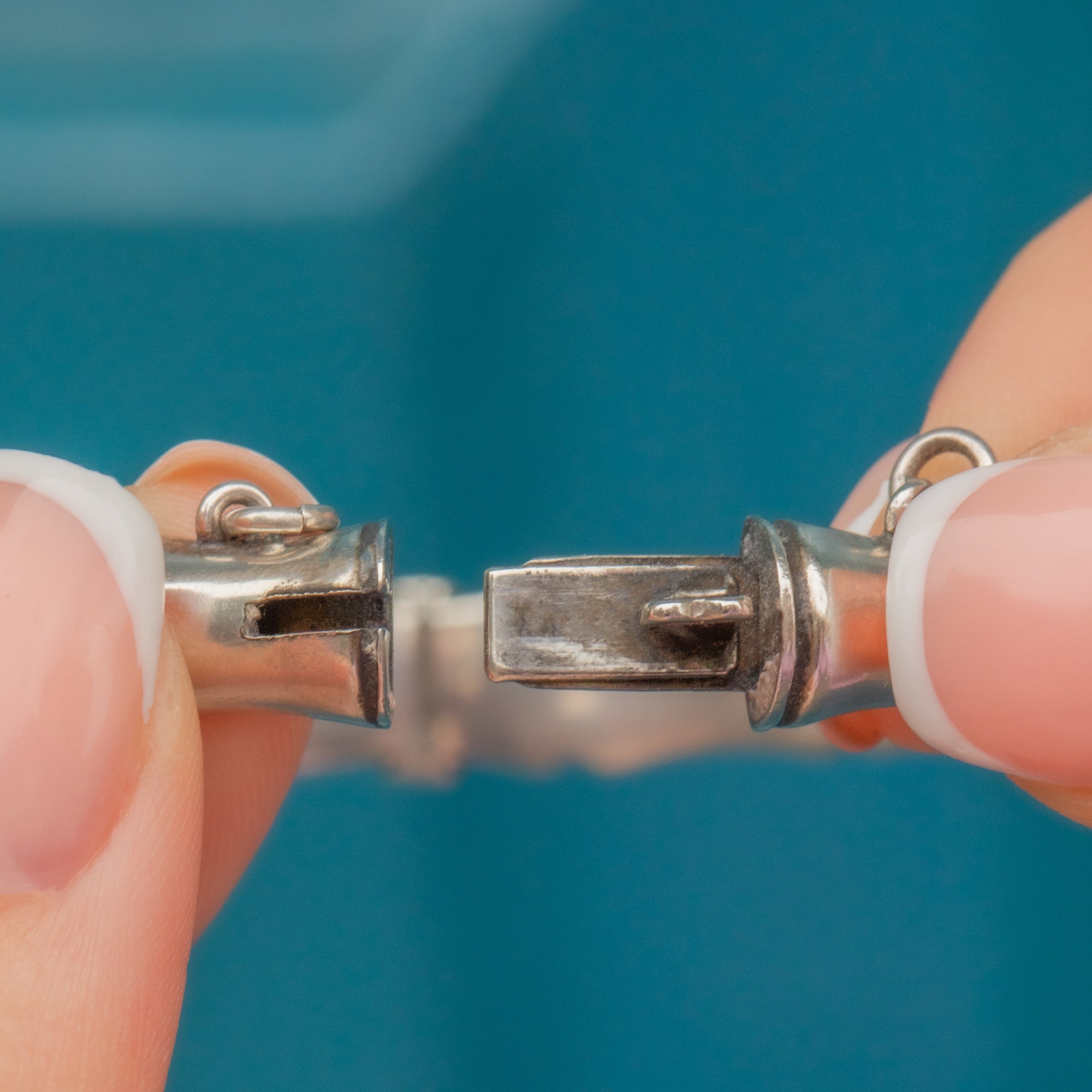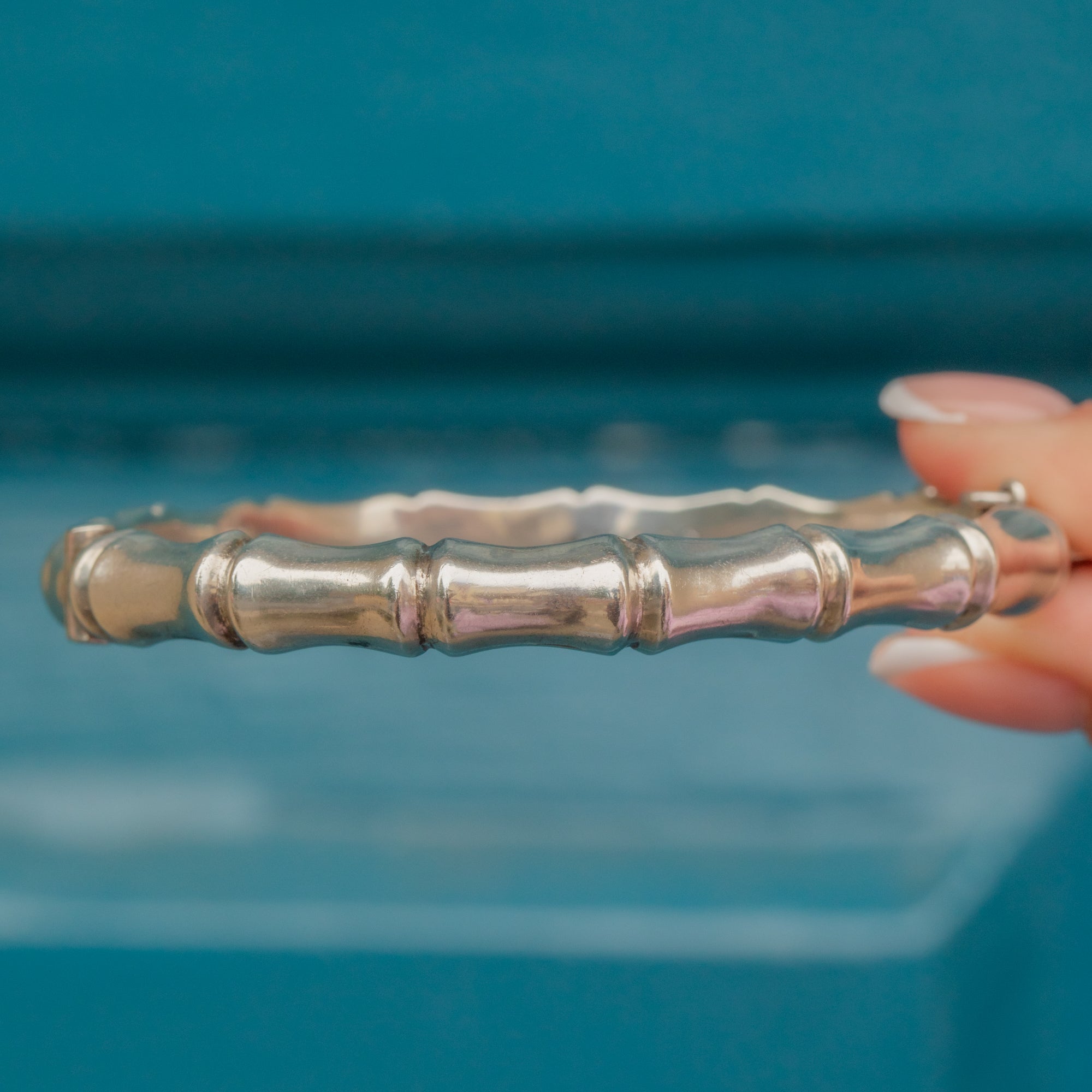 VERY GOOD-EXCELLENT. This Sterling Silver bamboo bangle is in wonderful condition. Aside from a few light dings around her circumference, the Silver is mainly bright and lustrous with some darkening in the grooves adding to her antique charm. She closes securely with the option to add a safety chain yourself if desired. The hallmarks are crisp and date this piece to 1977.