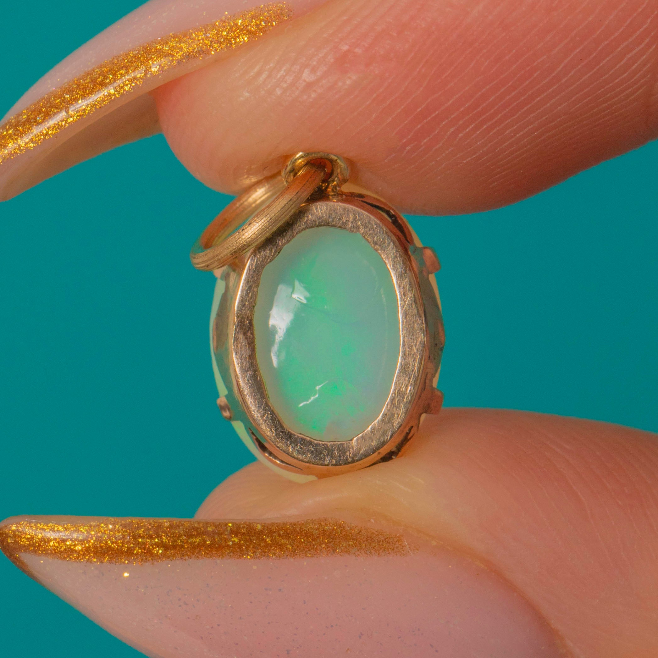 This exquisite Art Deco Opal charm is an iridescent beauty. The solid 1.43ct Opal glows with vivid flashes of green, pink, and orange, shimmering beautifully from every angle.