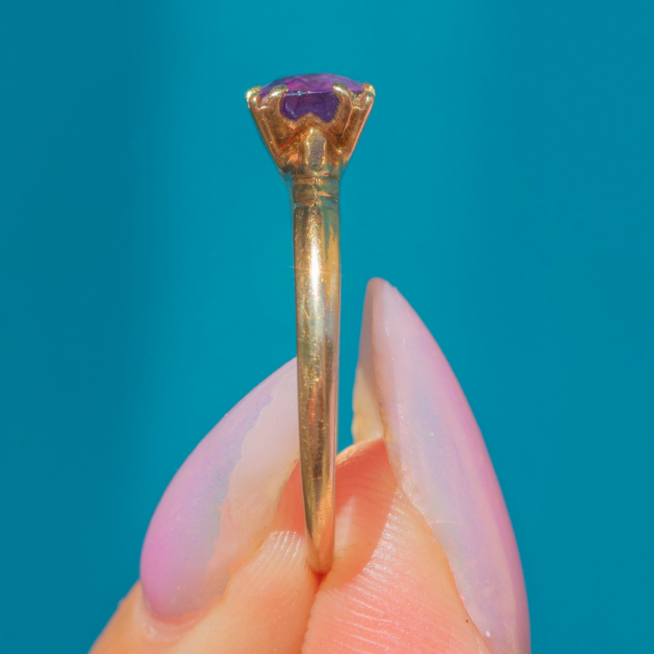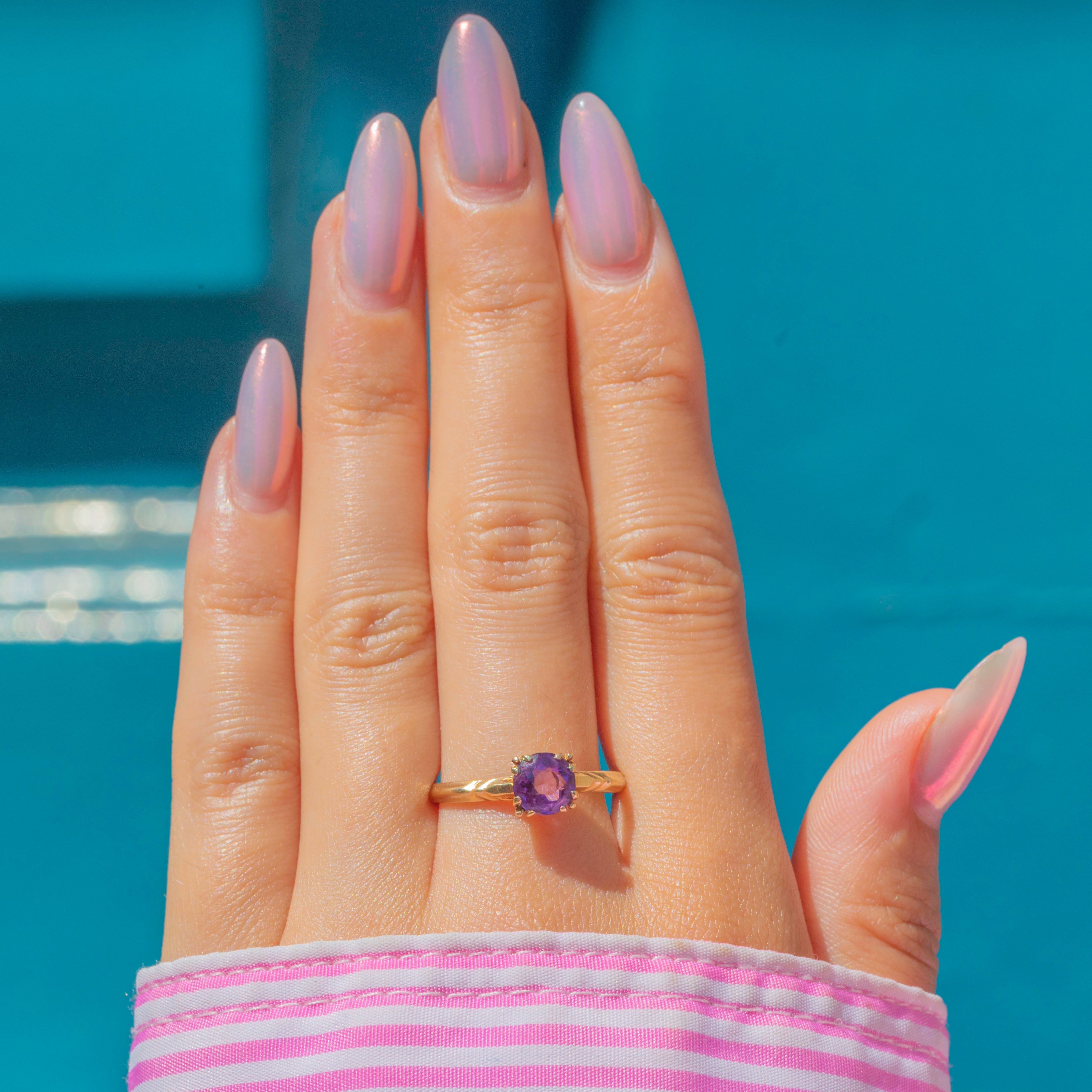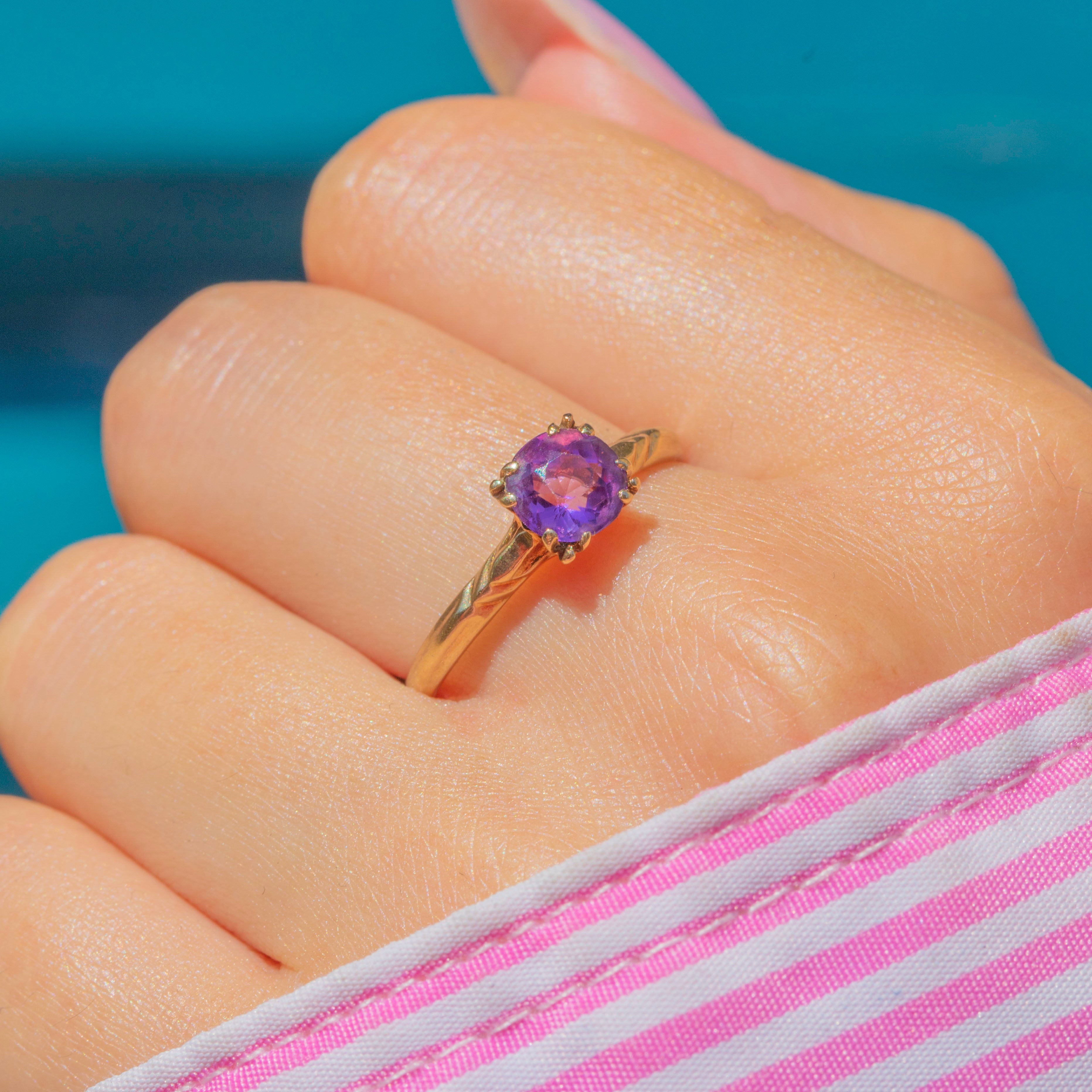 EXCELLENT: The Amethyst is plump and saturated, free from any scratches or nibbles. It's held securely by glossy 10ct Gold claws and complete with a comfortable band, allowing for confident wear.