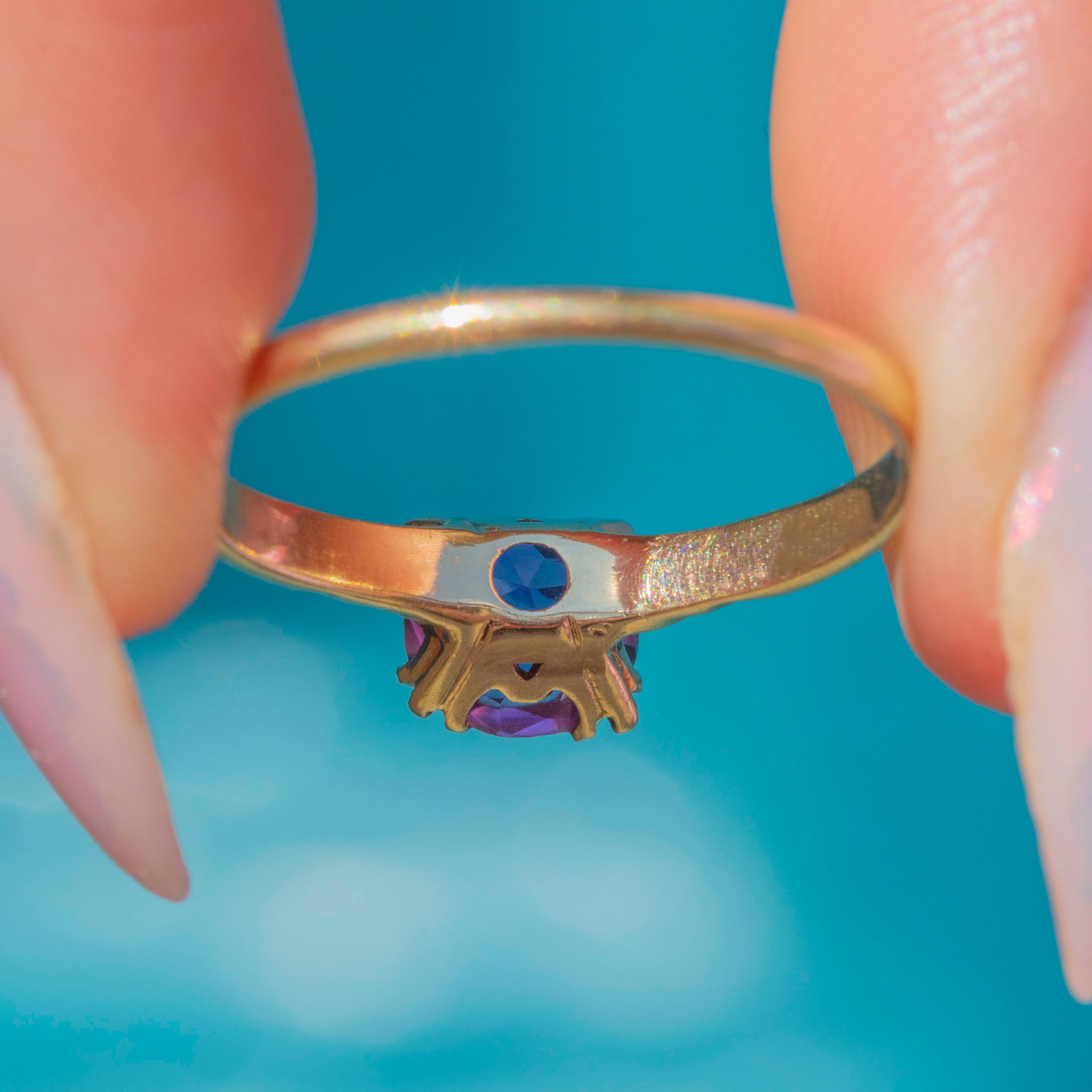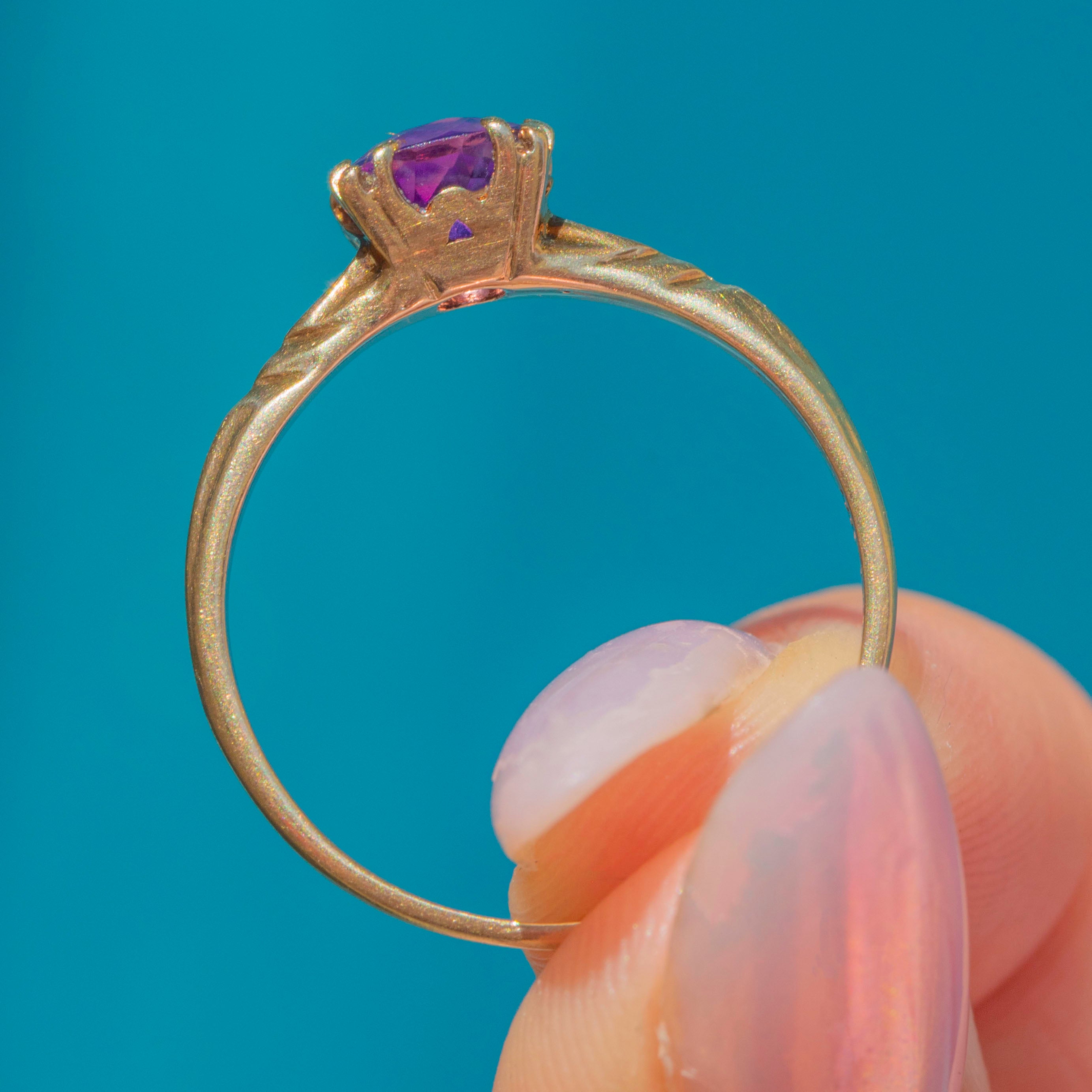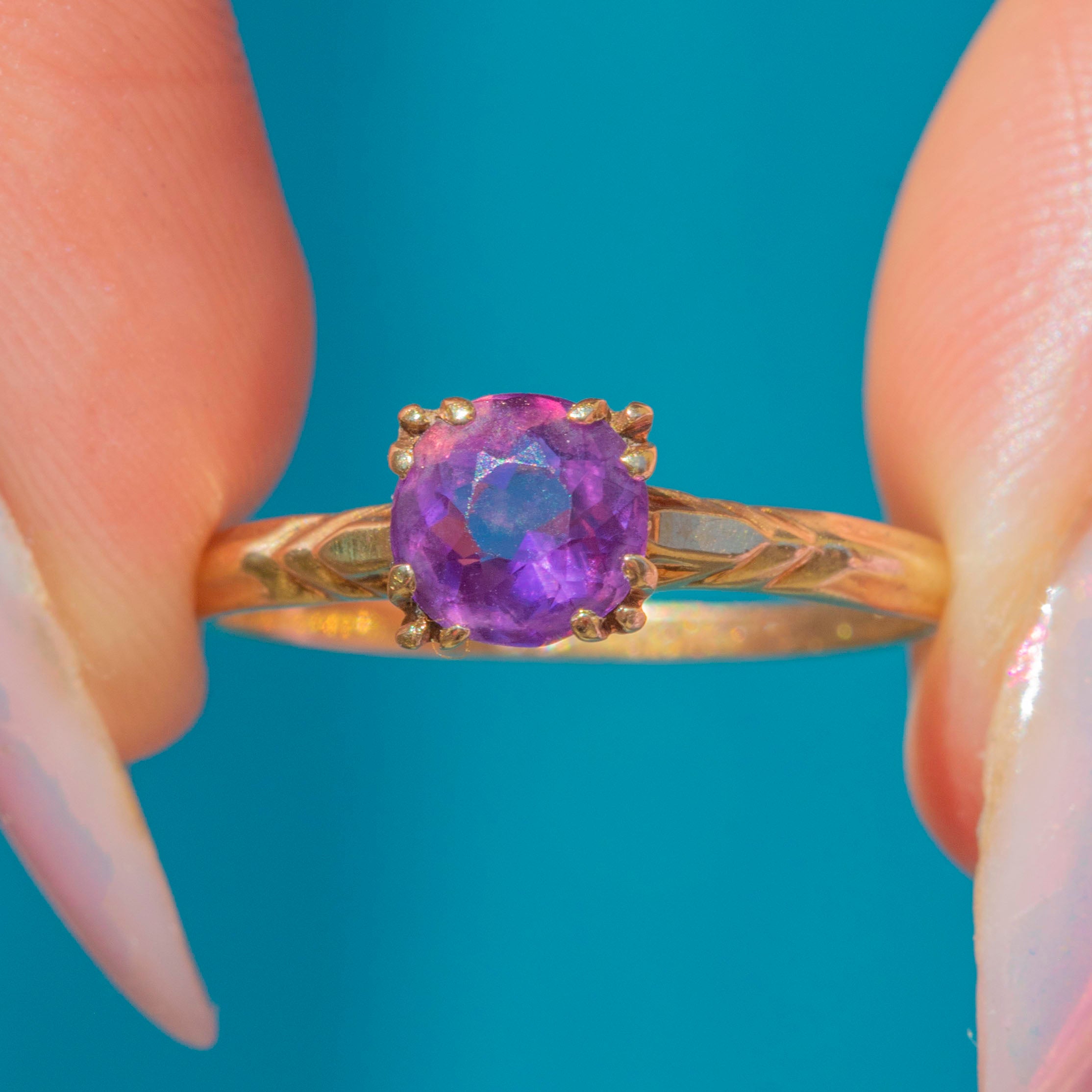 EXCELLENT: The Amethyst is plump and saturated, free from any scratches or nibbles. It's held securely by glossy 10ct Gold claws and complete with a comfortable band, allowing for confident wear.