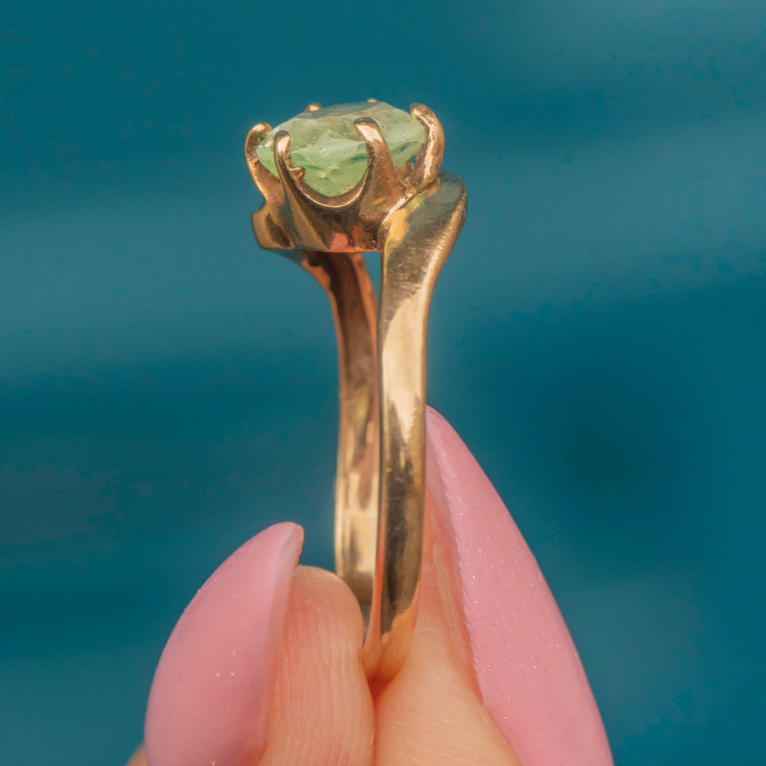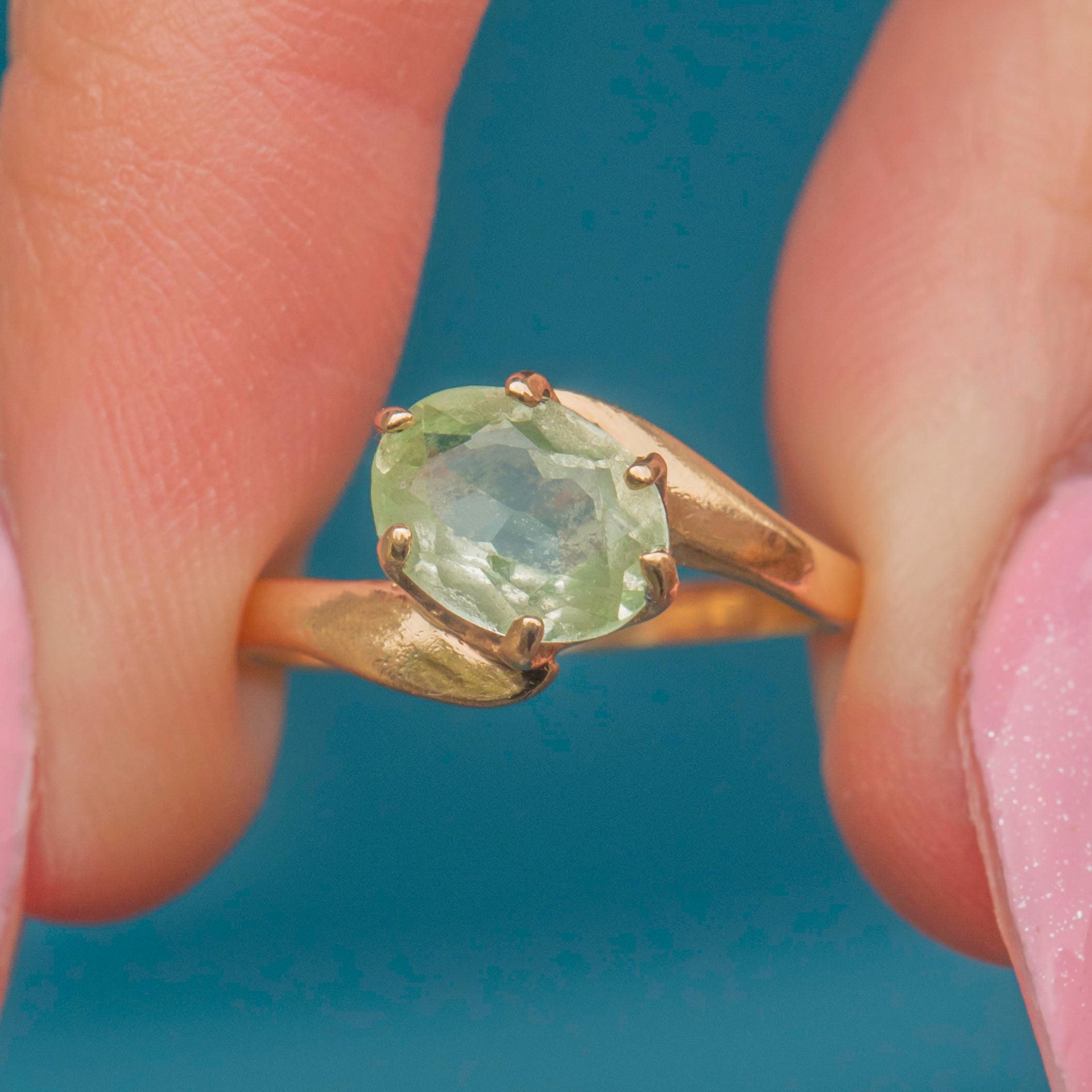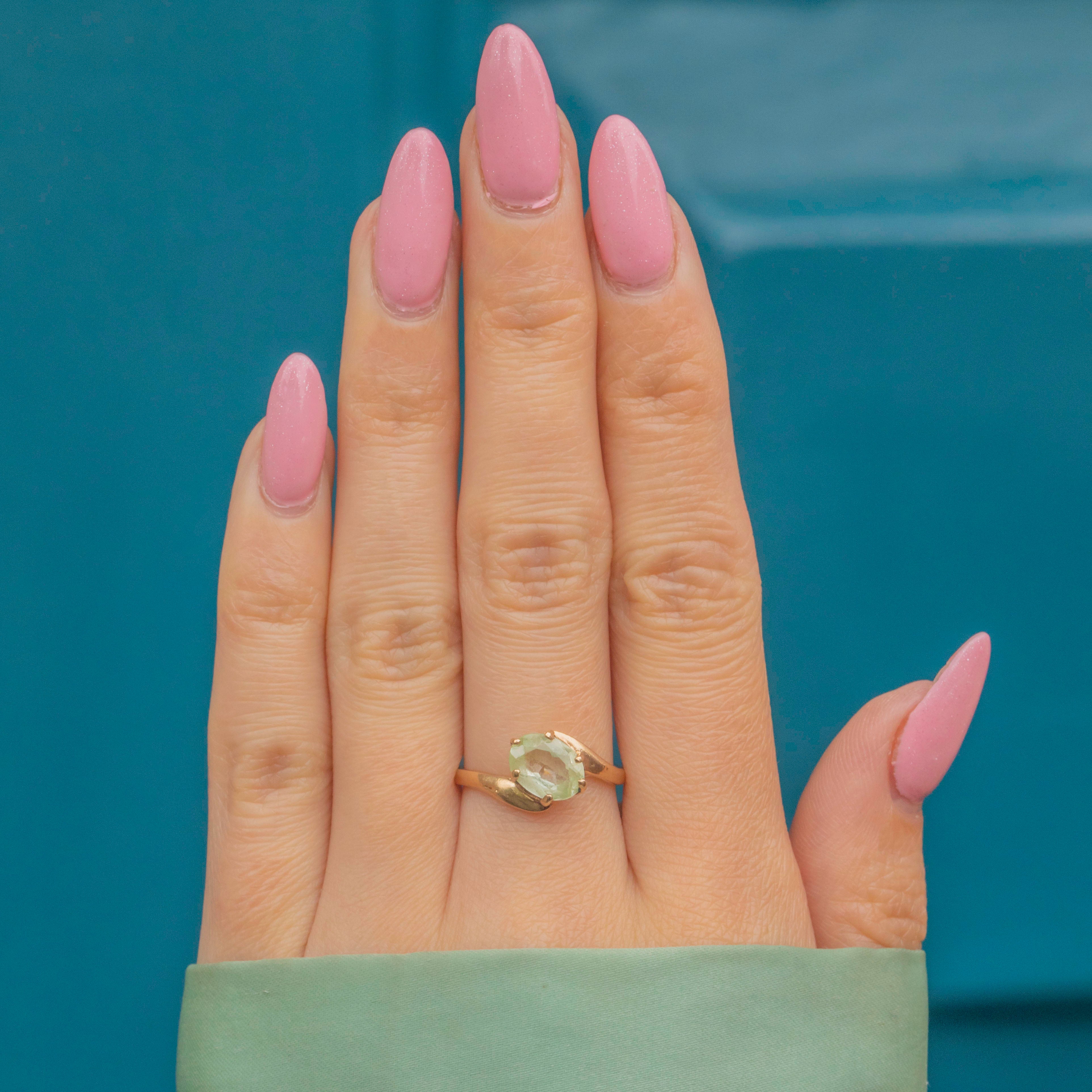 This 10ct Gold Green Spinel bypass ring is a charming mid-century treasure! The Spinel shimmers with mint green hues as it moves in the light, displayed proudly on the finger in sumptuous 10ct Gold claws.