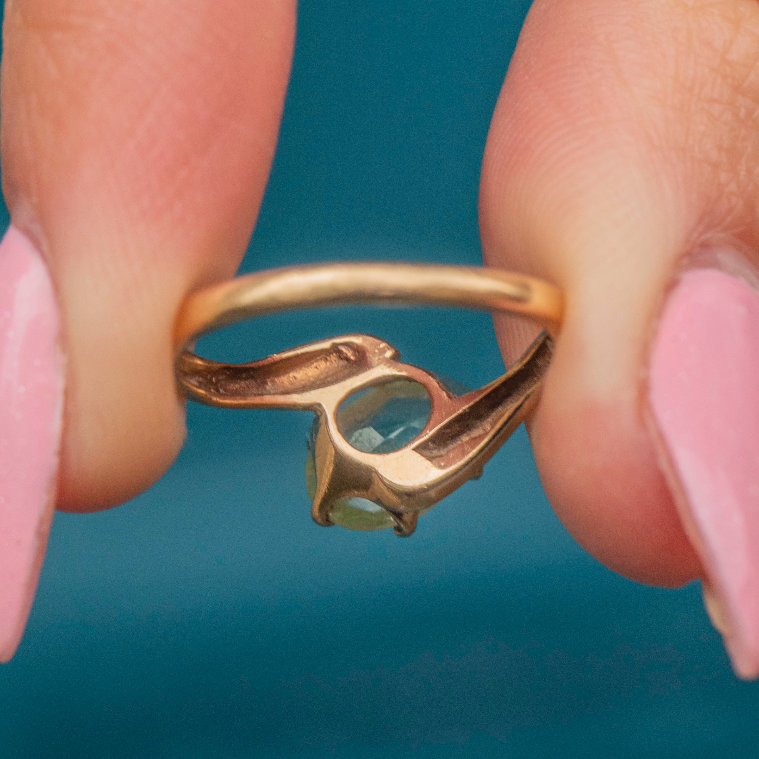 VERY GOOD: This 10ct Gold Green Spinel bypass ring is in lovely condition. The Green Spinel has crisp facets that dance in the light and while there is a few abrasions on the surface of the Spinel, this is only visible under close inspection The Gold is bright and buttery, and the band has kept its form well, with a few scratches and scuffs but nothing too untoward, providing comfortable wear!