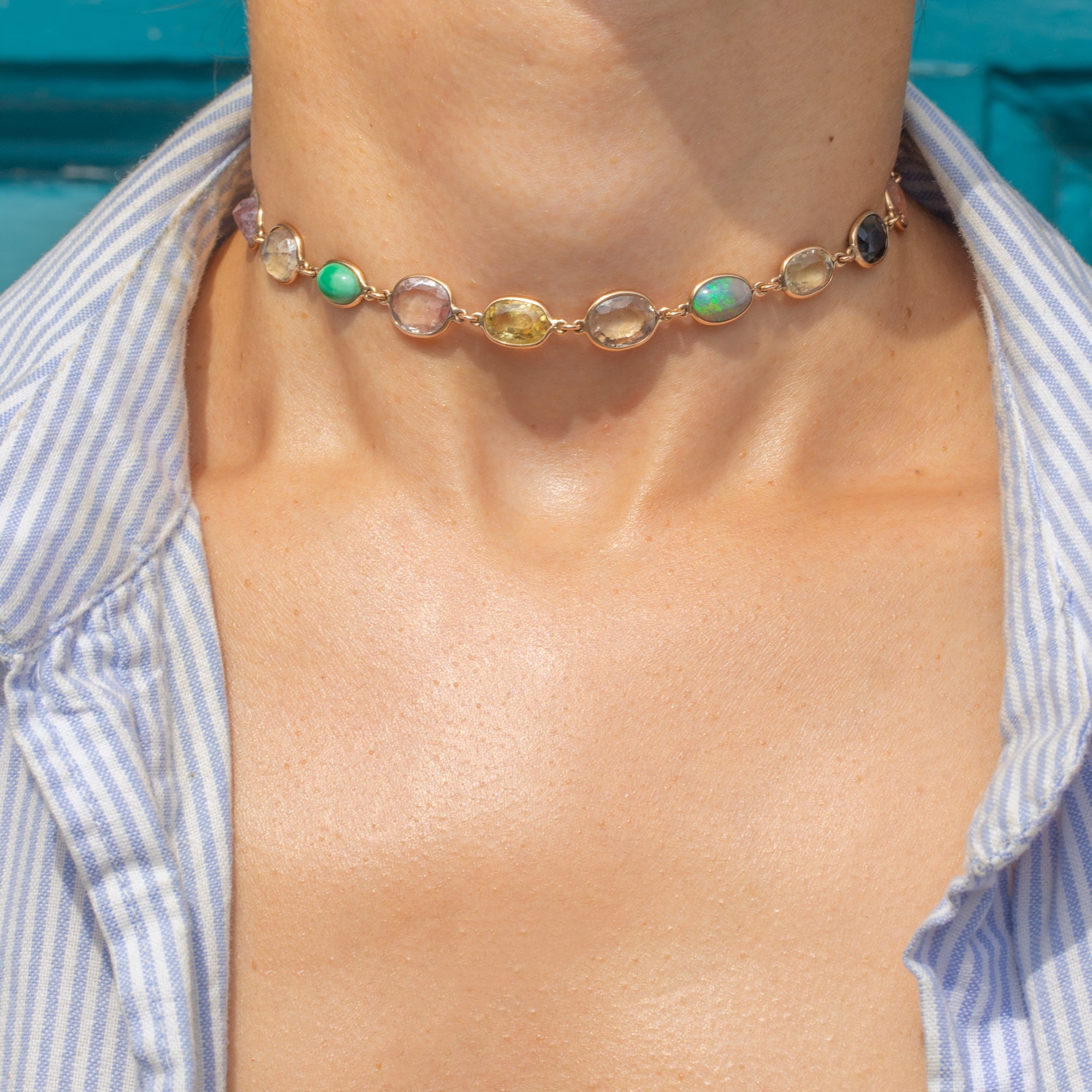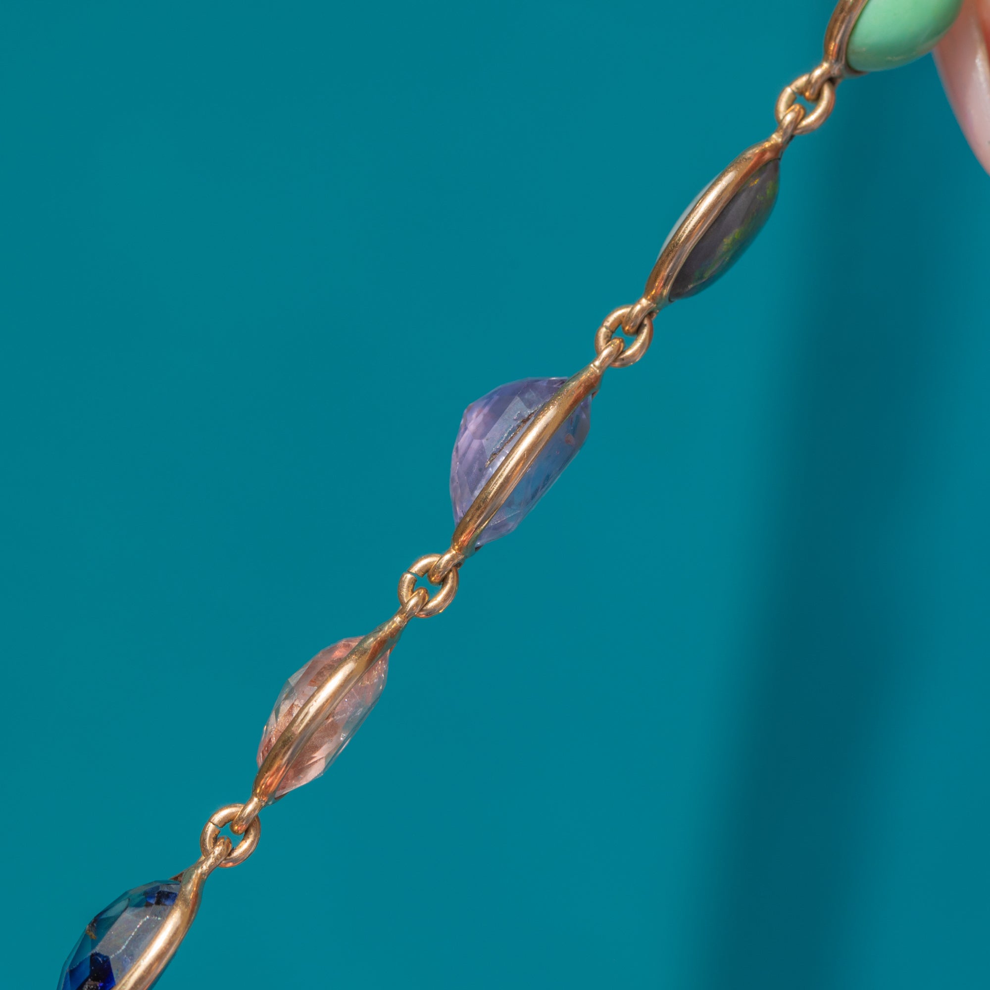 This antique Harlequin necklace extender is a resplendent piece, comprised of a myriad of pastel toned gemstones, including Ametrine, black Opals, Turquoise and a variety of natural Sapphires!