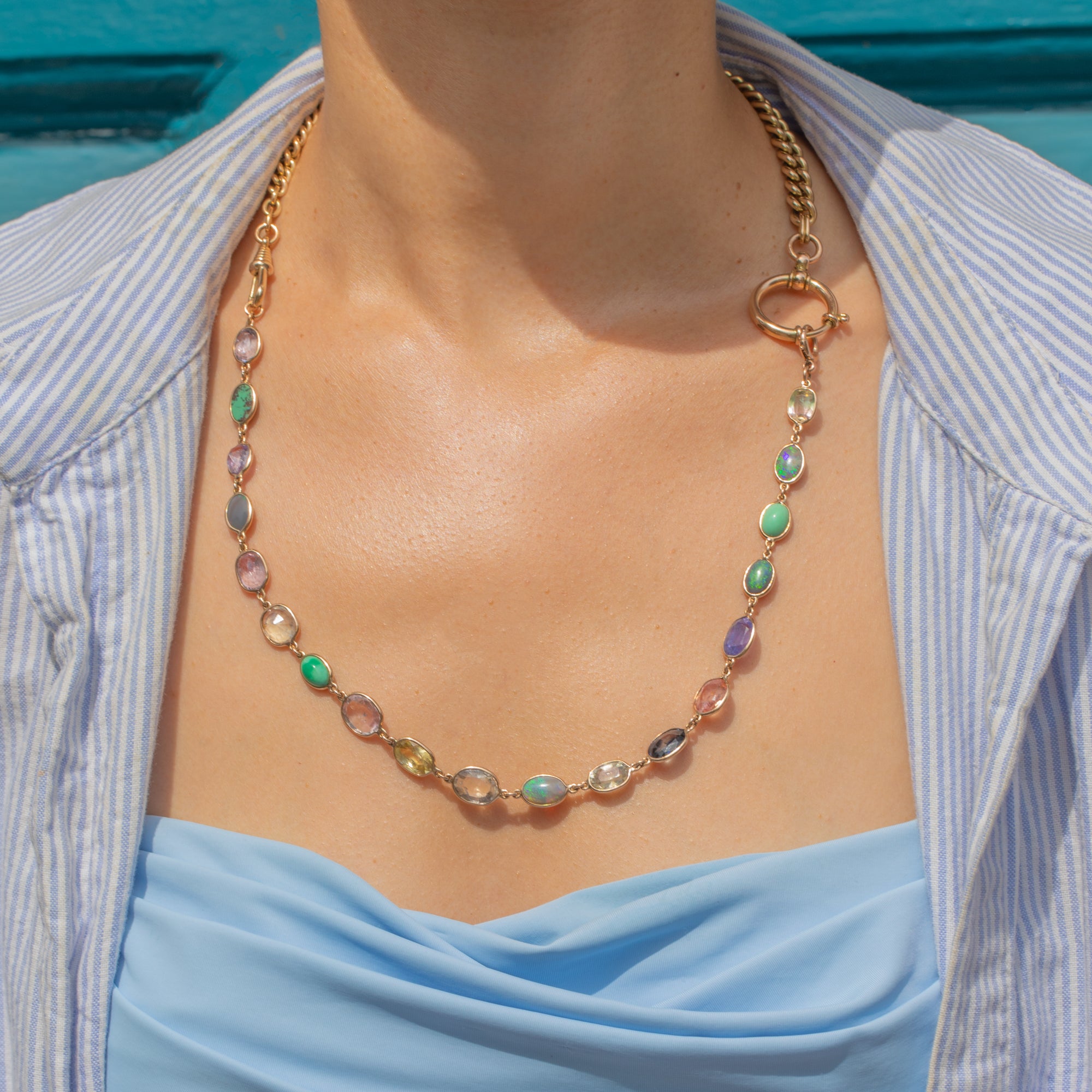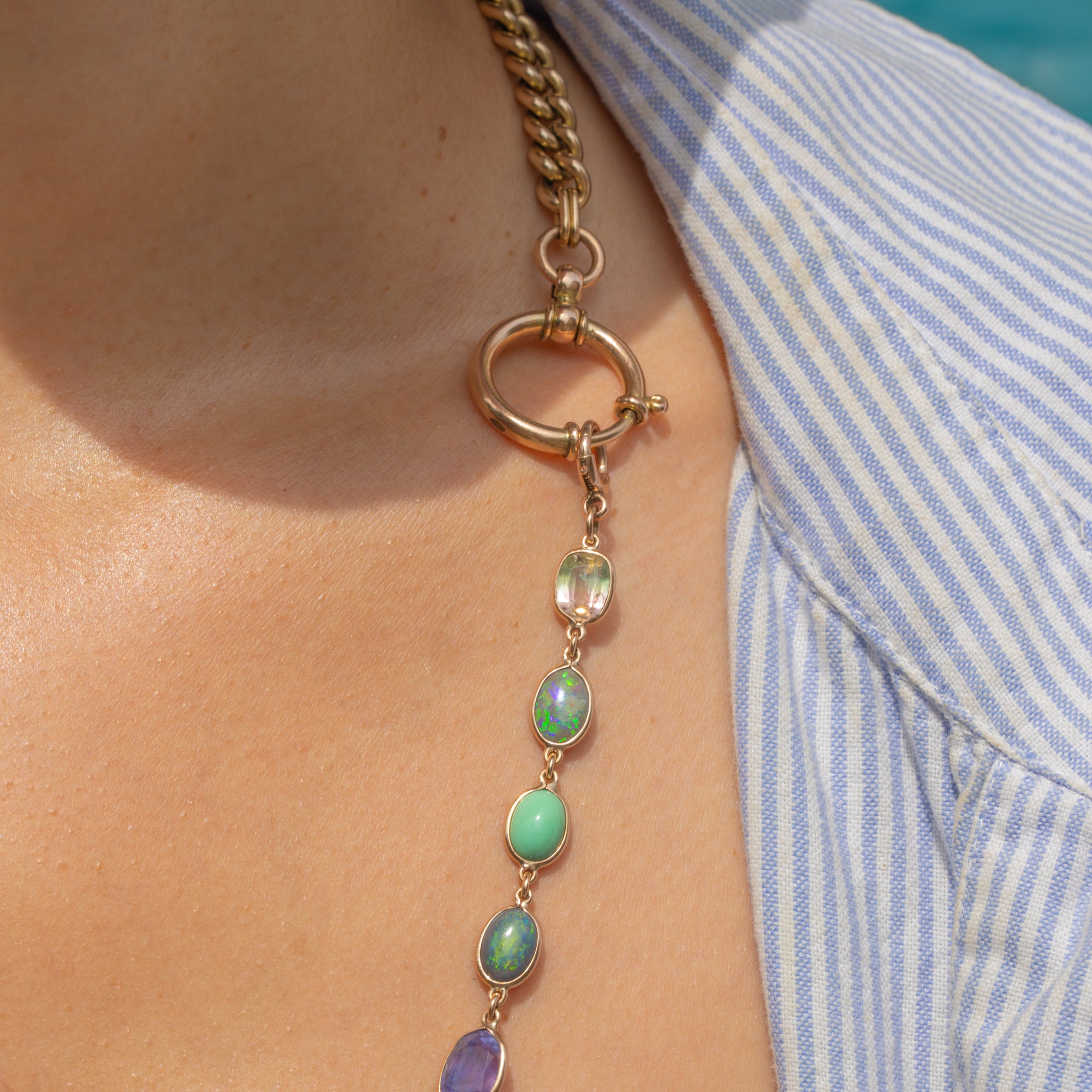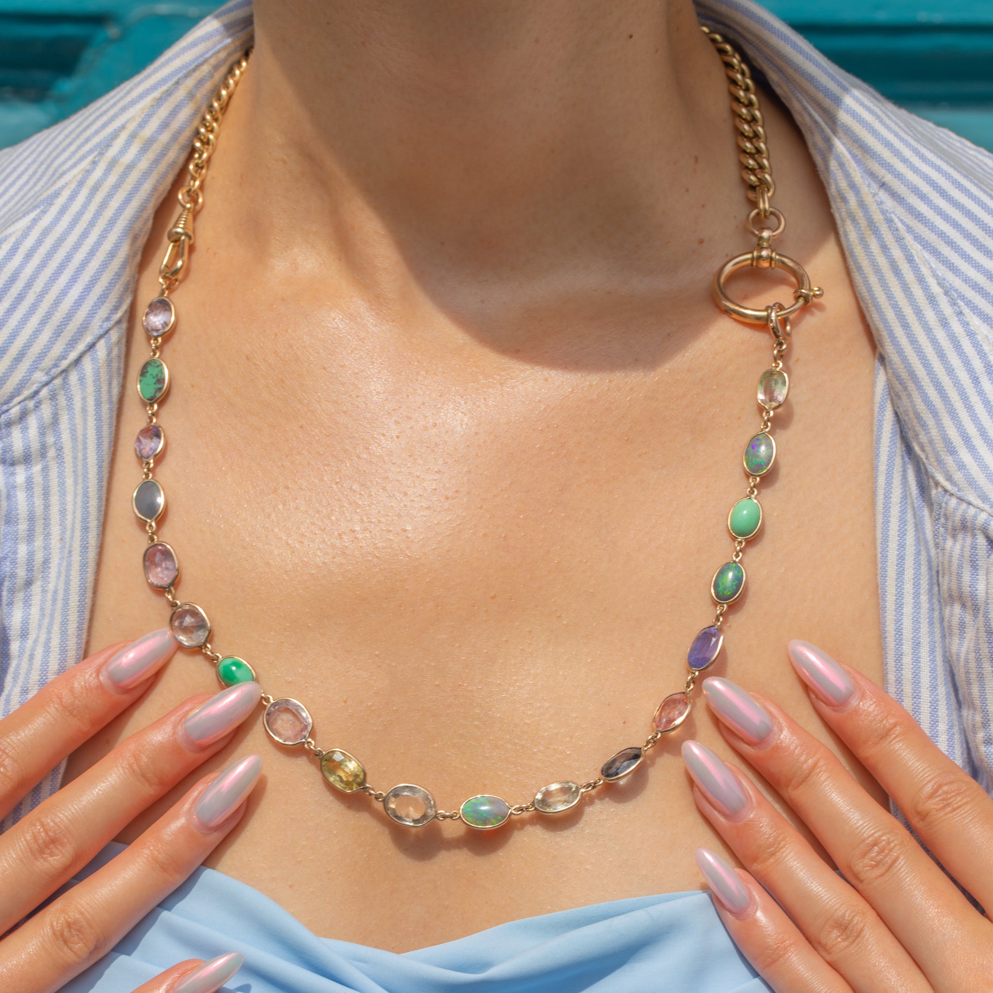 The Sapphires display a spectrum of soft hues—from lilac and lavender to yellow and blue—totalling 26.10 carats combined. Each gemstone is elegantly set within a polished 9ct Gold bezel and connected by a finely crafted links, complete with a large antique bolt ring.
