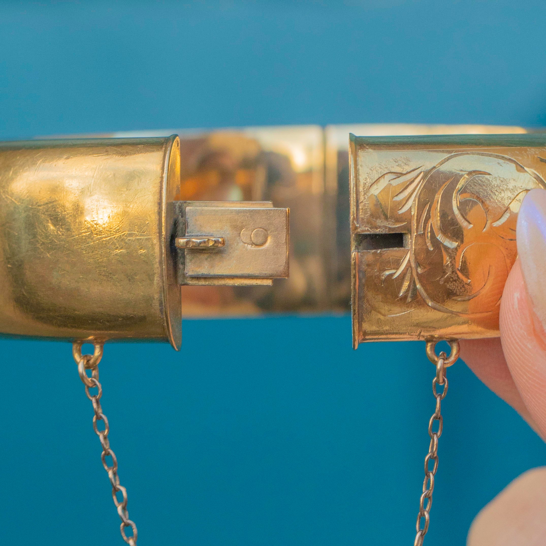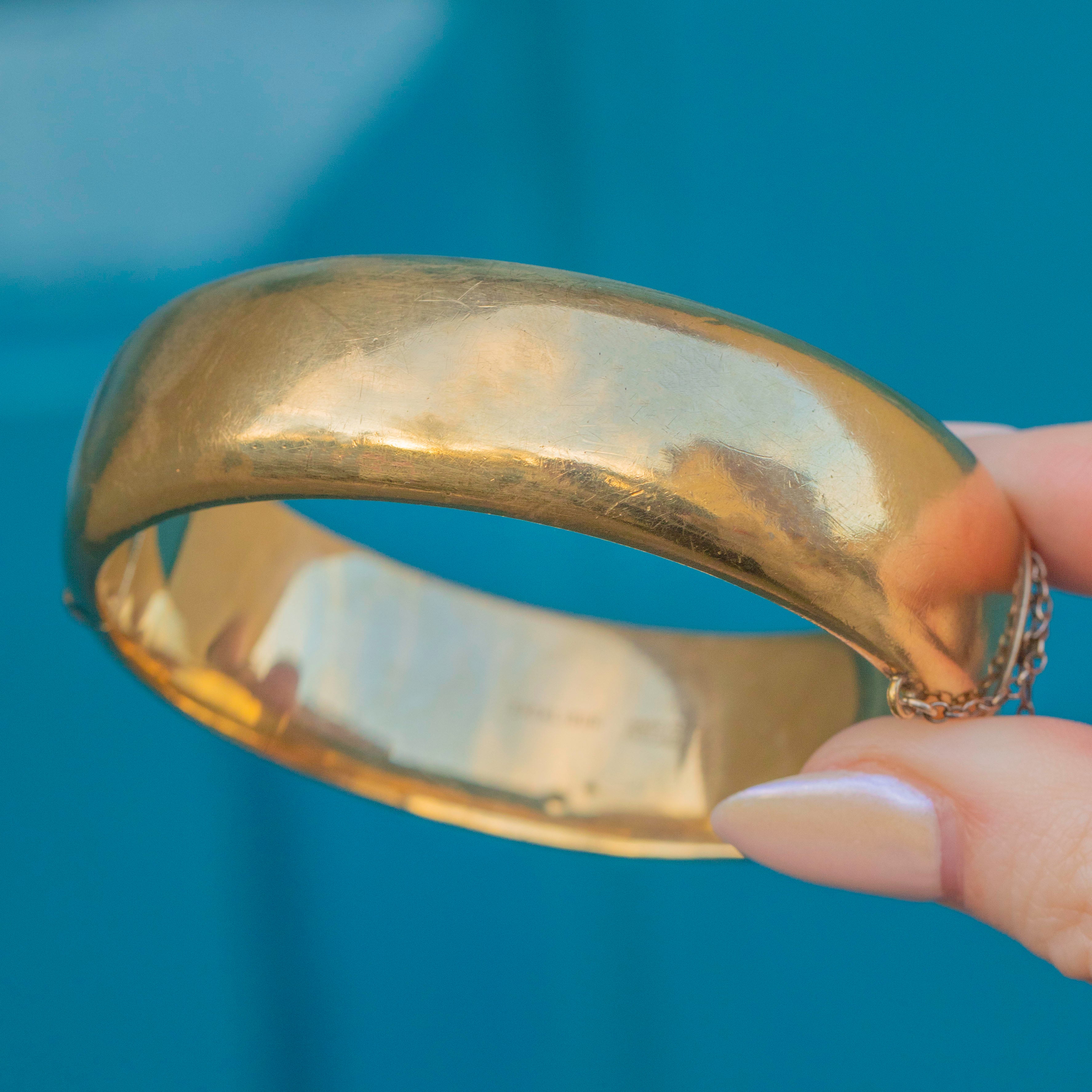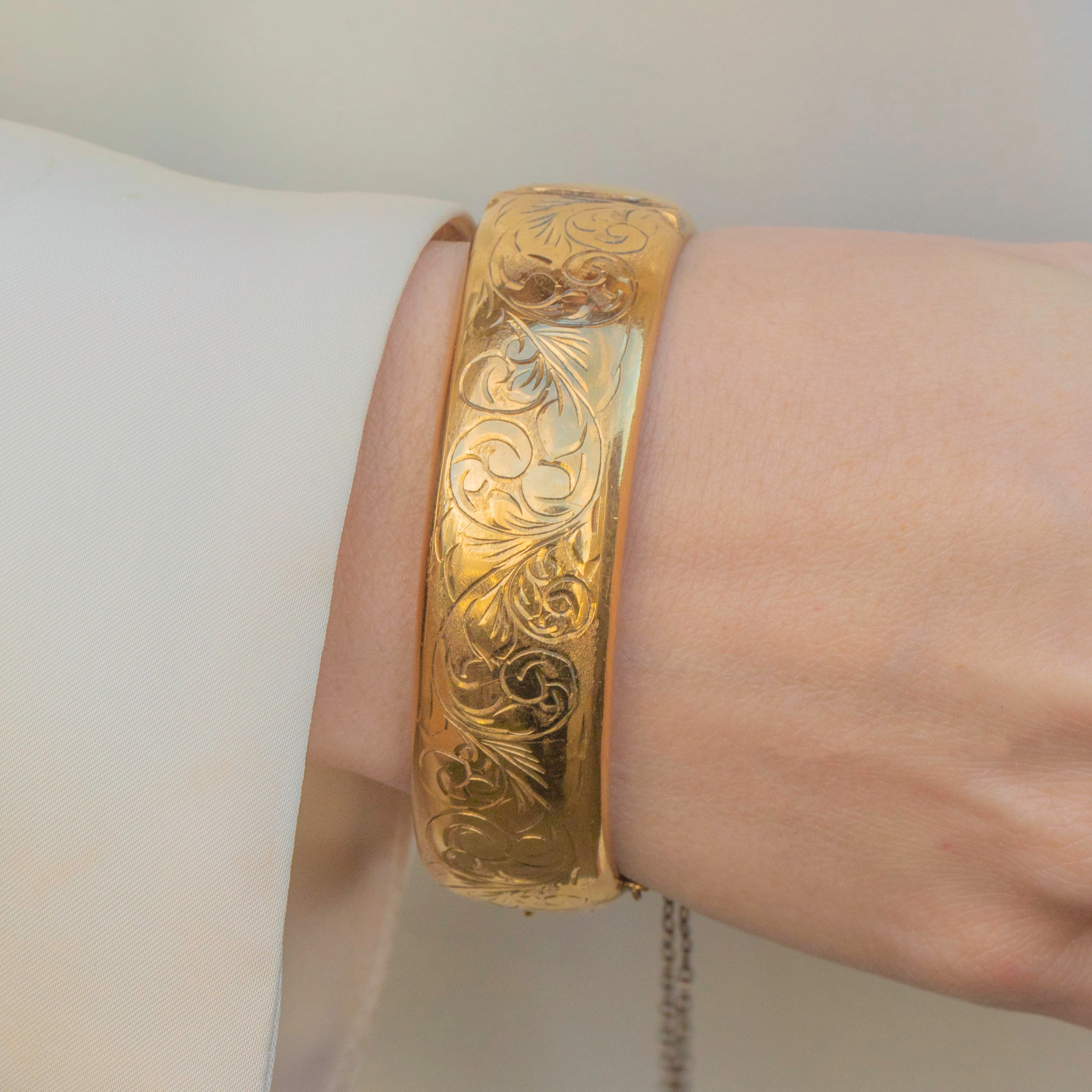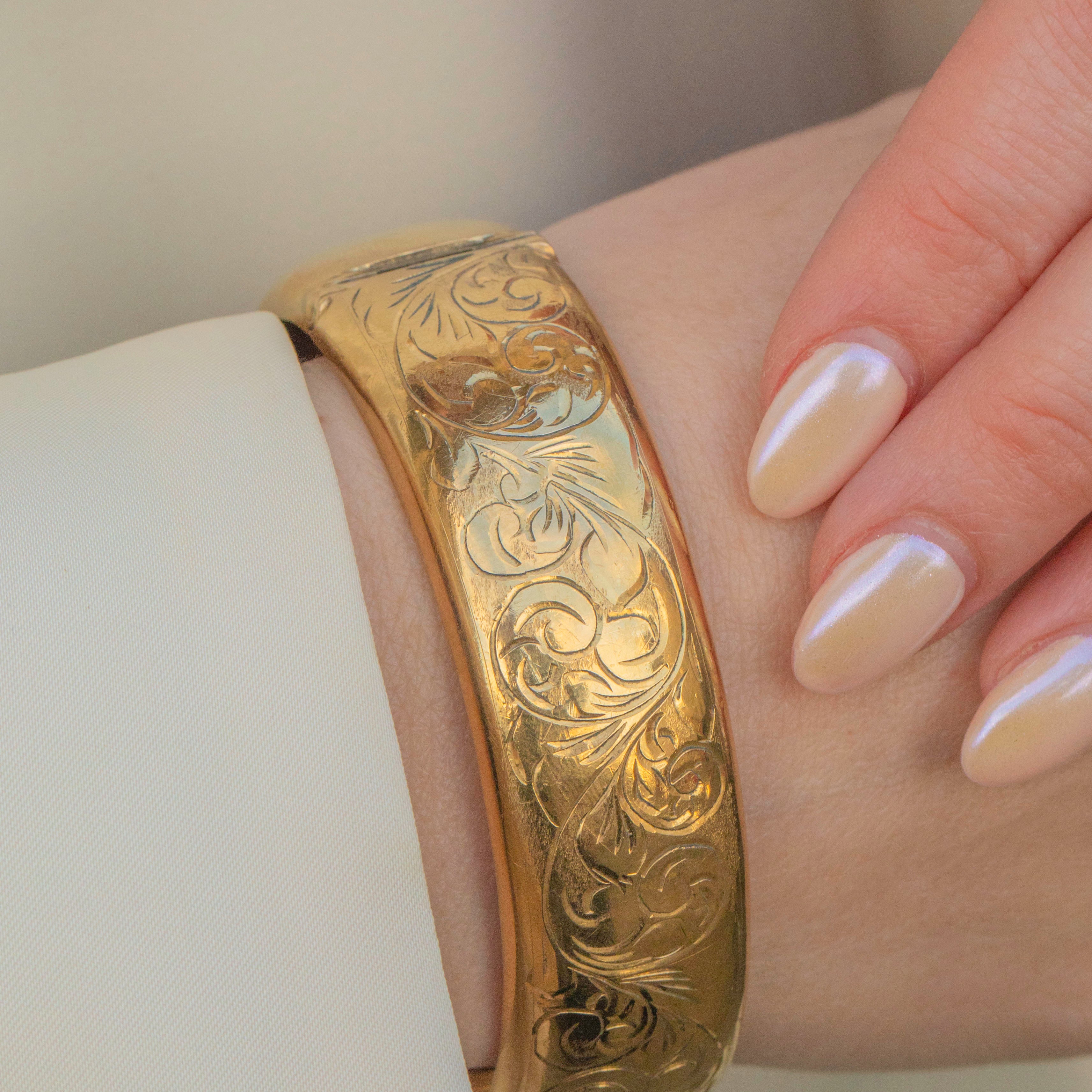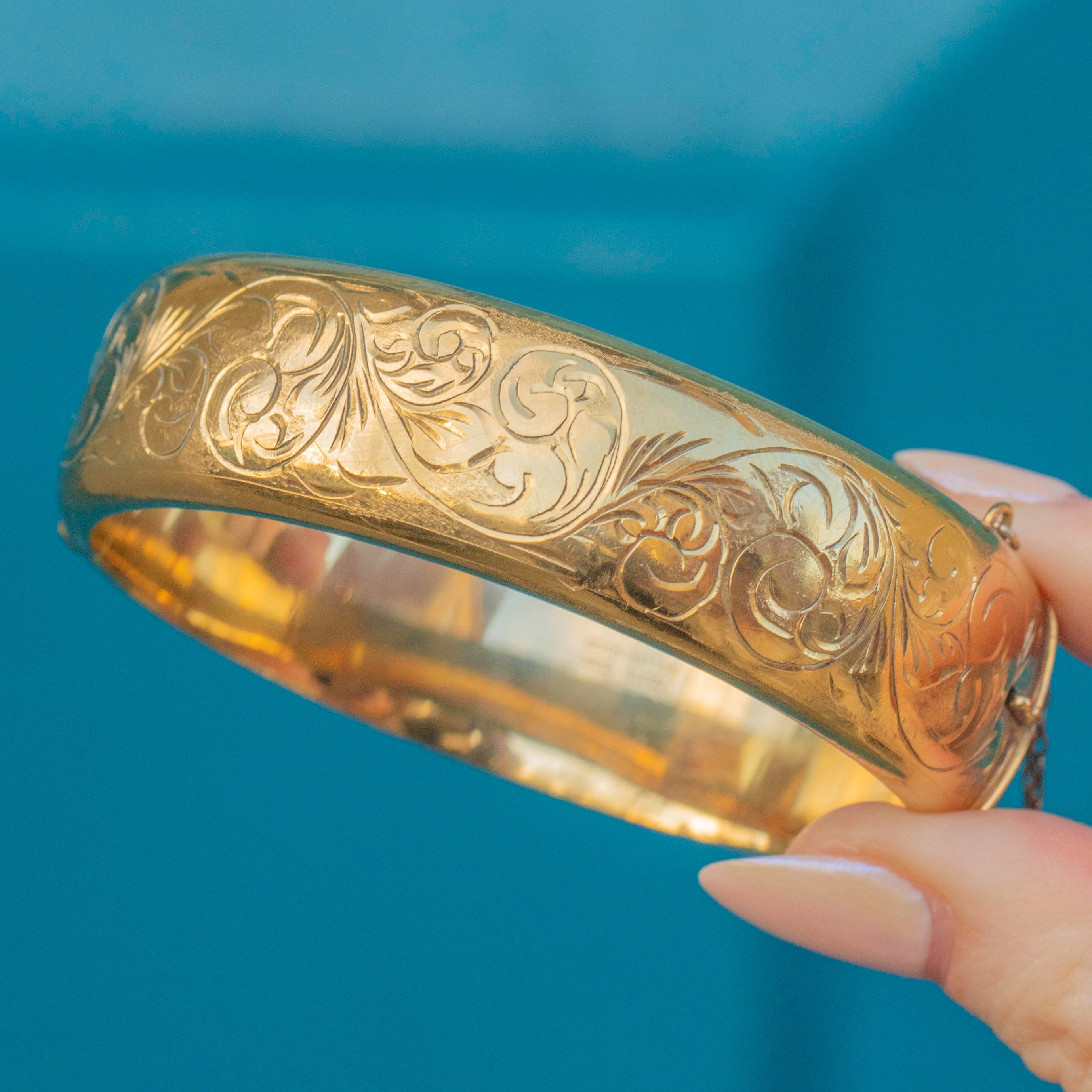 VERY GOOD. This vintage 12ct rolled Gold engraved bangle is in very good condition. The bangle has retained gorgeous engravings and there is only minor wear on the back, commensurate with age. With a safety chain added for security, you can wear this bangle with the utmost confidence!