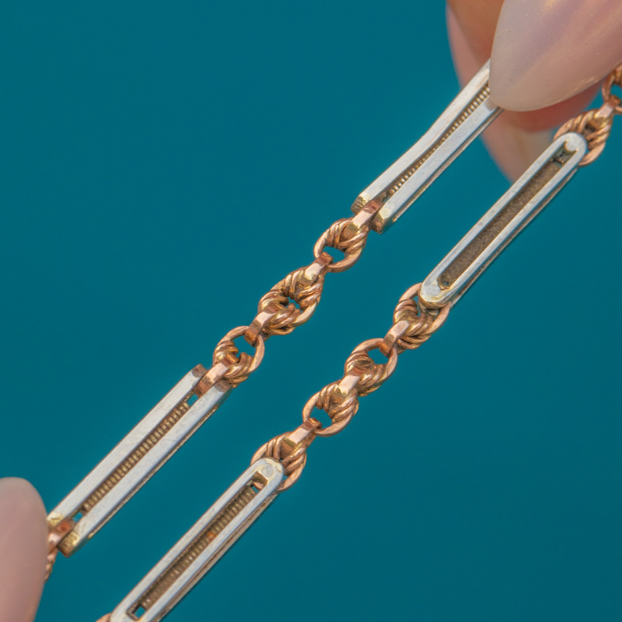 EXCELLENT: This chain has been very well preserved, with no visible wear between the links. The Rose and White Gold surfaces remain bright and crisp, and both dog clips work perfectly. A superb example of Victorian craftsmanship in exceptional condition.
