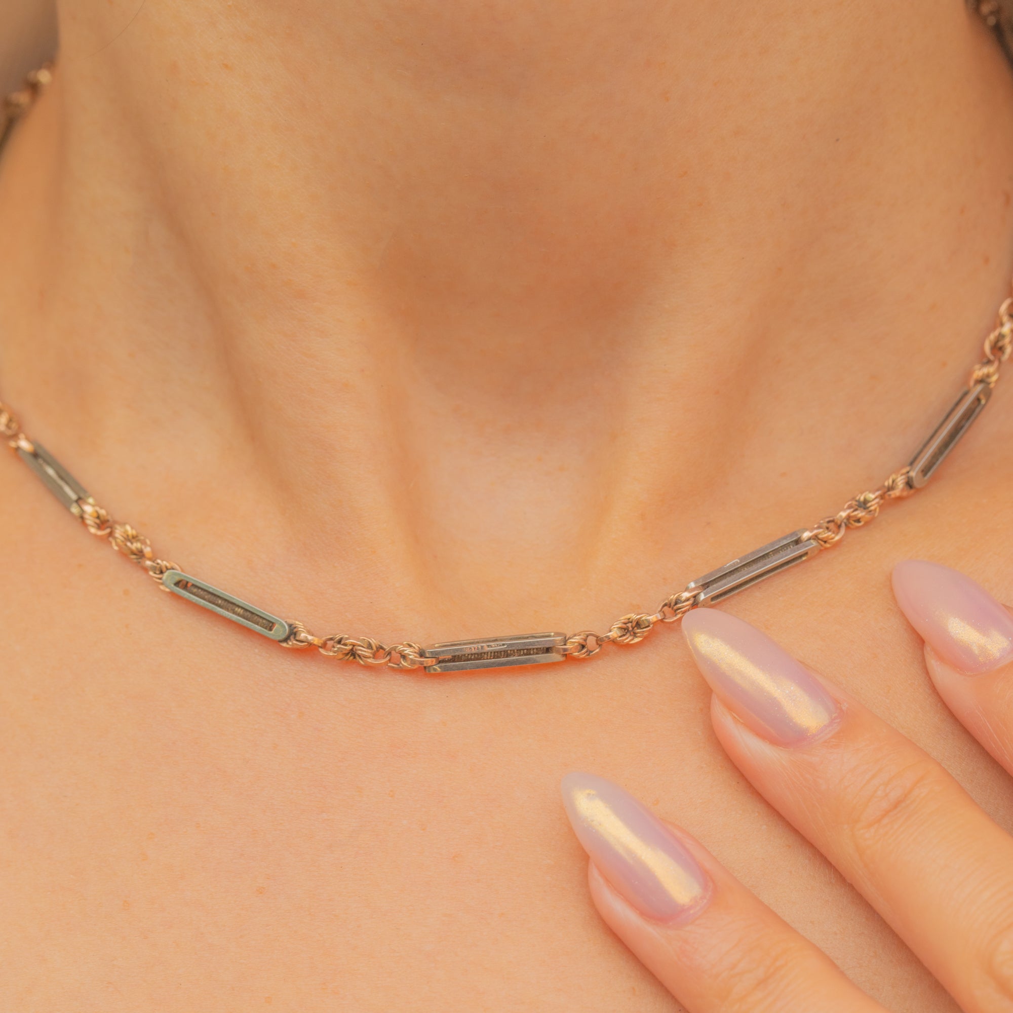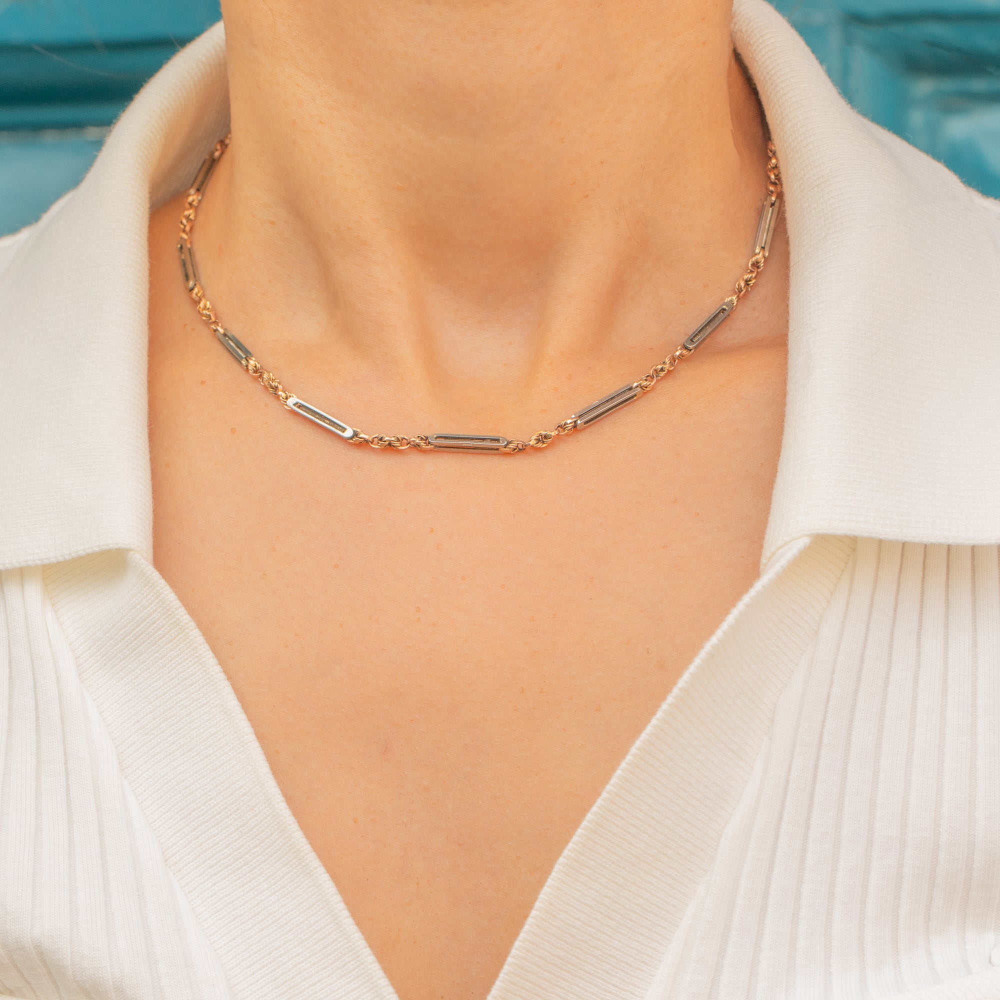 This beautiful Victorian chain combines both Rose and White Gold in a striking two-tone design. The alternating bar and knot links give it a refined, decorative appeal while retaining the strength and wearability of a daily necklace. At 14.5" in length, it sits neatly at the base of the neck, perfect for layering or wearing alone.