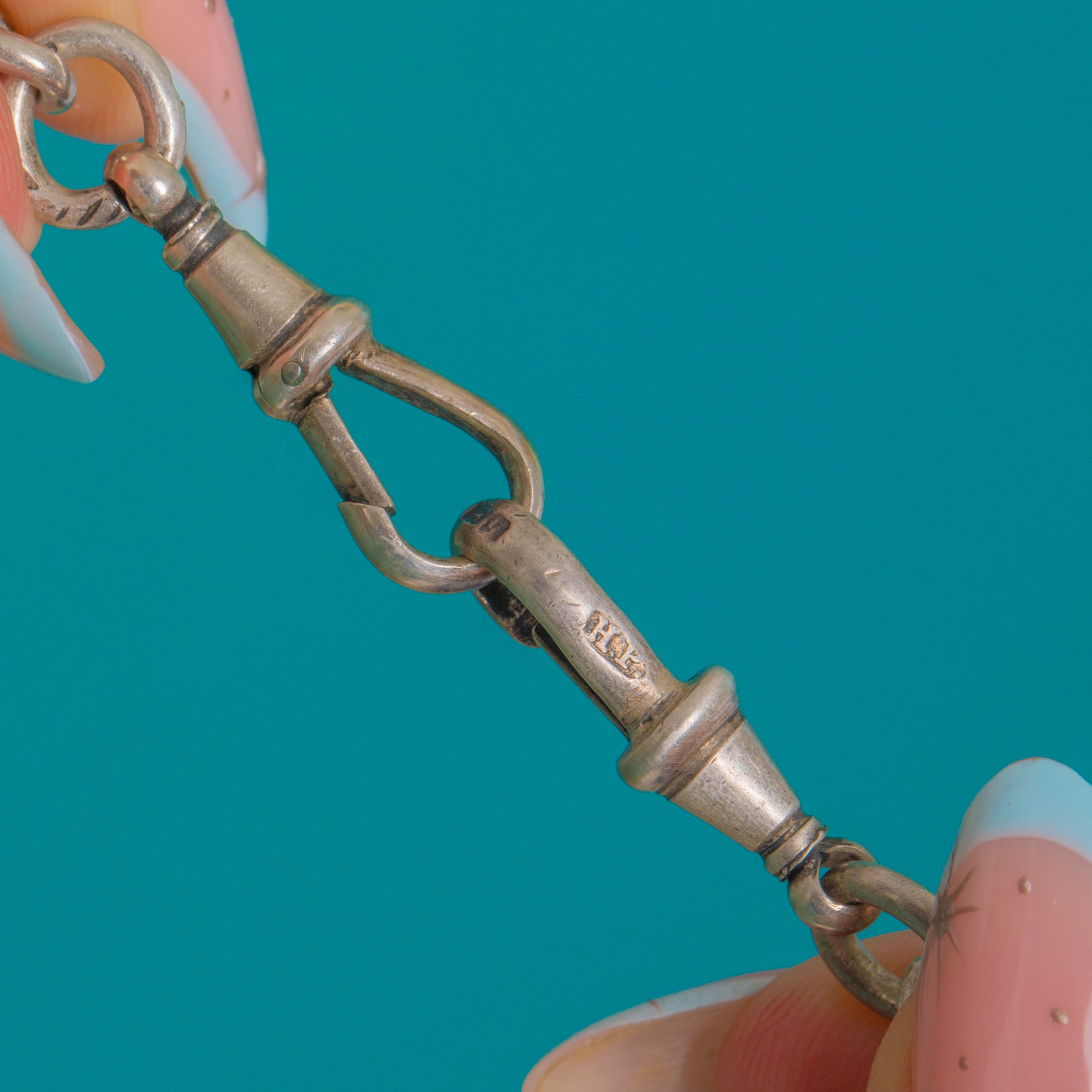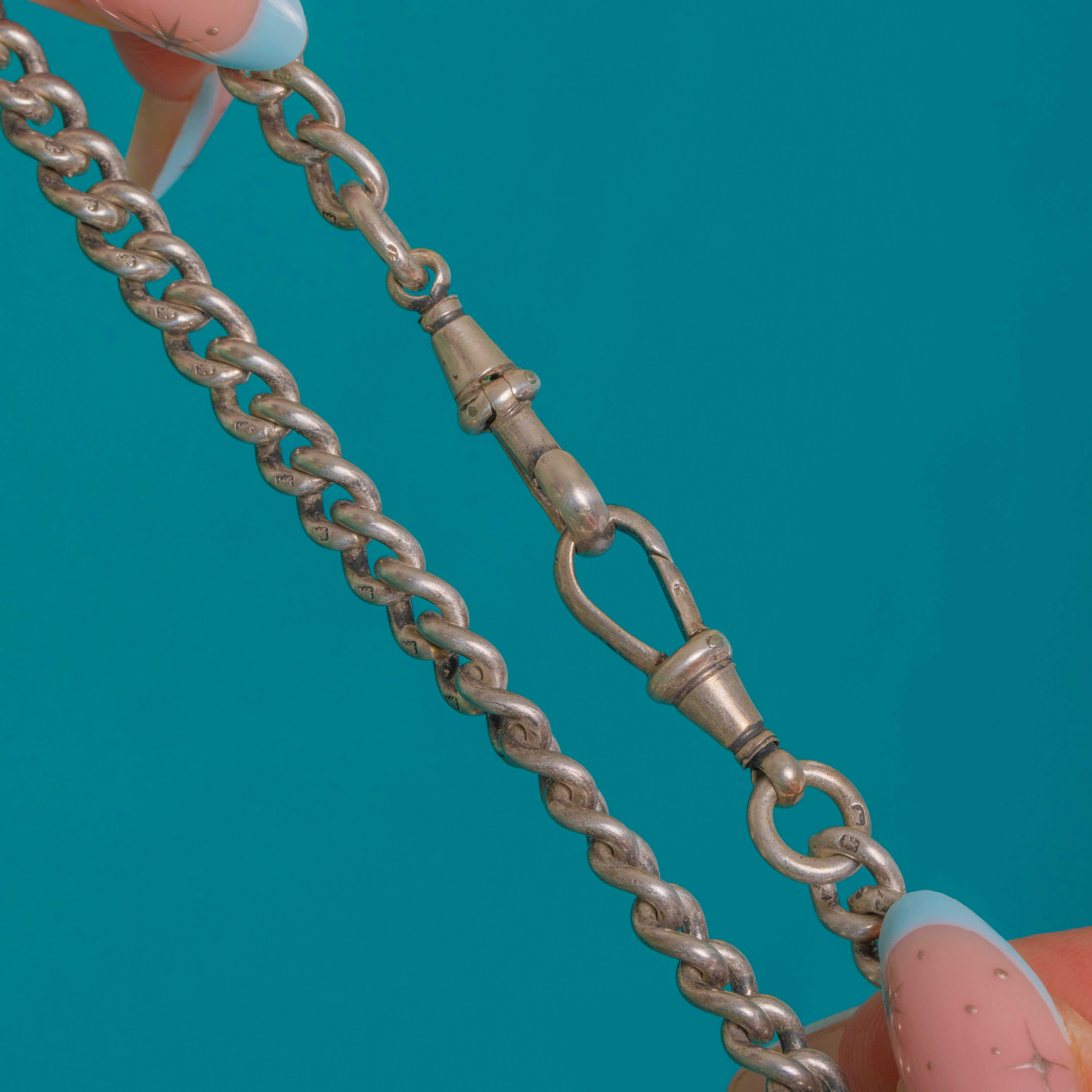 Every link is hallmarked, confirming Birmingham with the date letter ‘h’ for 1882 and the Lion Passant for Sterling Silver. Designed to be worn front-fastening with the T-bar drop, you could style the dog-clips at the front with a charm or two added for a personal touch.