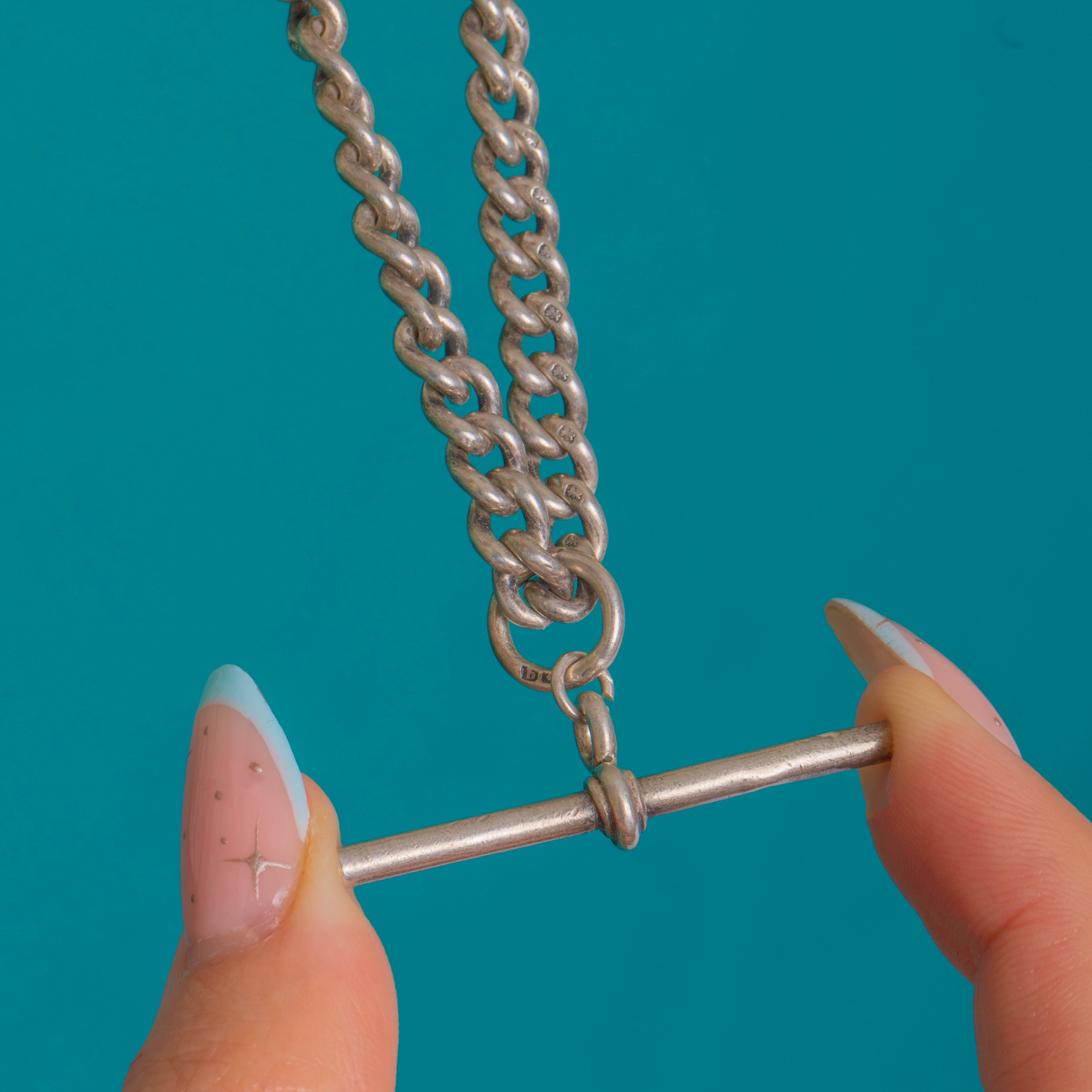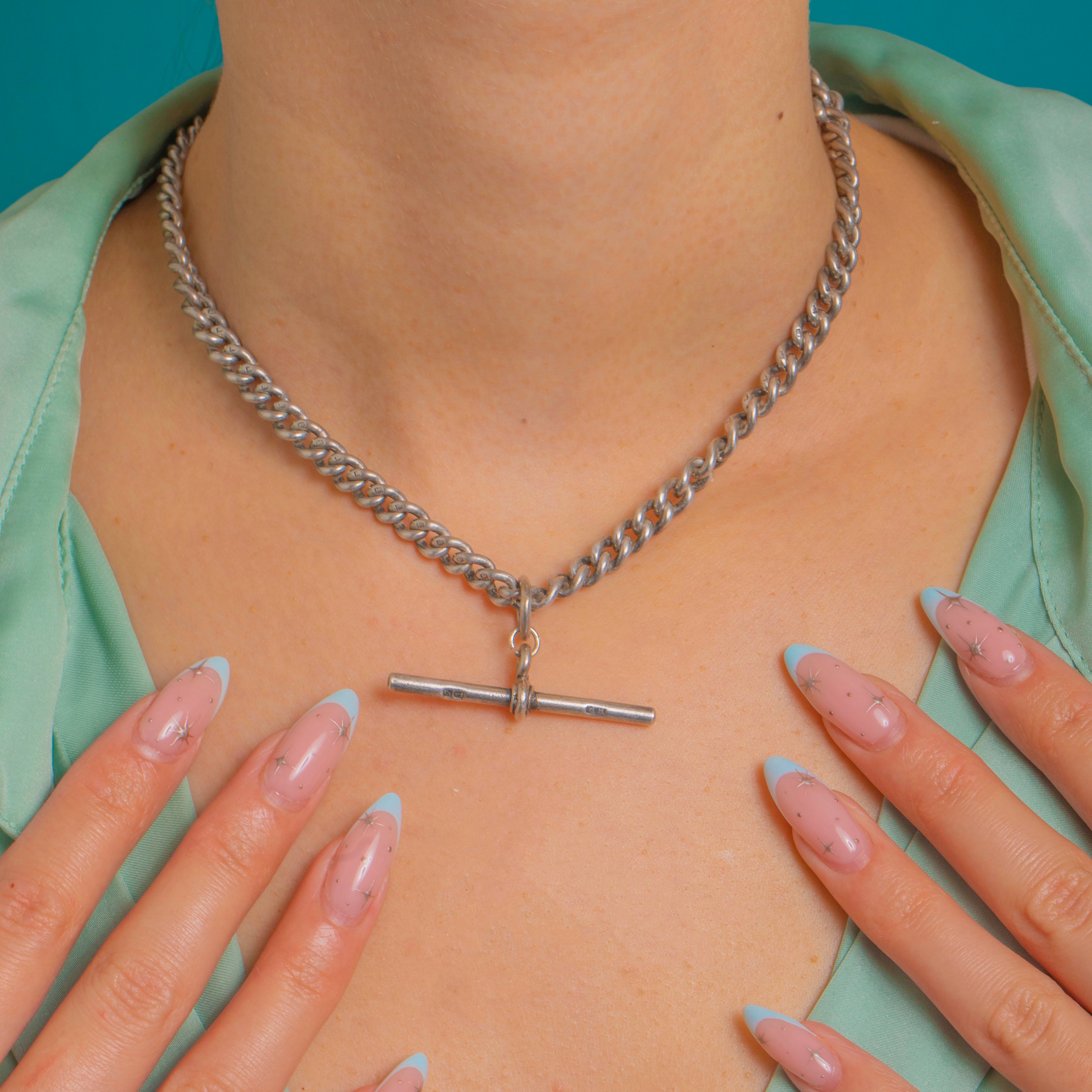 A quintessential Victorian Silver Albert, this bold curb-link chain is finished with a classic T-bar and twin dog clips for that authentic watch-chain silhouette. The solid, soldered links have accrued a gorgeous, even patina over time, giving the piece depth and character, while its satisfying 33.5g weight adds a luxurious feel on the neck.