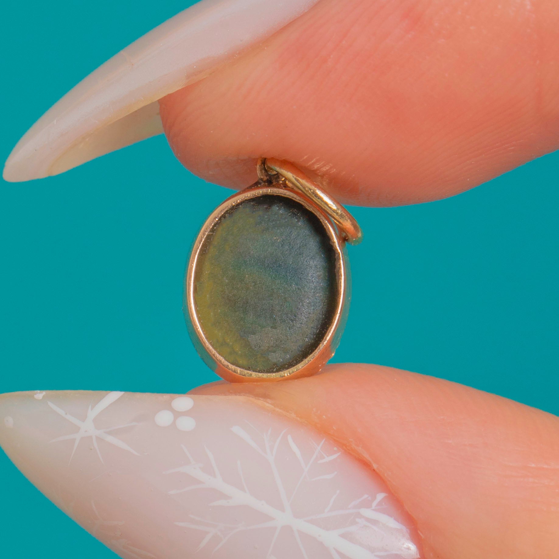 A petite but powerful little treasure, this Art Deco charm centres on a tested natural Black Star Sapphire cabochon, glowing with that unmistakable star-like asterism as it catches the light.