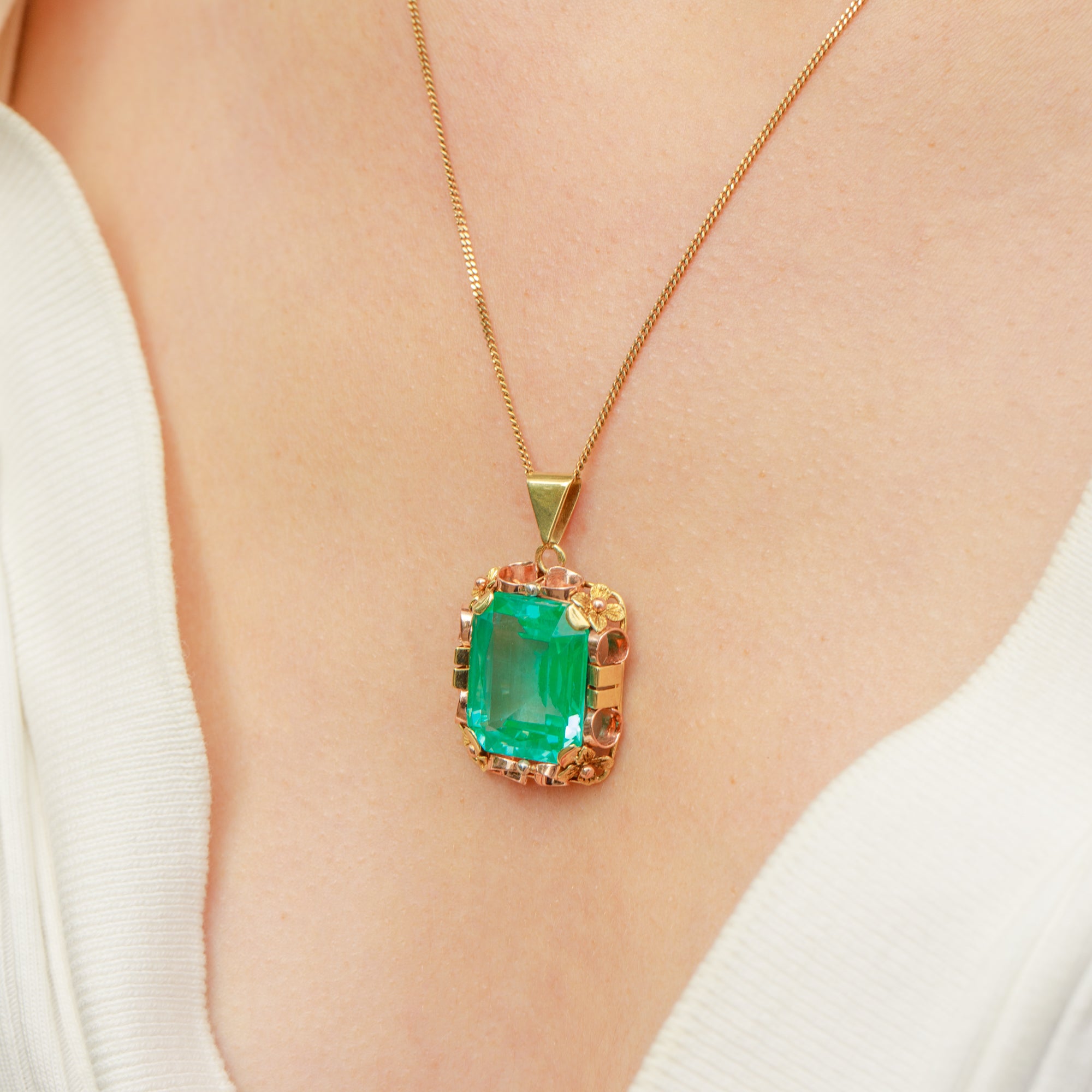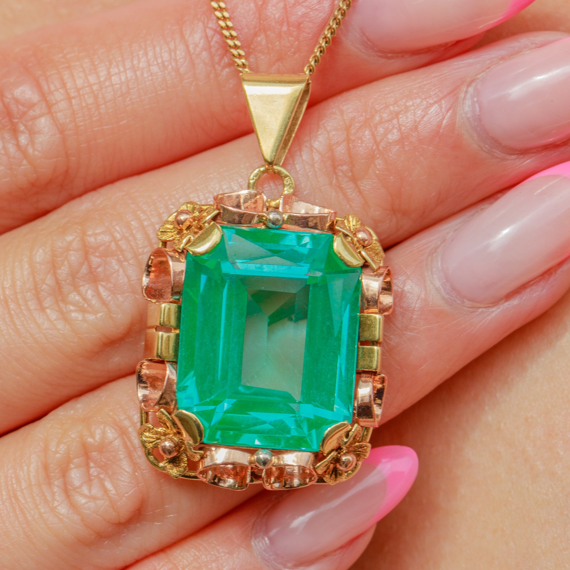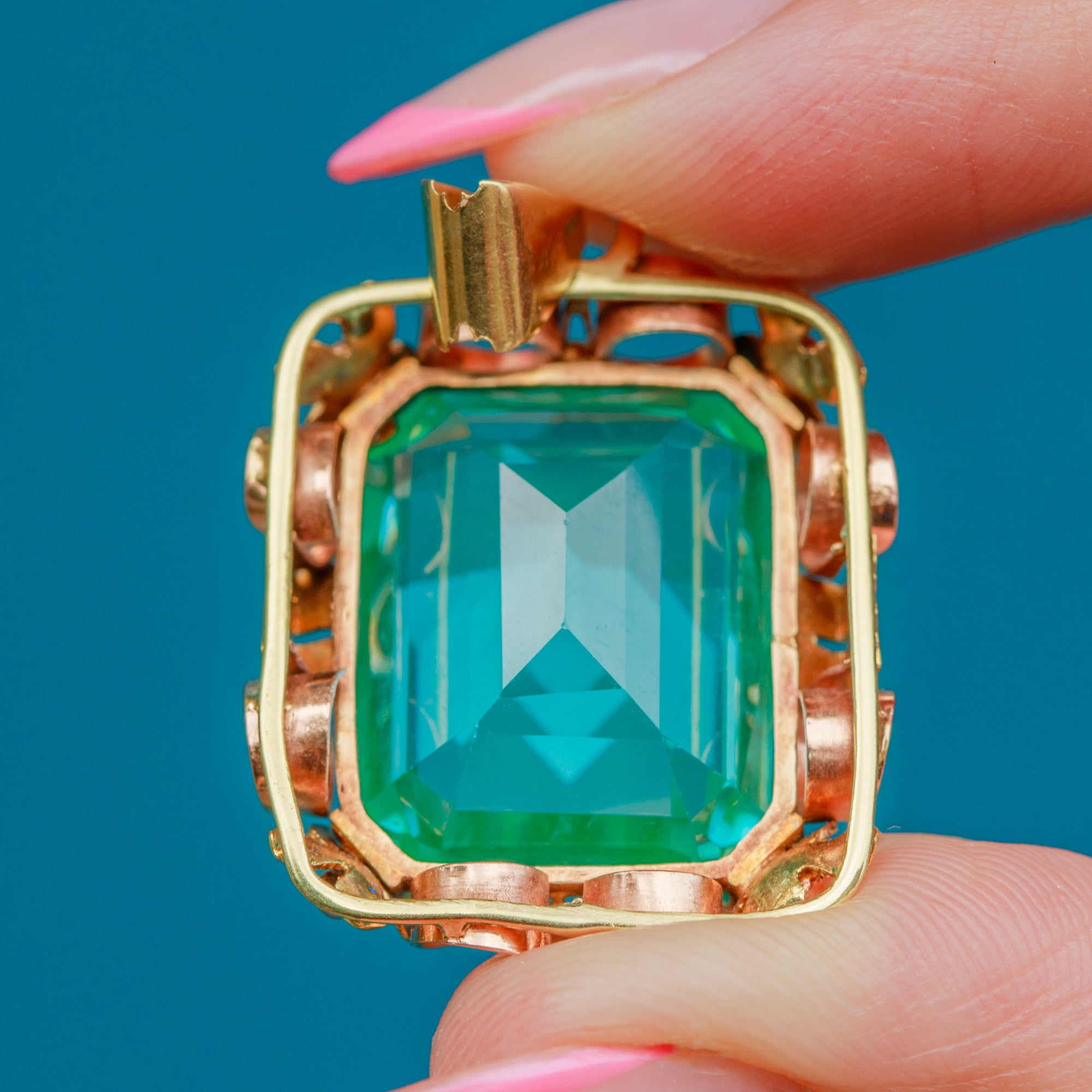 Homing a large, faceted 39.50ct green synthetic Spinel, this bold pendant projects a gorgeous, vibrant hue and is sure to impress from every angle. Two-toned 14ct Gold floral settings hug her exquisitely faceted Spinel, the warmth effortlessly complementing the cool tones of the gemstone. She is complete with northern European stamps on her hasp, indicative of German, Austrian or Belgian origin, adding a lovely touch of antique allure to this pendant.