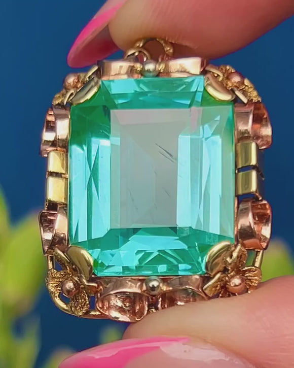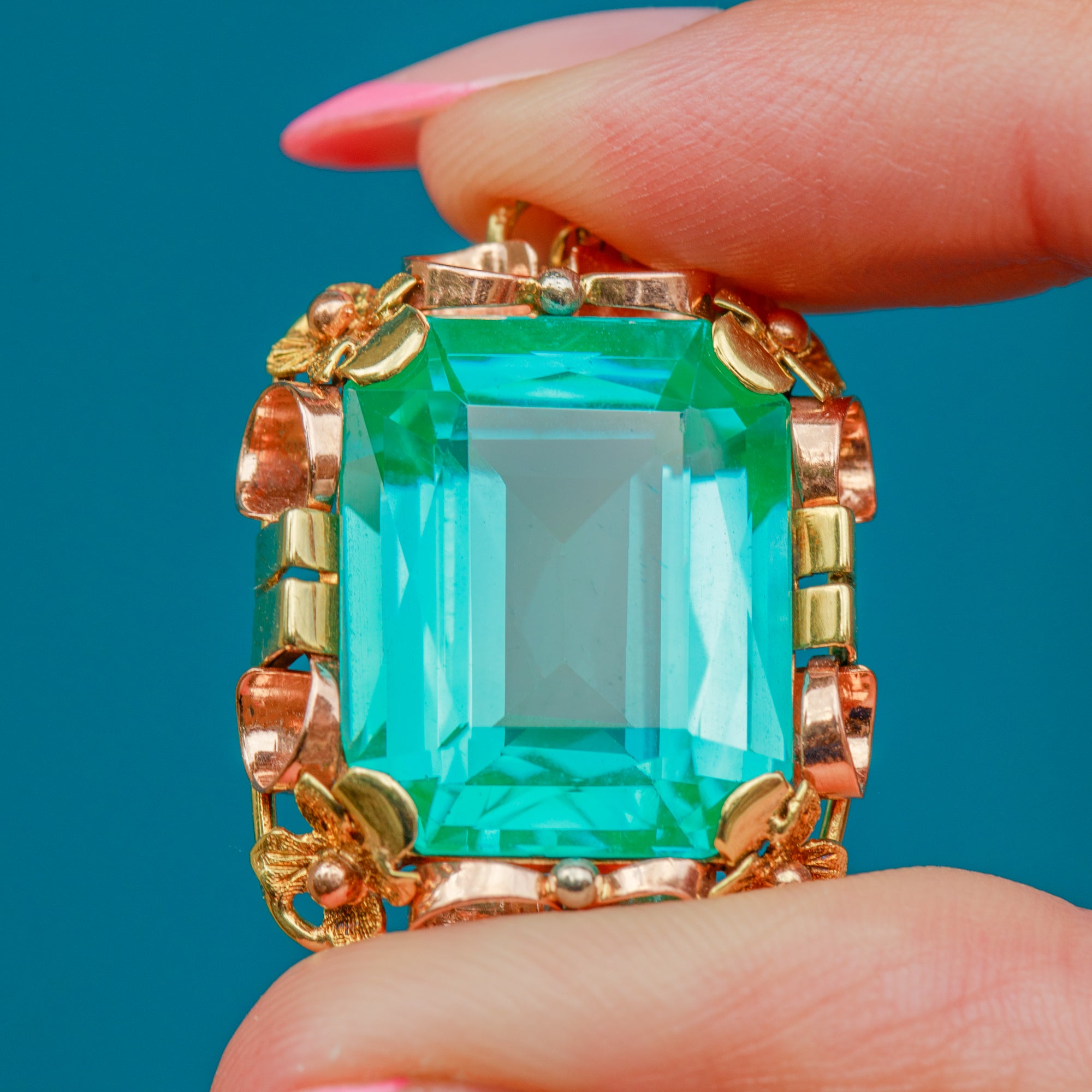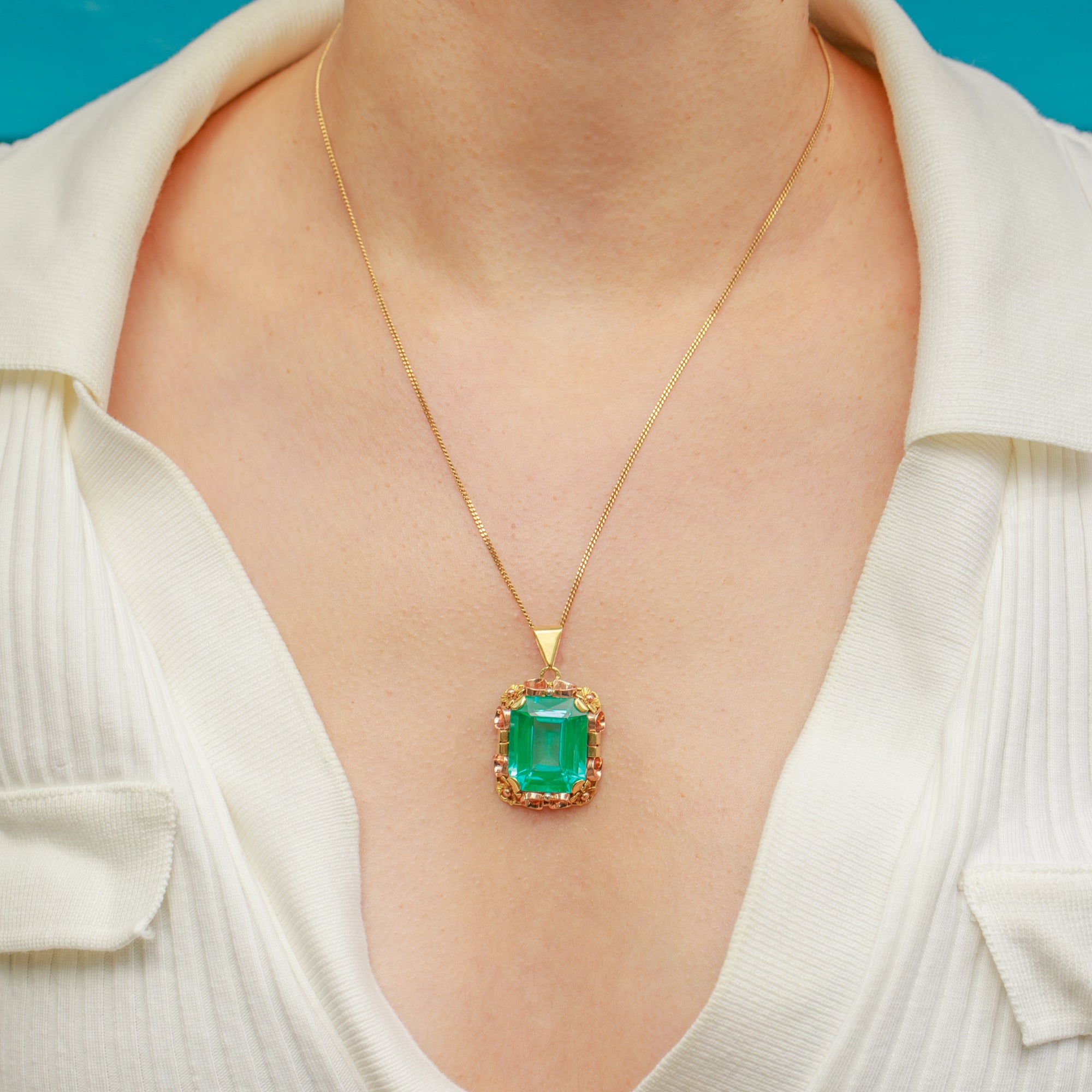Homing a large, faceted 39.50ct green synthetic Spinel, this bold pendant projects a gorgeous, vibrant hue and is sure to impress from every angle. Two-toned 14ct Gold floral settings hug her exquisitely faceted Spinel, the warmth effortlessly complementing the cool tones of the gemstone. She is complete with northern European stamps on her hasp, indicative of German, Austrian or Belgian origin, adding a lovely touch of antique allure to this pendant.