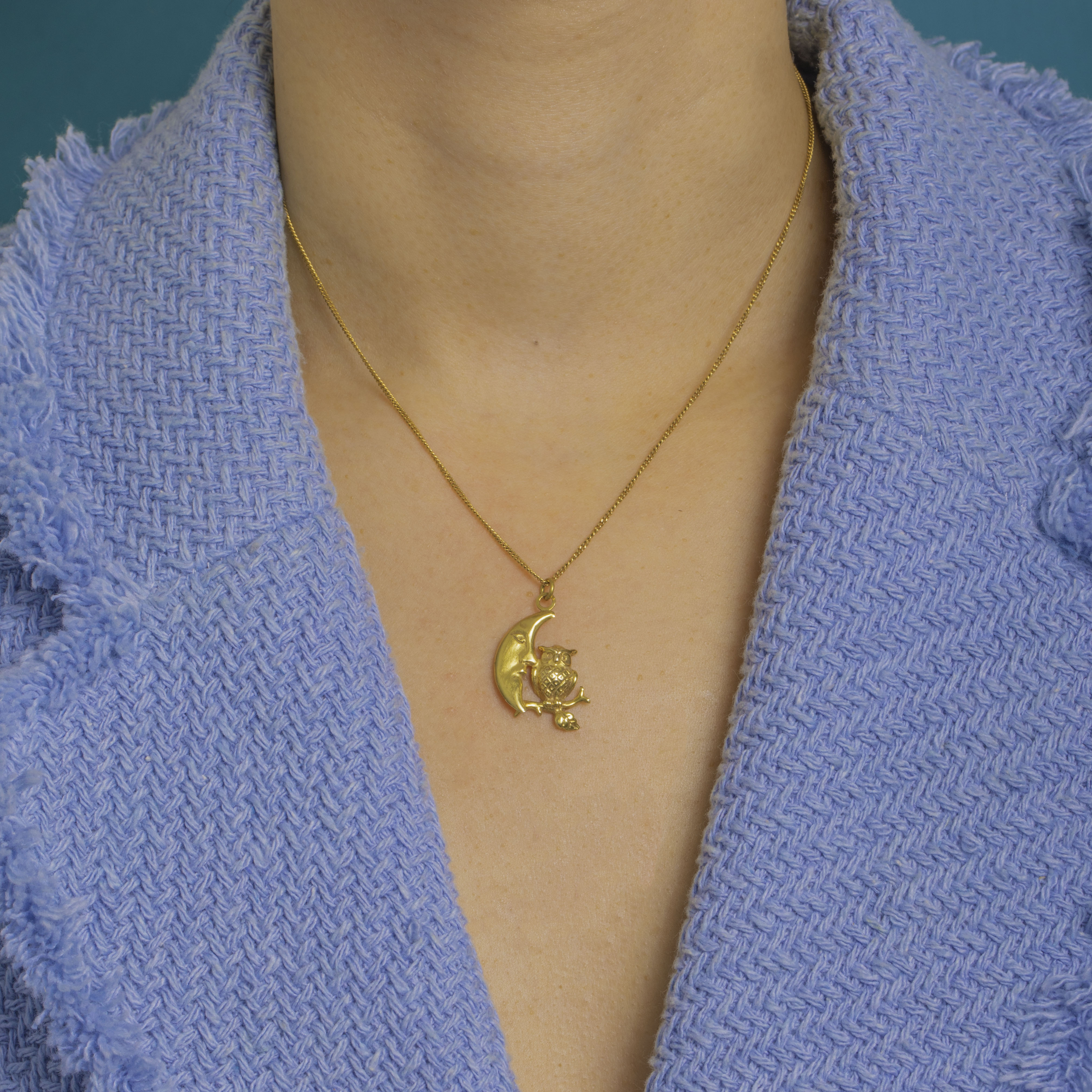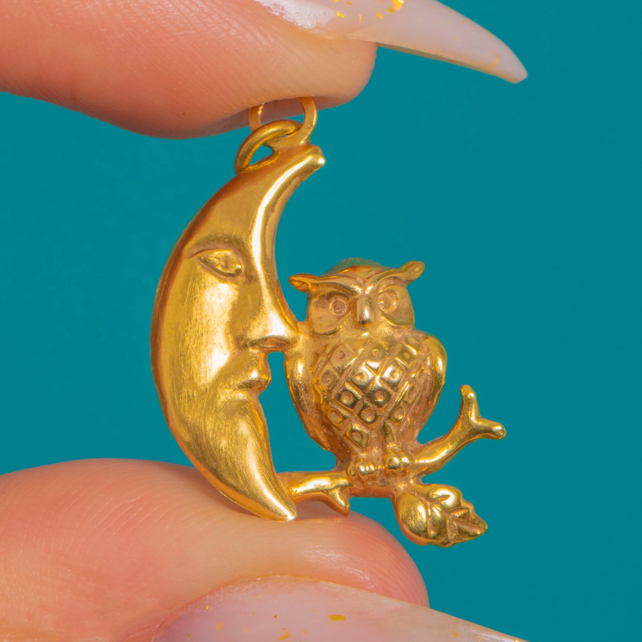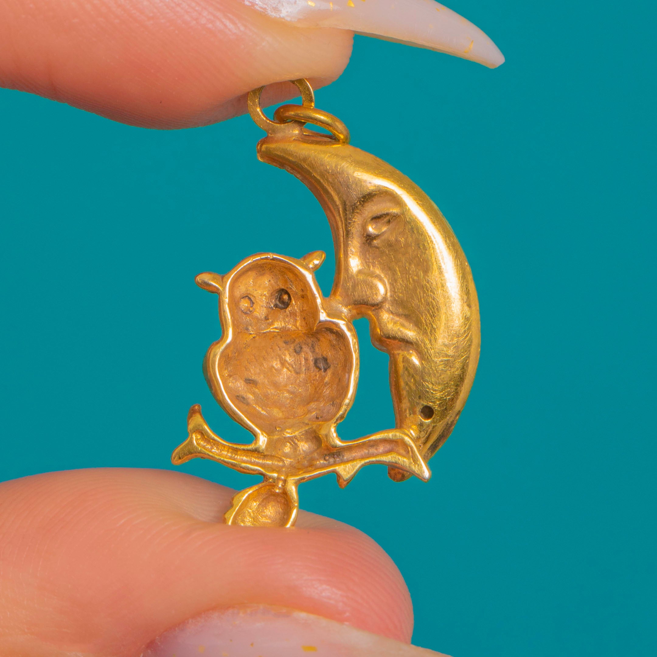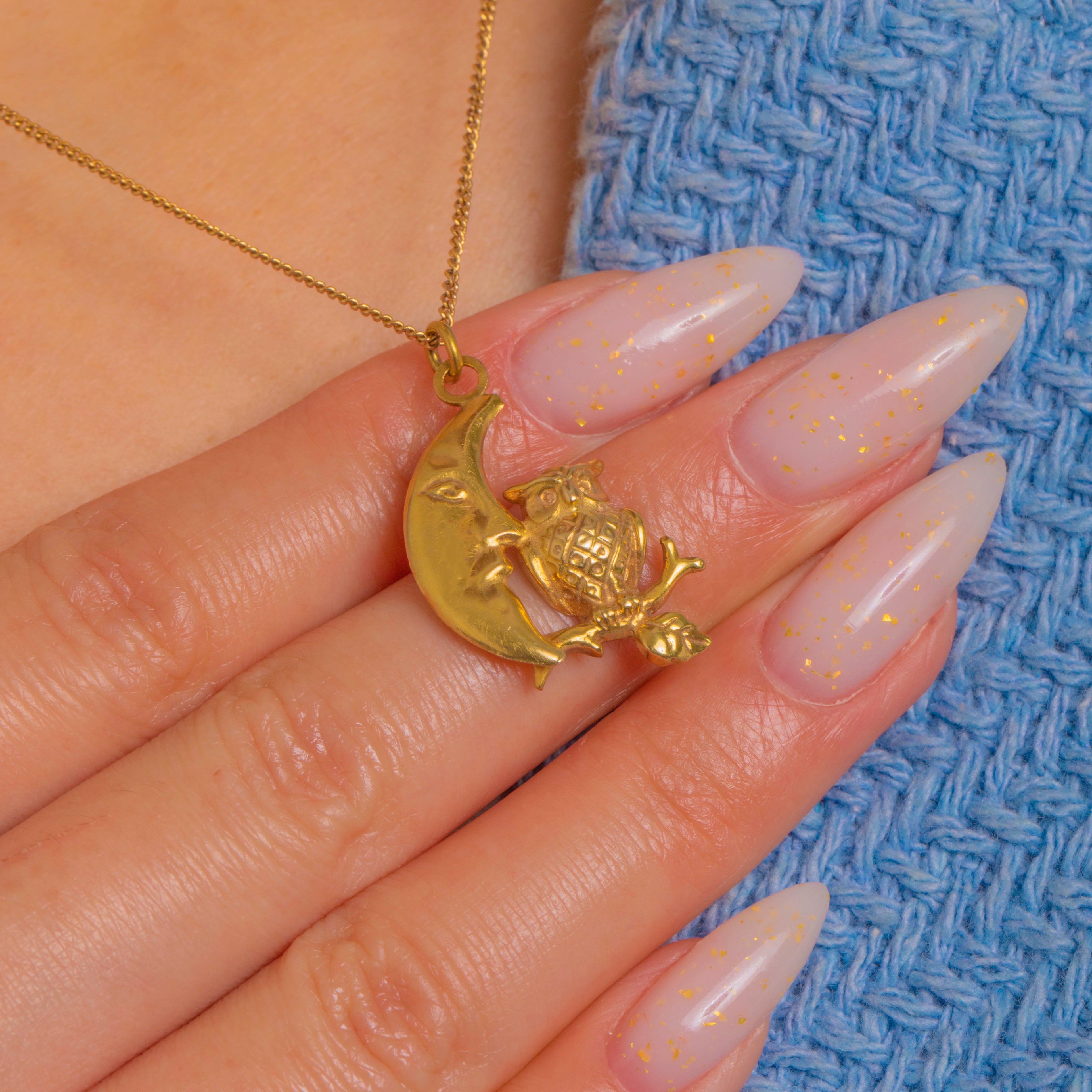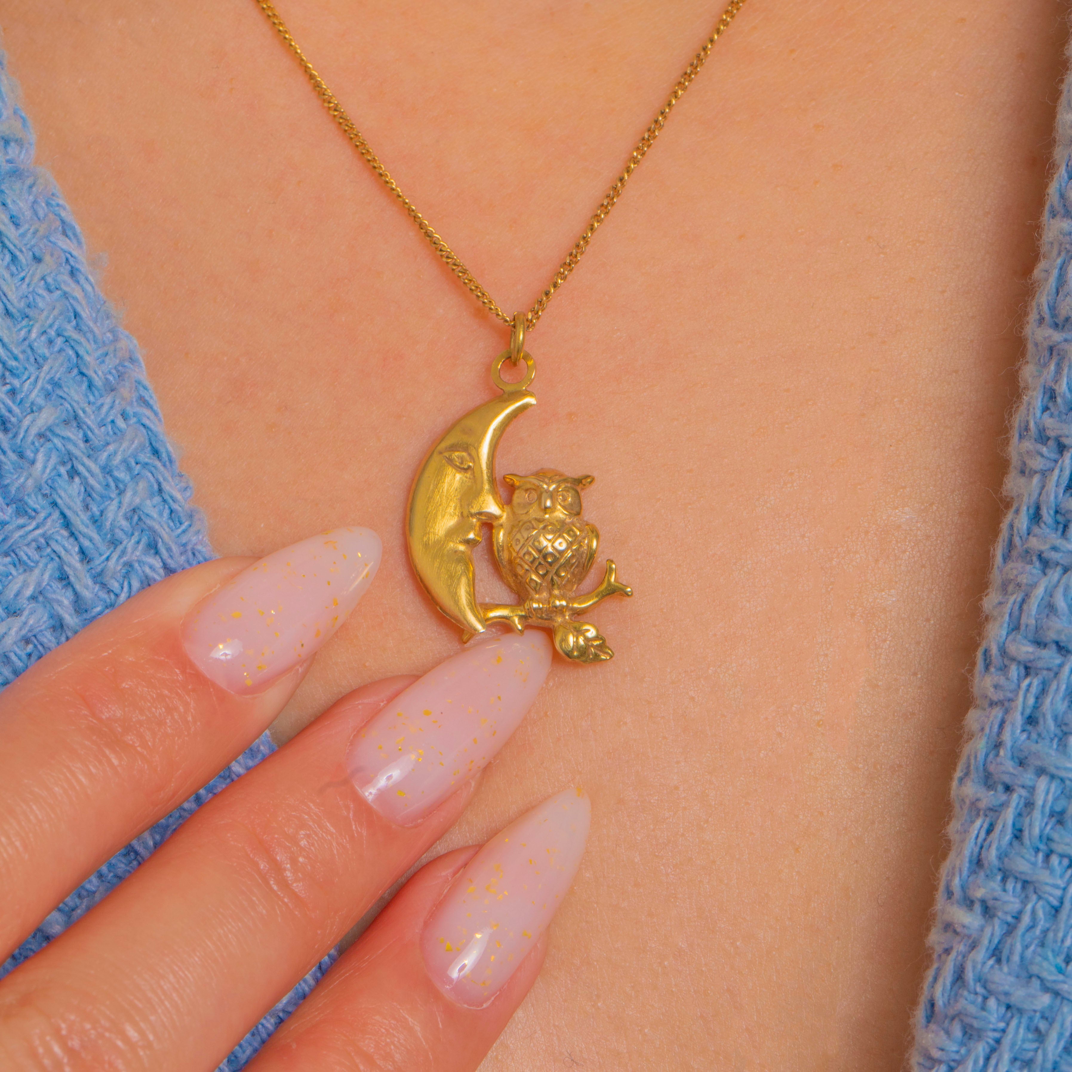 A whimsical celestial delight in 14ct Gold, this petite half moon and owl charm captures the sweetest nocturnal scene. The crescent “man-in-the-moon” is rendered smooth and polished, nuzzling an owl perched on a tiny branch with a leaf, its feathers crisply textured for beautiful contrast.