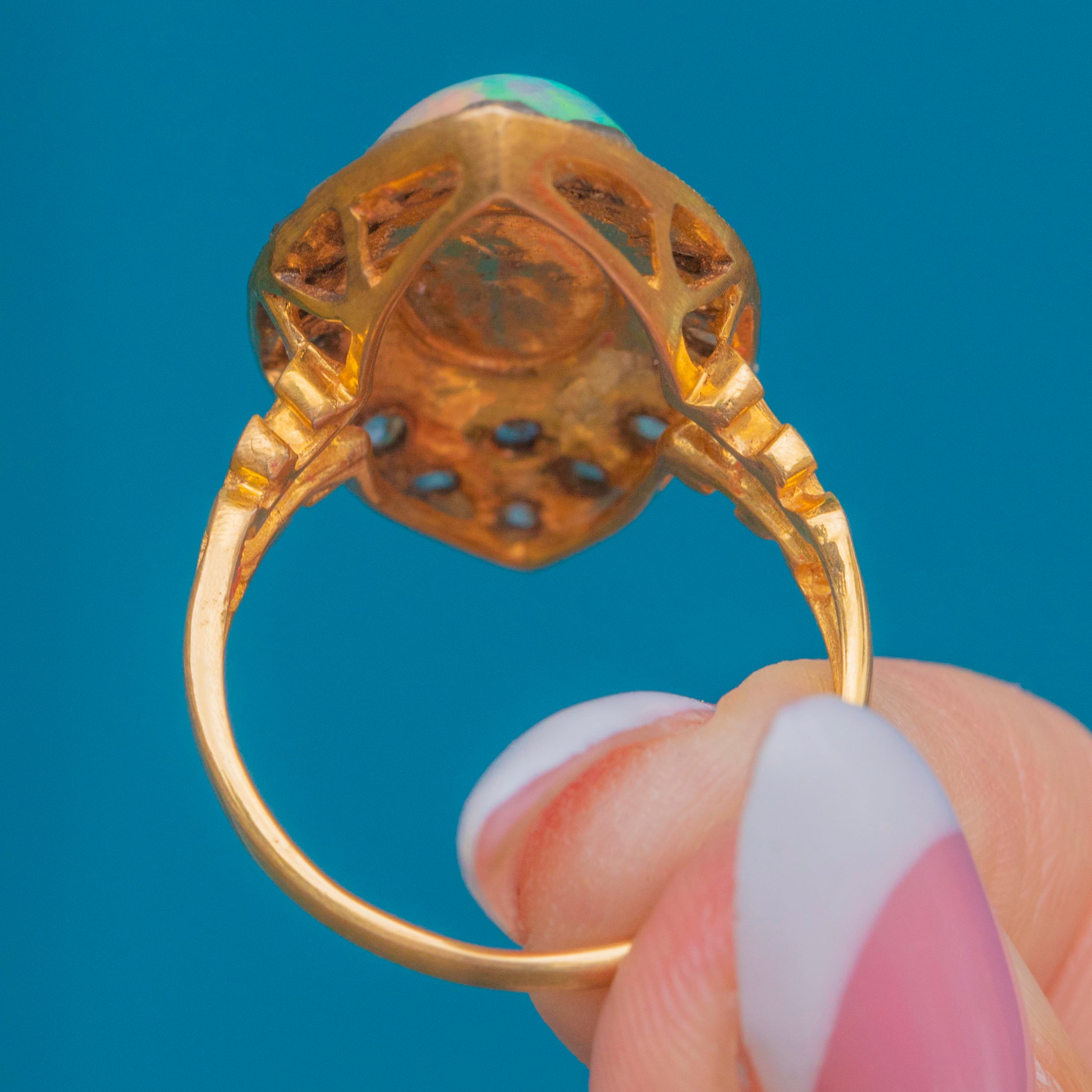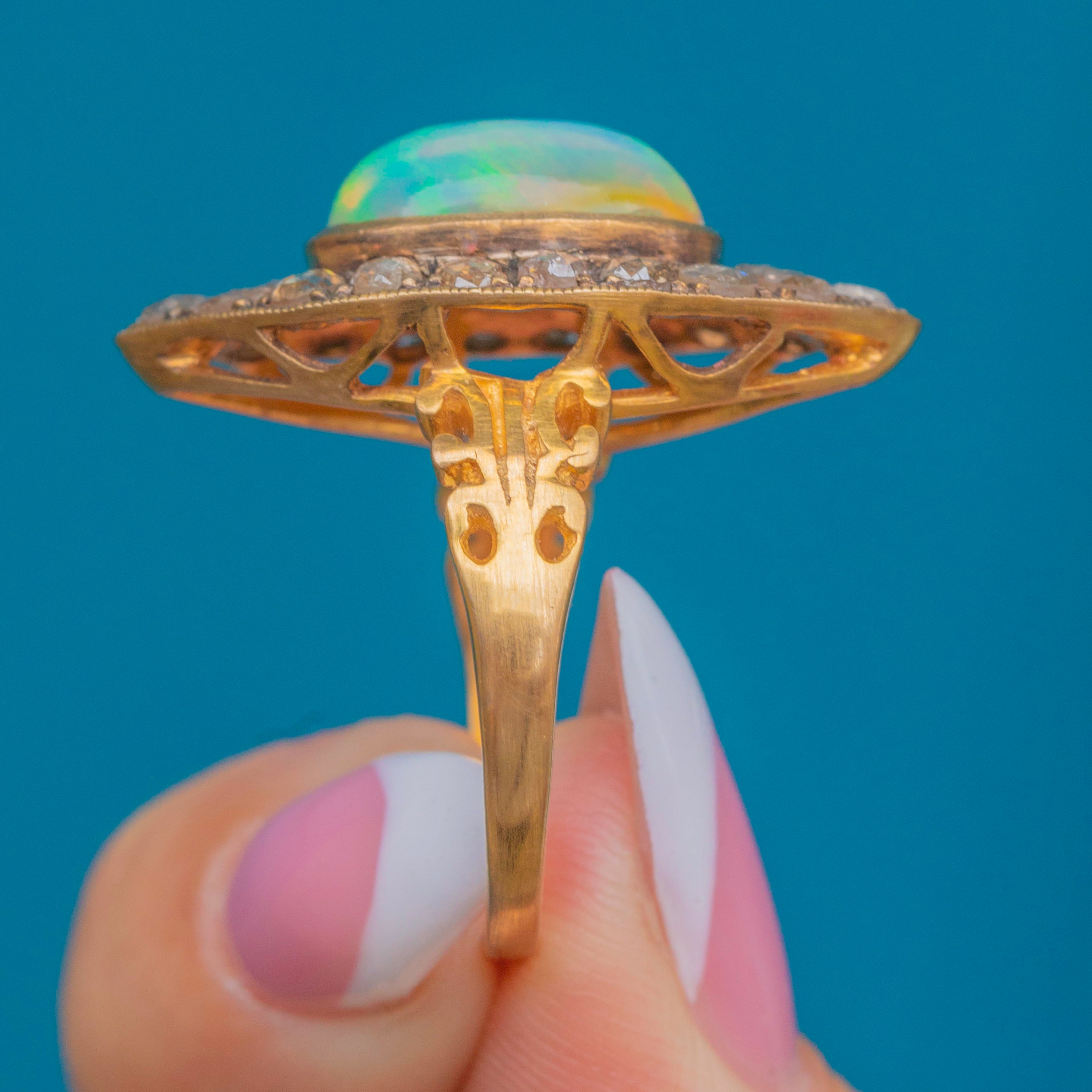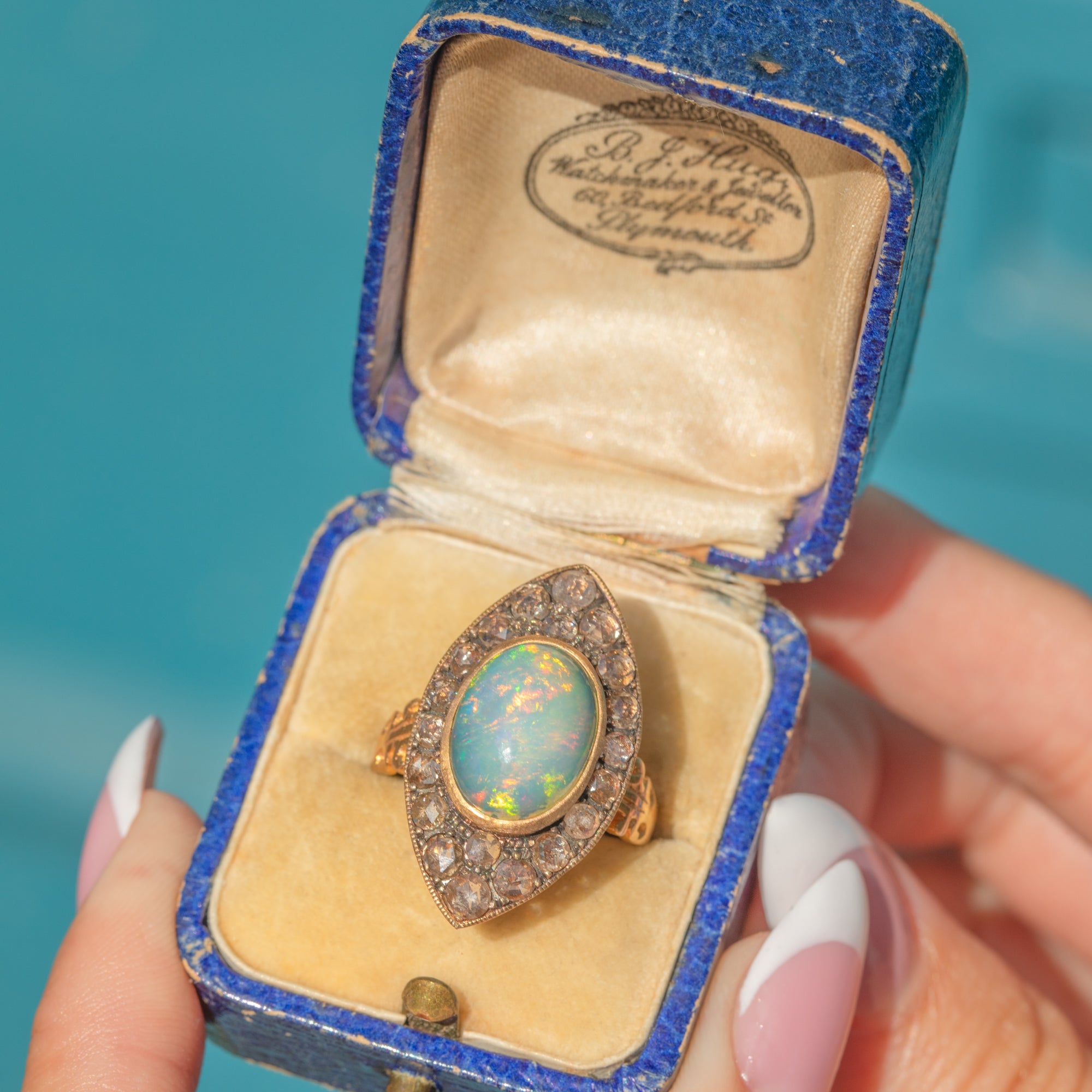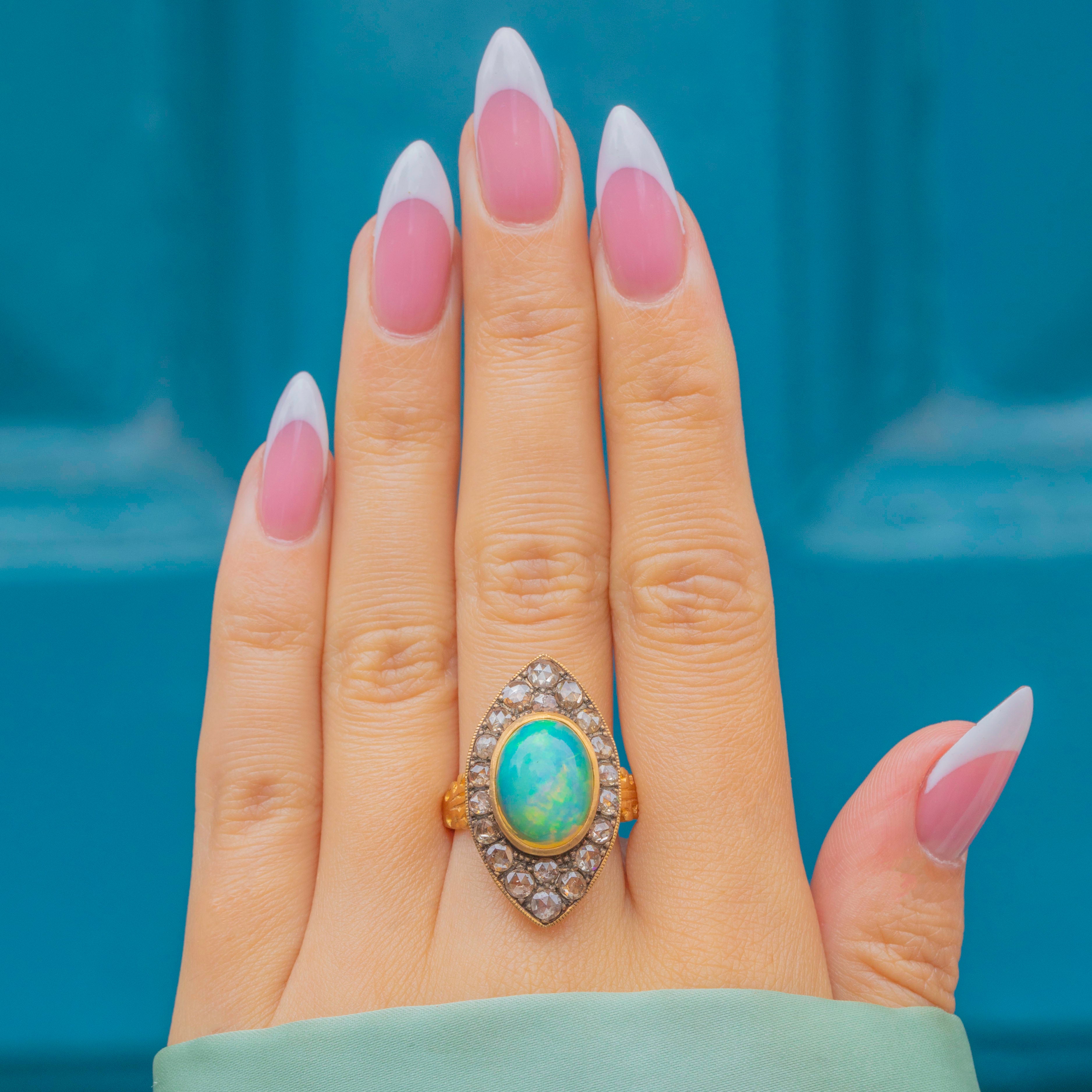 This vivacious vingage Opal ring is bursting with flashes of zesty green and pops of neon peach, shimmering across her 2.70ct Opal! The navette shape elongates the finger and is encrusted with magnificent rose-cut Diamonds, creating a timeless design that is guaranteed to be admired for years to come.