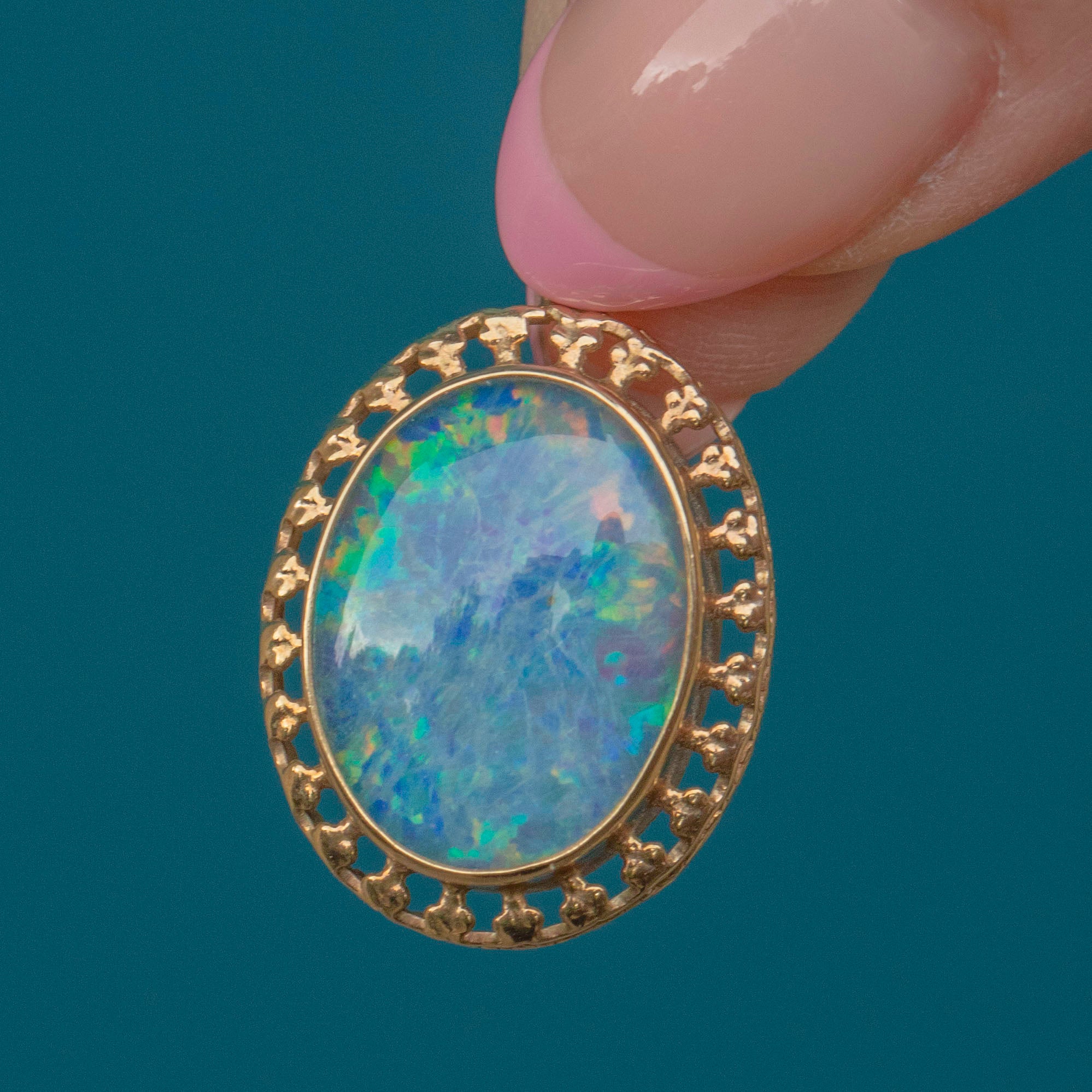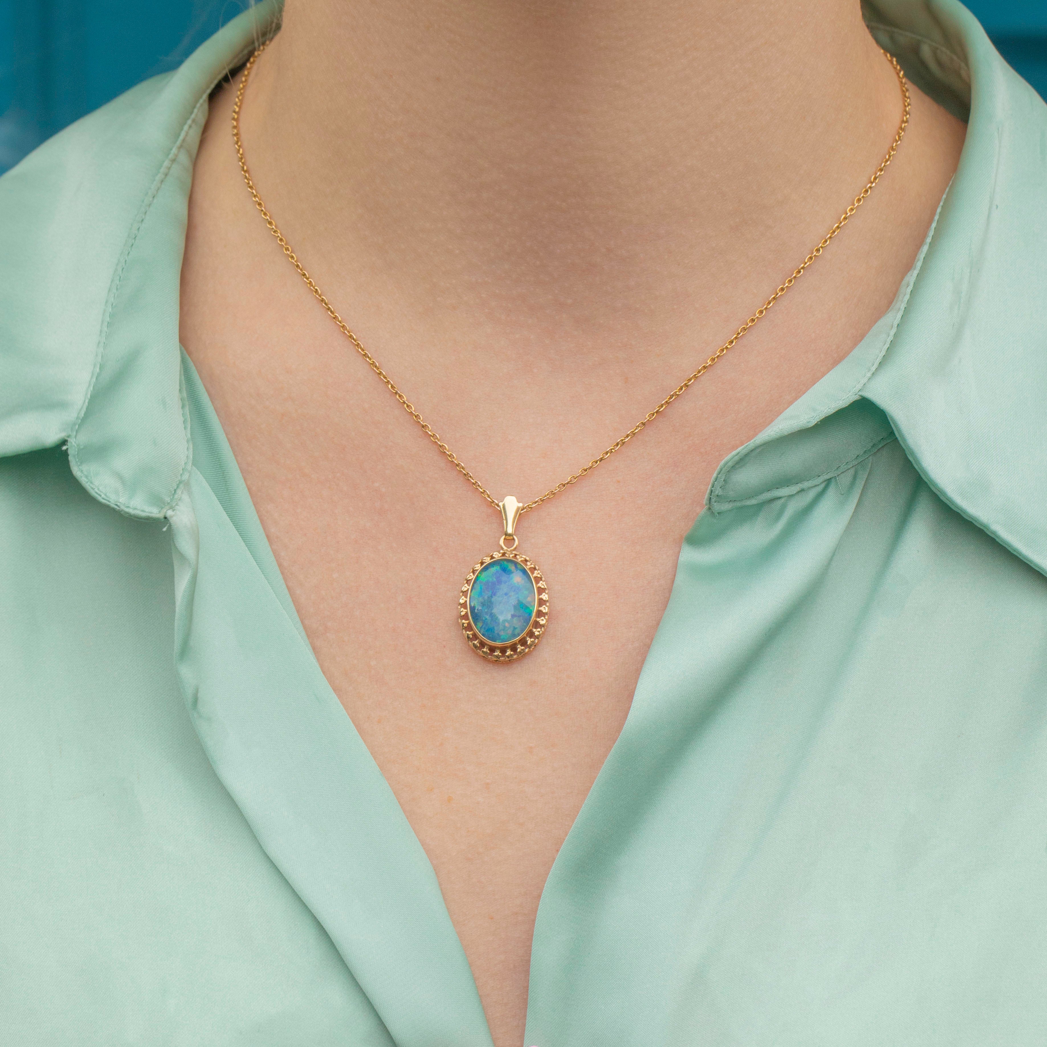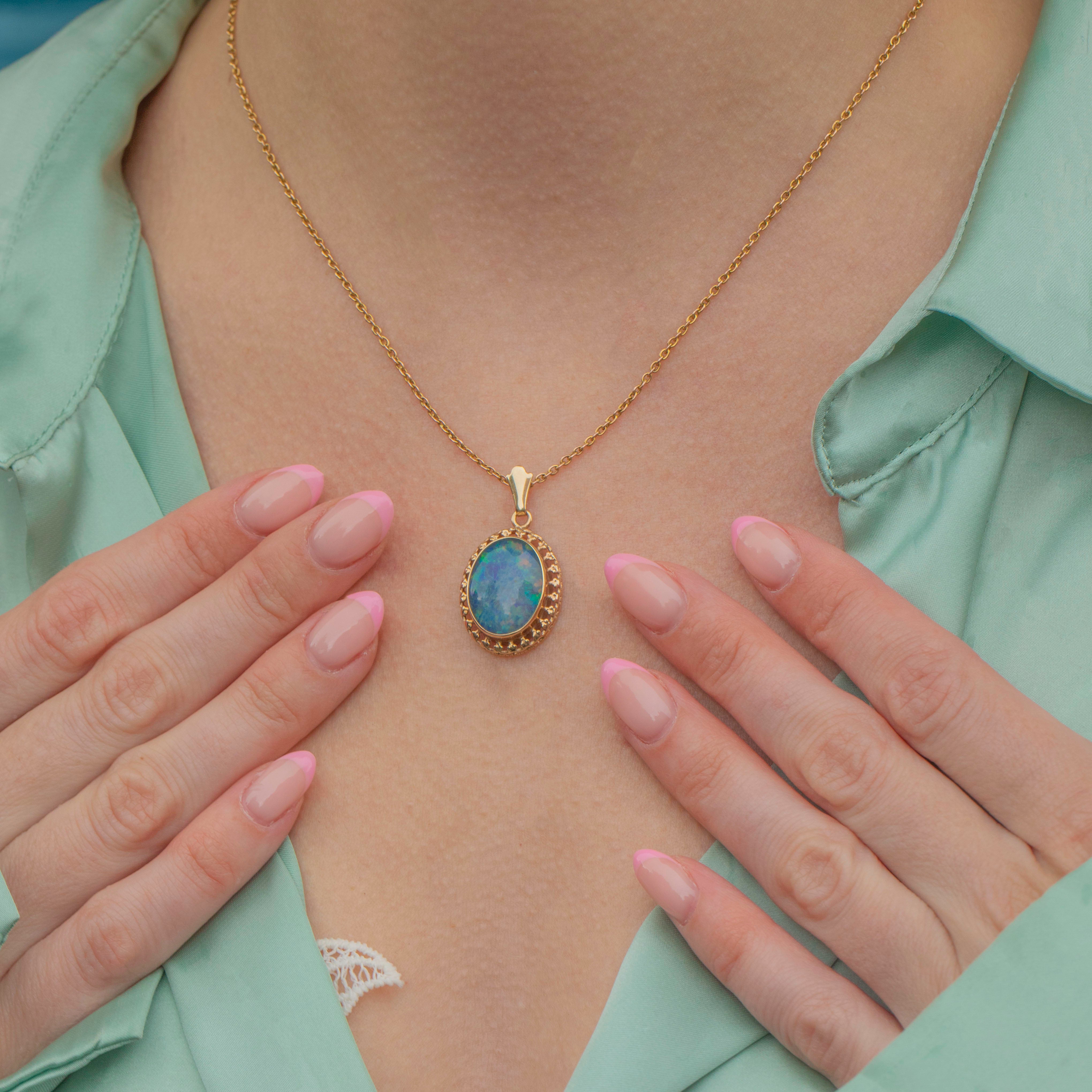 EXCELLENT This 14ct Gold Opal doublet pendant is in fantastic condition. The Opal doublet is exquisite, a sought after vivid hue that is simply mesmerising! Just slip a fine pendant chain through the jump ring and you are ready to take on the day!